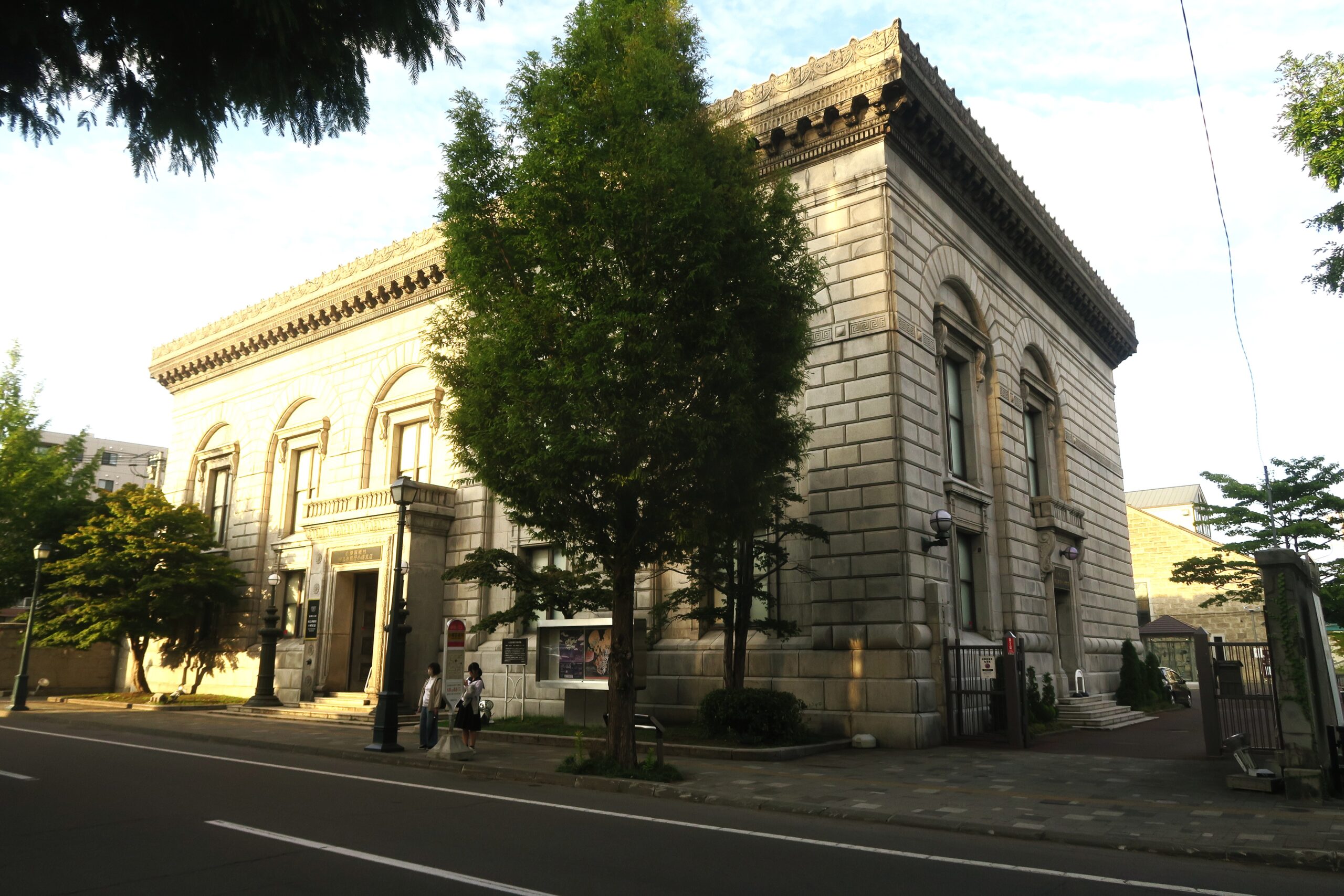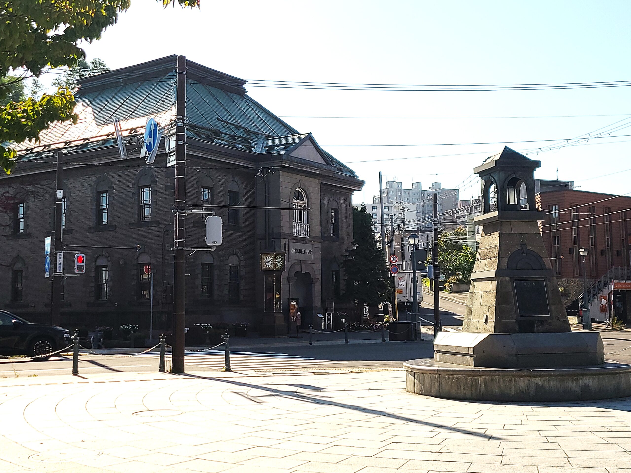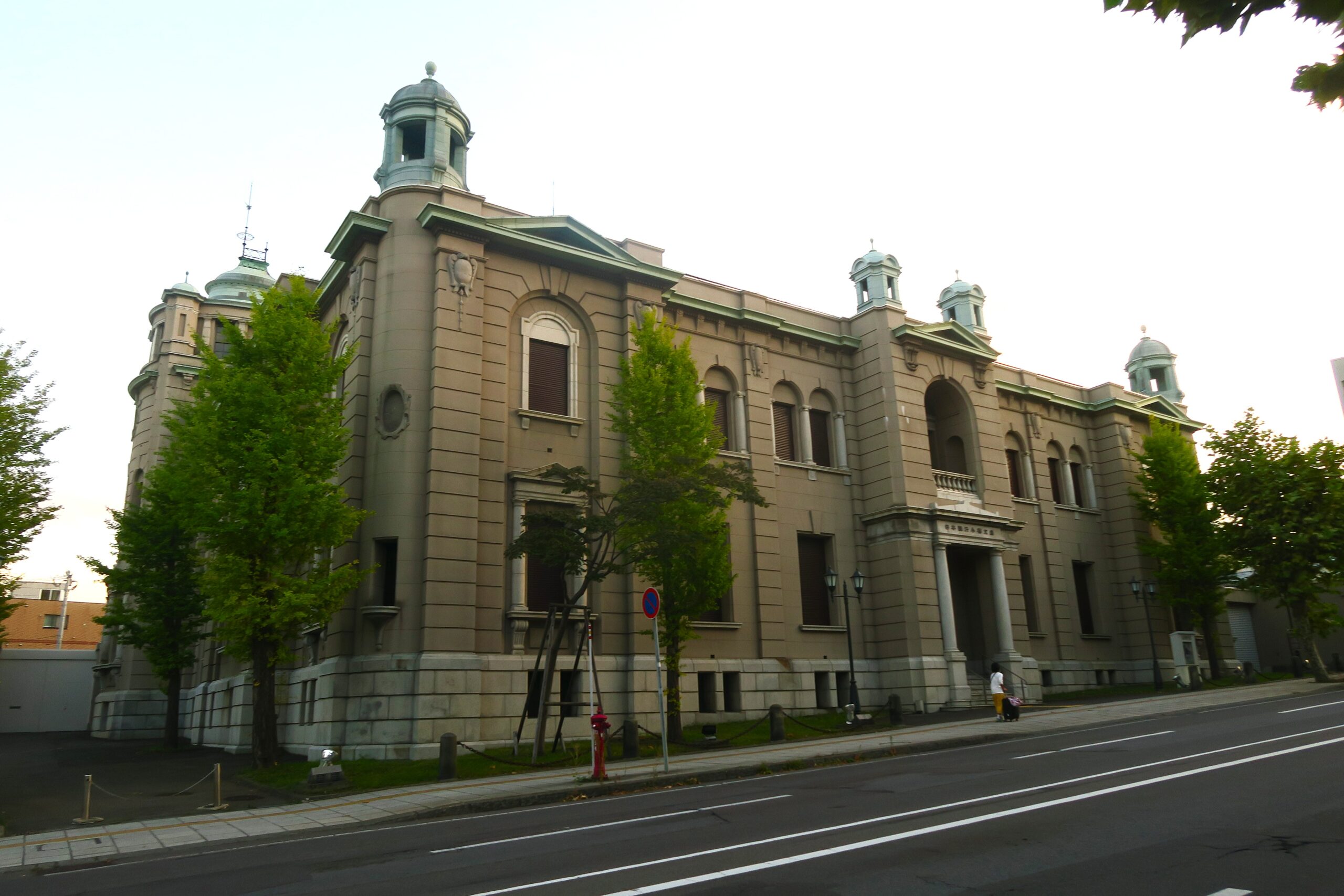 この辺りから観光スポットである歴史建造物群が点在します。小樽は明治から昭和初期にかけて、ニシン漁や貿易などで栄え、明治の北海道開拓を支える港湾として発展し、昭和初期には北海道経済の中核を担いました。中でも金融機関が軒を連ねた色内地区は「北のウゥール街」とまで呼ばれ繁栄を極めたといいます。その名残で町の中では今でもそこかしこに歴史ある建物を目にすることができ往時の面影を今に伝えています。明治45年(1912)築のルネサンス様式荘厳な建物は、現在金融資料館として、日本銀行の歴史や金融の仕組みを分かりやすく紹介している「日本銀行旧小樽支店 」です。東京駅などを手がけた建築家・辰野金吾とその弟子長野宇平次・岡田信一郎の設計で、かつて小樽が北海道経済の中心だったことを物語る名建築です。外観は煉瓦造り2階建てですが、表面はモルタルを塗り、石造り風に仕上げています。北側の正面には4つのドームが、側面の南東の角には小樽港を眺望する4階建ての望楼が配置されています。