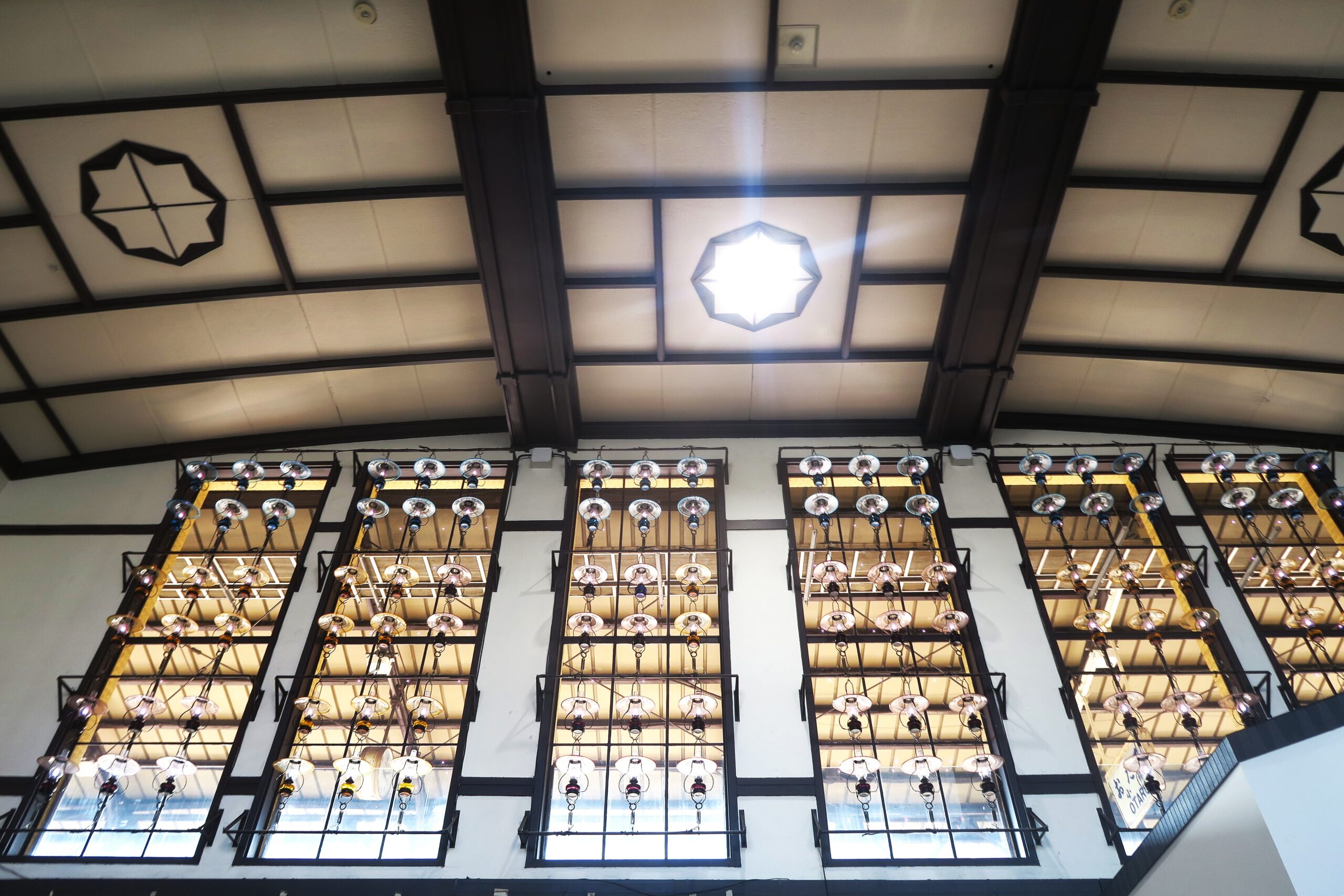 駅構内やホームには333個の「小樽ランプ」が飾られています。写真は平成10年(1998)の駅舎改修の際に取り付けられた、北一硝子が寄贈したものです。