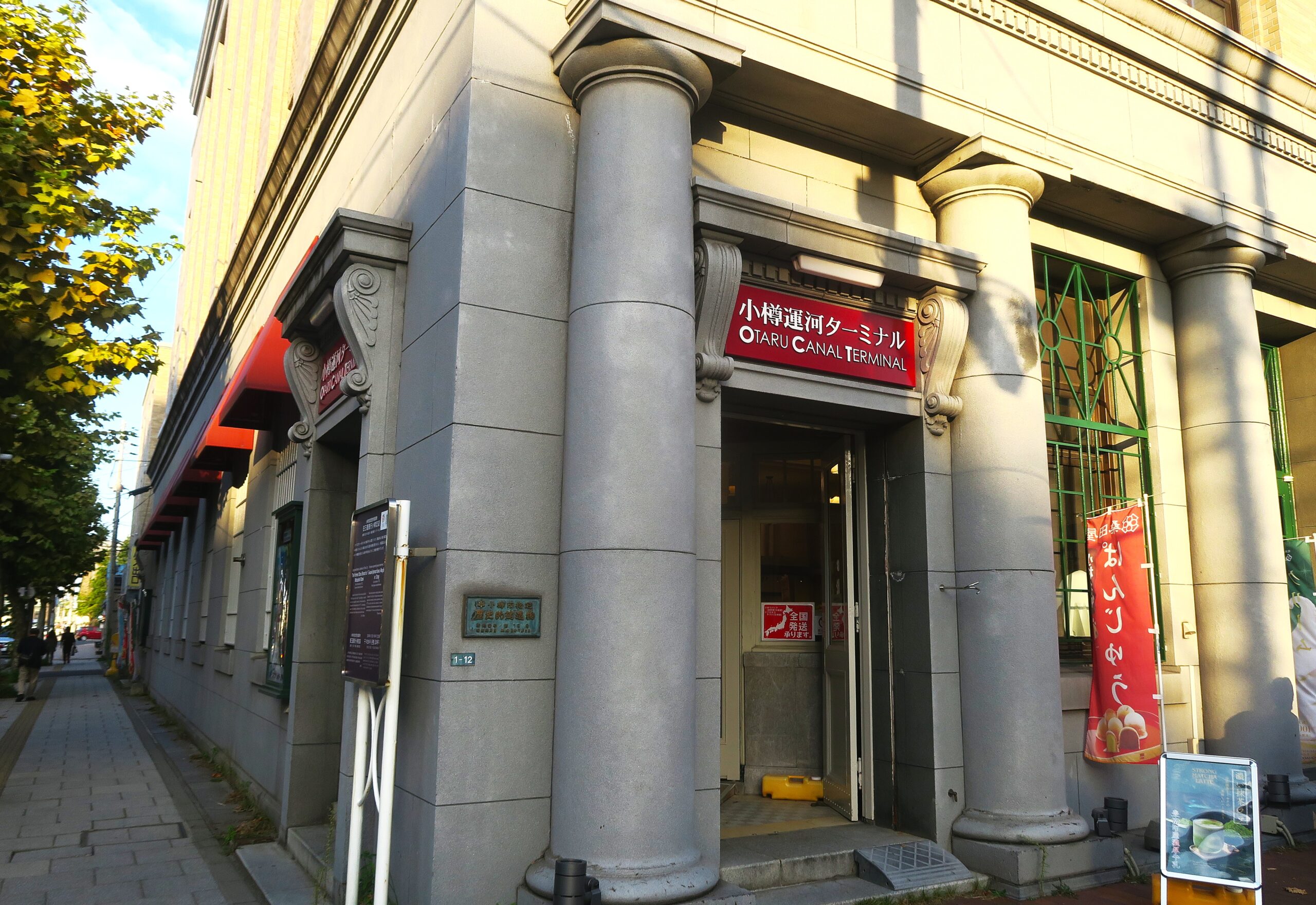 かつて三菱銀行小樽支店として大正11年(1922)に建てられた建物を利用した小樽運河ターミナルは、バスターミナルも兼ねたおみゃげショップ。建築当初は、外壁に煉瓦色のタイルが貼られていましたが、昭和12年(1937)に現在の色調に変更さてました。1階正面には、ギリシャ・ローマ建築様式を表すように6本の半円柱が並んでいて、柱と柱の間にはクラシカルな窓がはめられていて、この建築を特徴づけています。