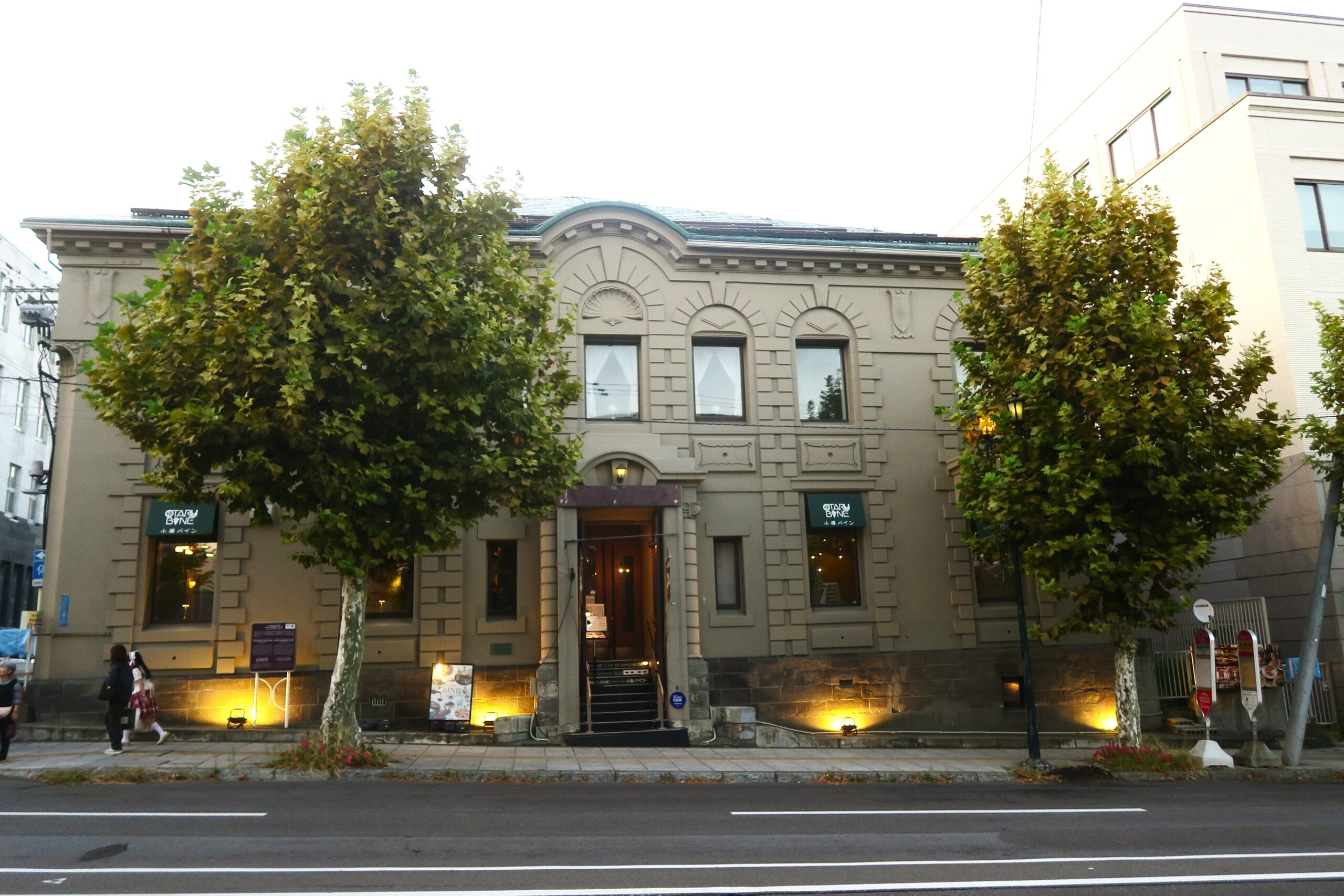 通りをはさんで建つ明治45年(1912)建築の歴史的建造物「旧北海道銀行本店」は、日本銀行小樽支店の設計にも携わった長野宇平次の設計で、請け負ったのは地元の加藤忠五郎でした。地下1階地上2階建ての石造り亜鉛葺きの建物は、ルネッサンス様式で銀行建築独特の重厚さを持ち、玄関や窓まわりの石組みのデザイン、コーナー部分や窓の間隔の変化などに特徴があります。ファサード(正面)の左角は丸くえぐったデザインになっています。重厚感漂う店内で地元ブランドの「北海道ワイン」を中心に、100種以上のもの道産ワインを取り扱うショップ&カフェが小樽バインです。店名はワイン(WINE)と現在は北海道中央バス(株)の社屋の一角にあること(BANK BUS)に因んでいます。歴史の重みを感じる銀行当時の石壁が残る落ち着いた雰囲気の店内で贅沢な時が過ごせます。