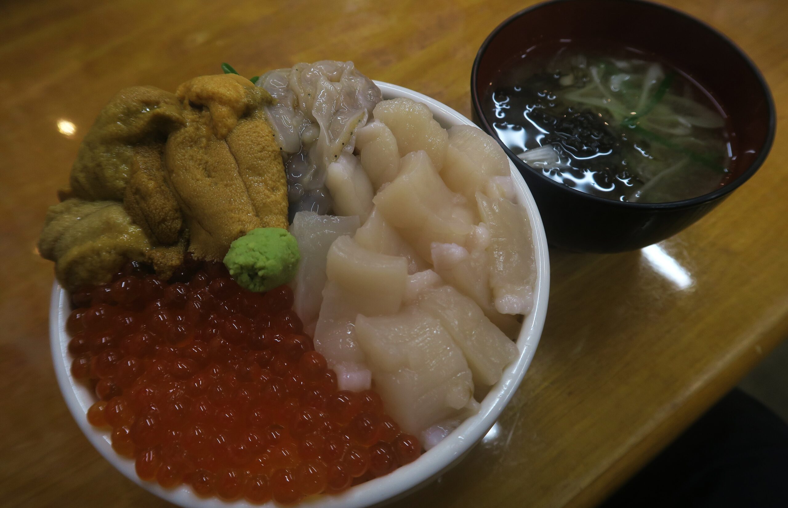 小樽、北海道産の鮮度のよいネタをそろえる鮮魚店直営の店。①自家製イクラ②生ウニ③かに④本まぐろ⑤ぼたんえび⑥あまえび⑦サーモン⑧活ほたて⑨とびっこ⑩季節ネタの中から好きなネタを3~4品選べる「わがまま丼」をご飯小盛で注文。自家製イクラに活ホタテ、生ウニの3品をチョイス。
