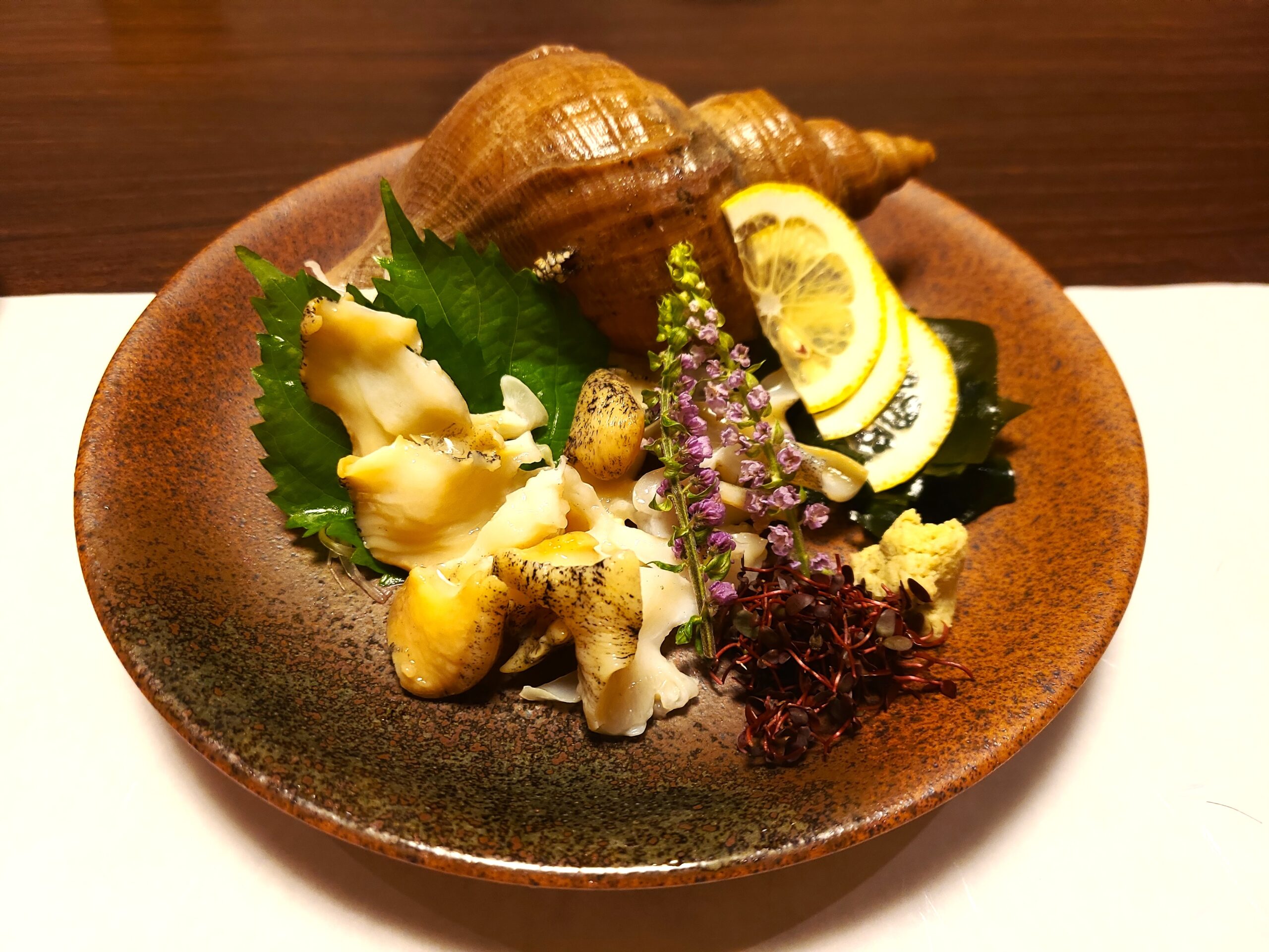 この時期のツブ貝を塩でいただきます。コリコリとした歯ごたえがありながら、やわらかさも兼ね備え、ほのかな甘みがあります。
