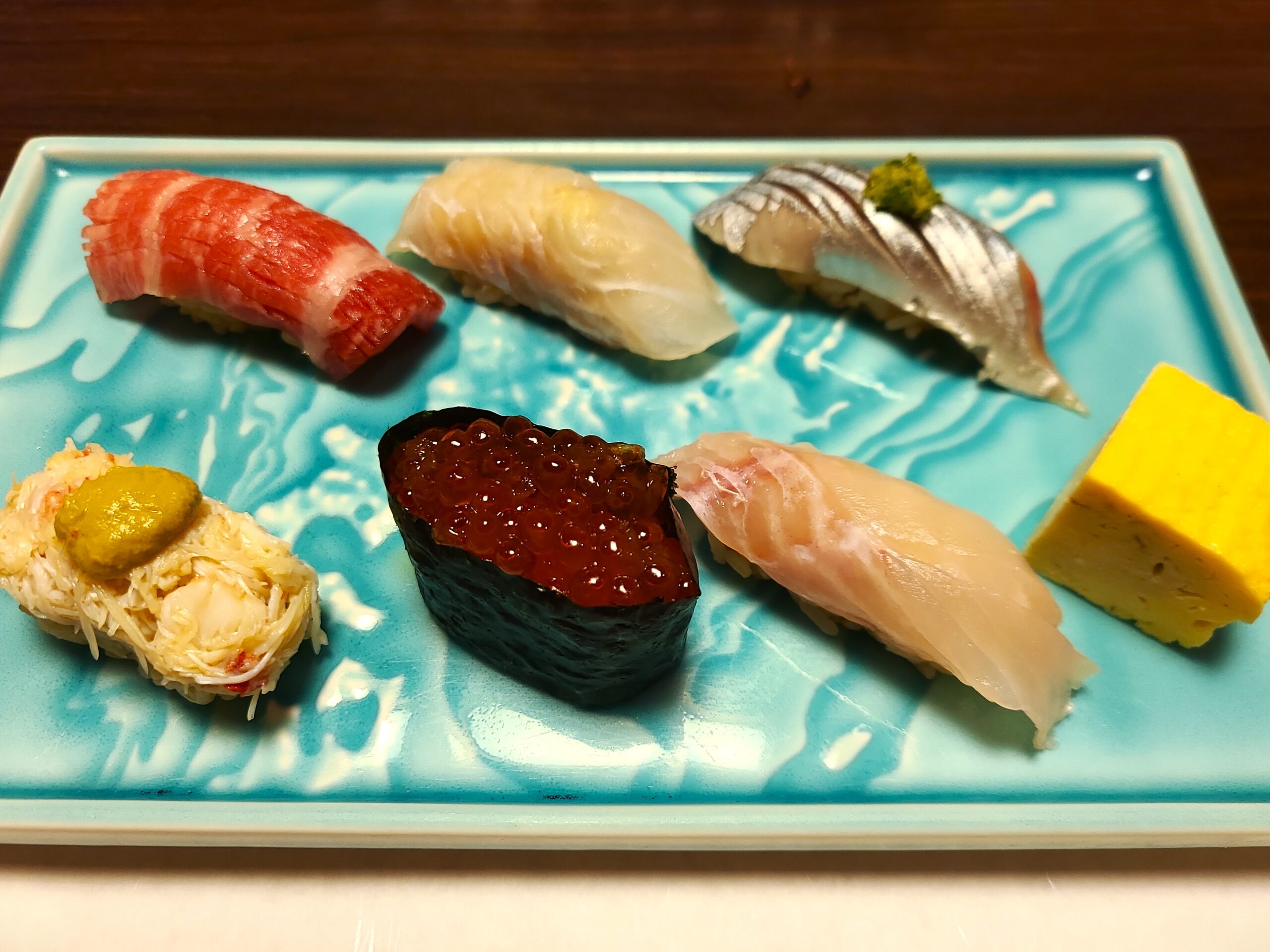 海峡鮪の大トロ、ヒラメの昆布〆、サンマ、花咲カニ味噌のせ、イクラの醤油漬け、ソイ、玉子