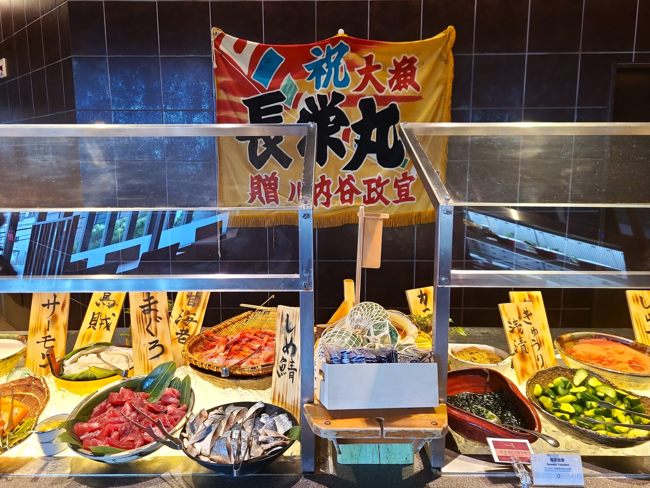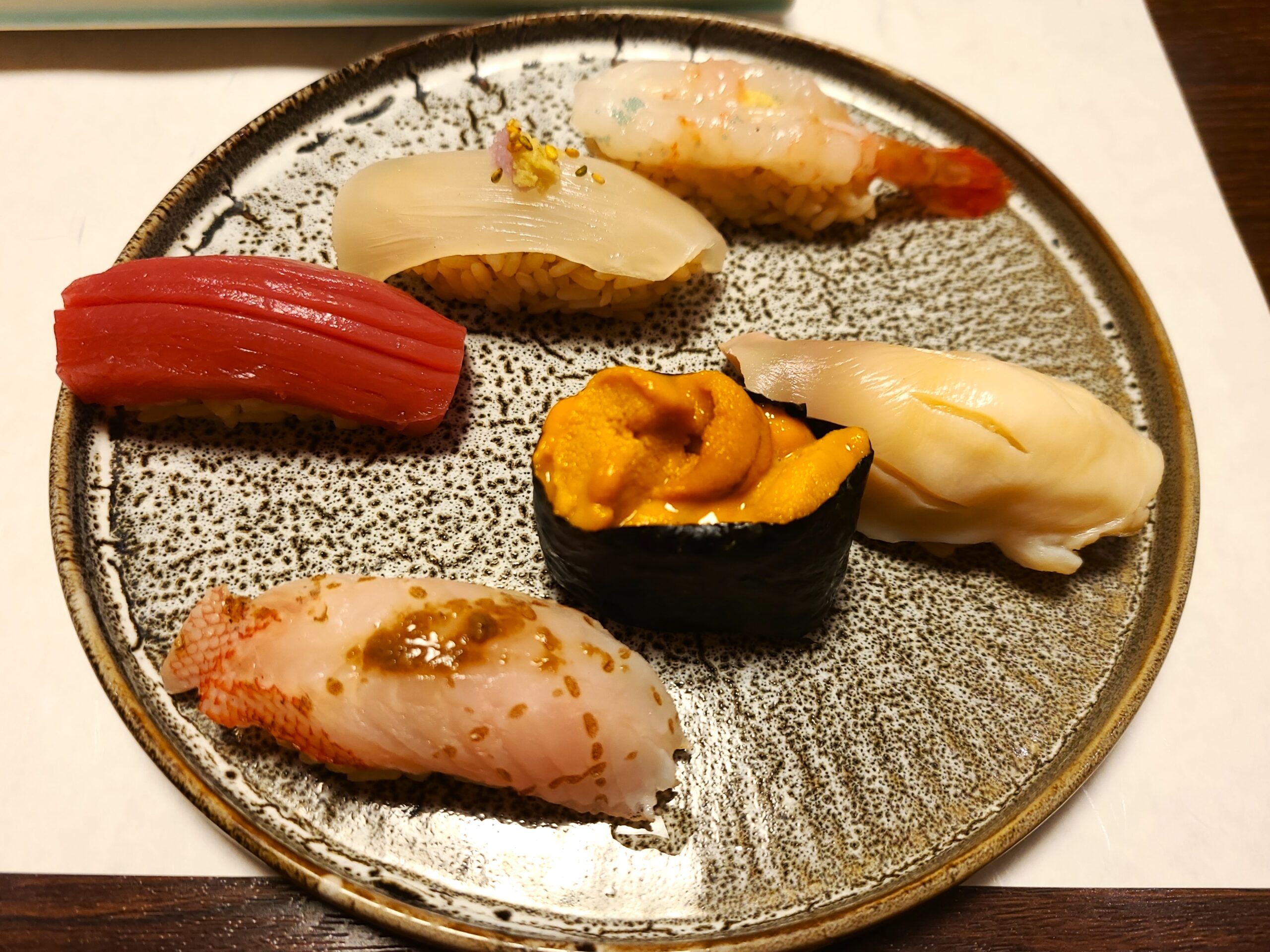 海峡鮪の赤身の平漬け、噴火湾のボタンエビ、北寄貝、生ウニ、真イカ、炙りキンキ肝のせ