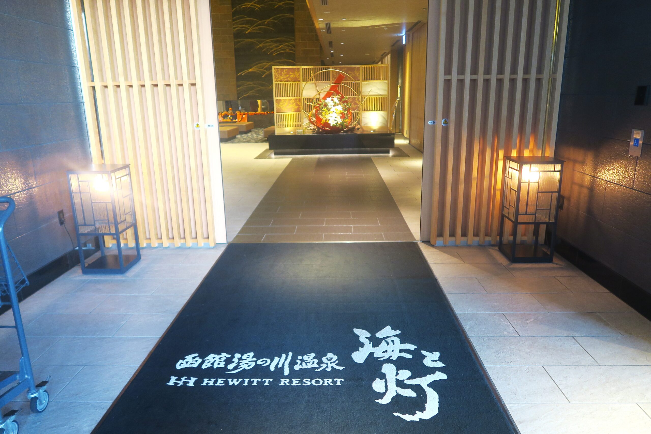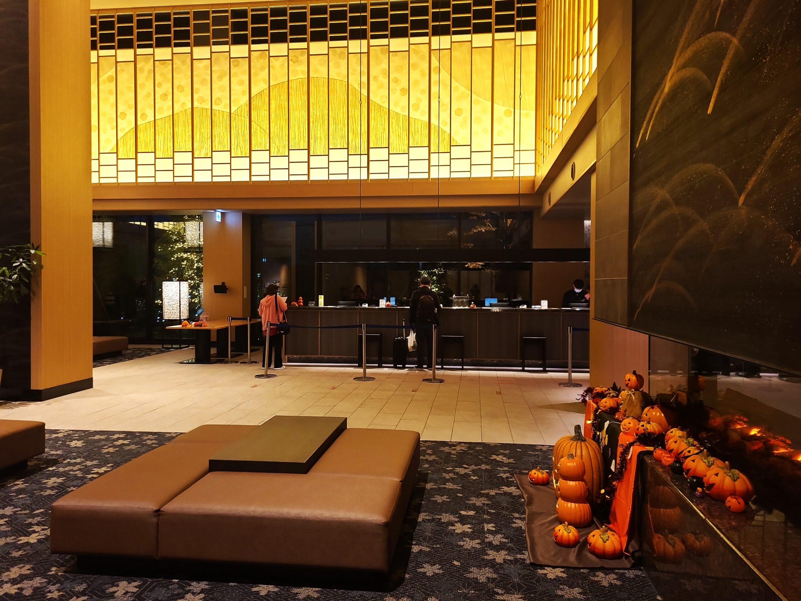 エントランスロビーは大きな吹き抜けで開放感たっぷり。組子細工や紙などのモチーフを用い、函館の雄大な自然と安らぎを融合させた高級旅館のような空間が出迎えてくれます。ロビーには漁火のようにも見て取れるイミテーション暖炉が灯り、木の温もりを感じるあたたかな空間には、国際的に活躍する書家・金澤洋子氏の作品も。