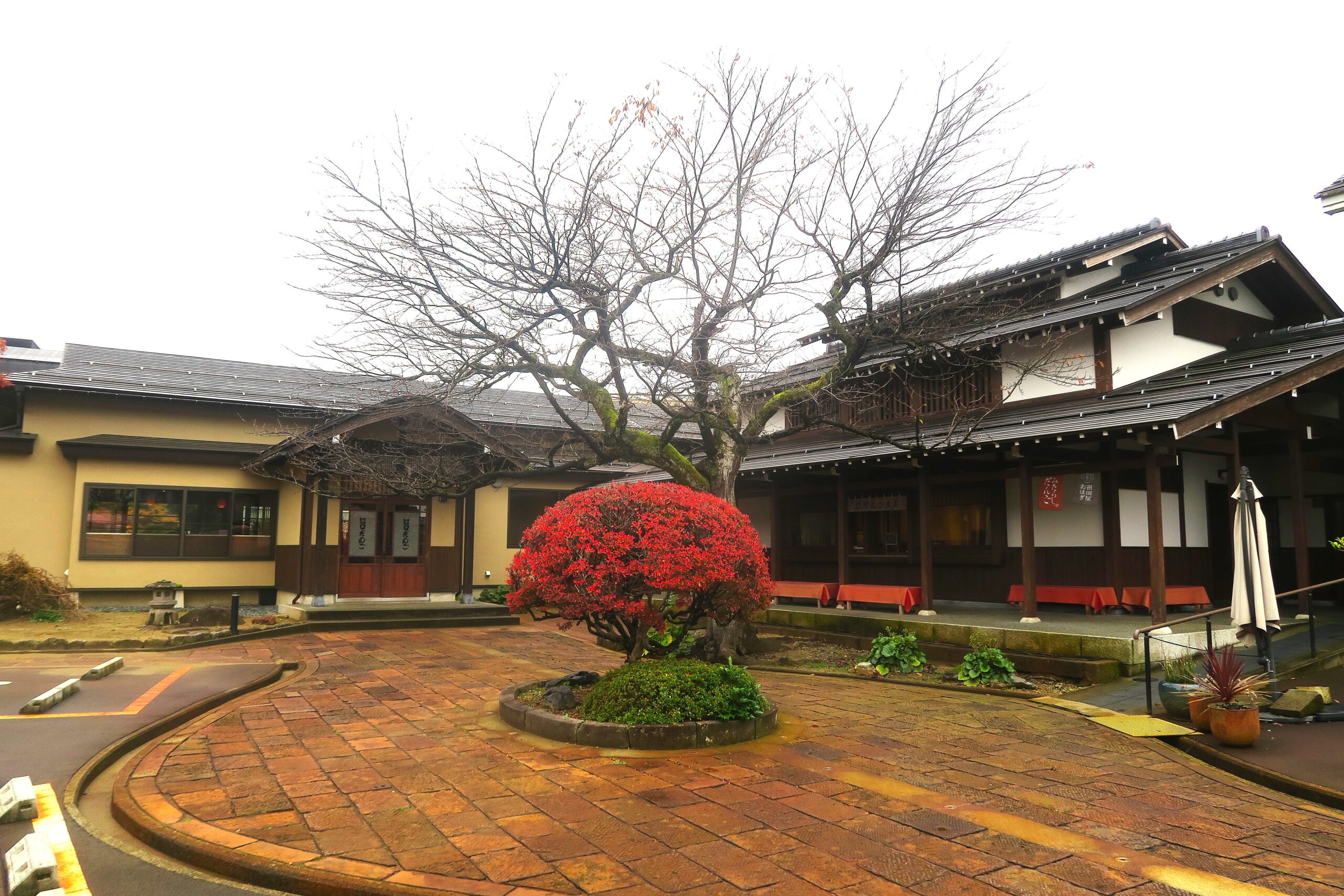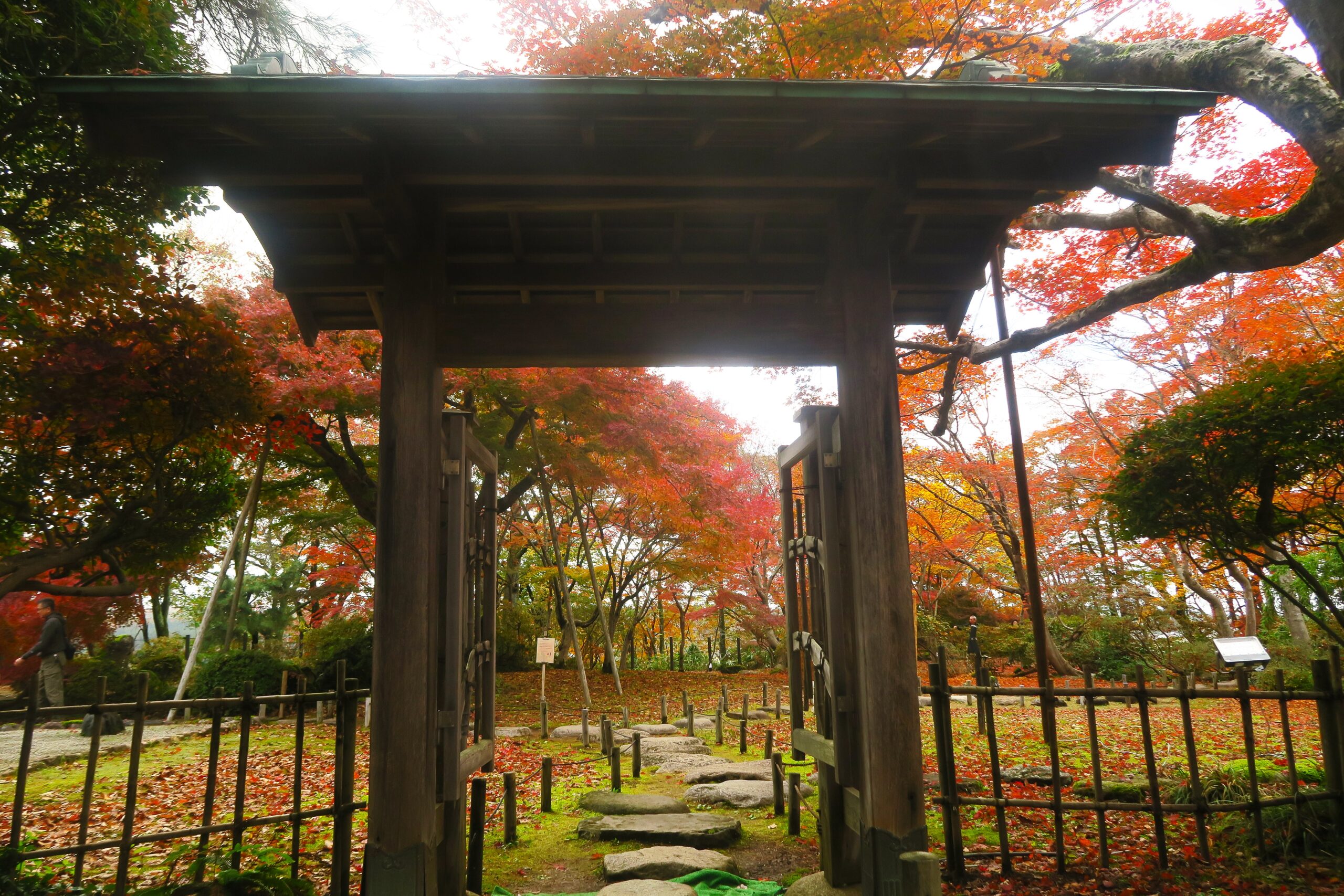園内の巴ヶ丘山荘は国の登録有形文化財になっています。写真は山荘への玄関口・庭門で、枯山水庭園があり、そこから飛び石をたどって池泉式回遊庭園を周遊する動線になっています。