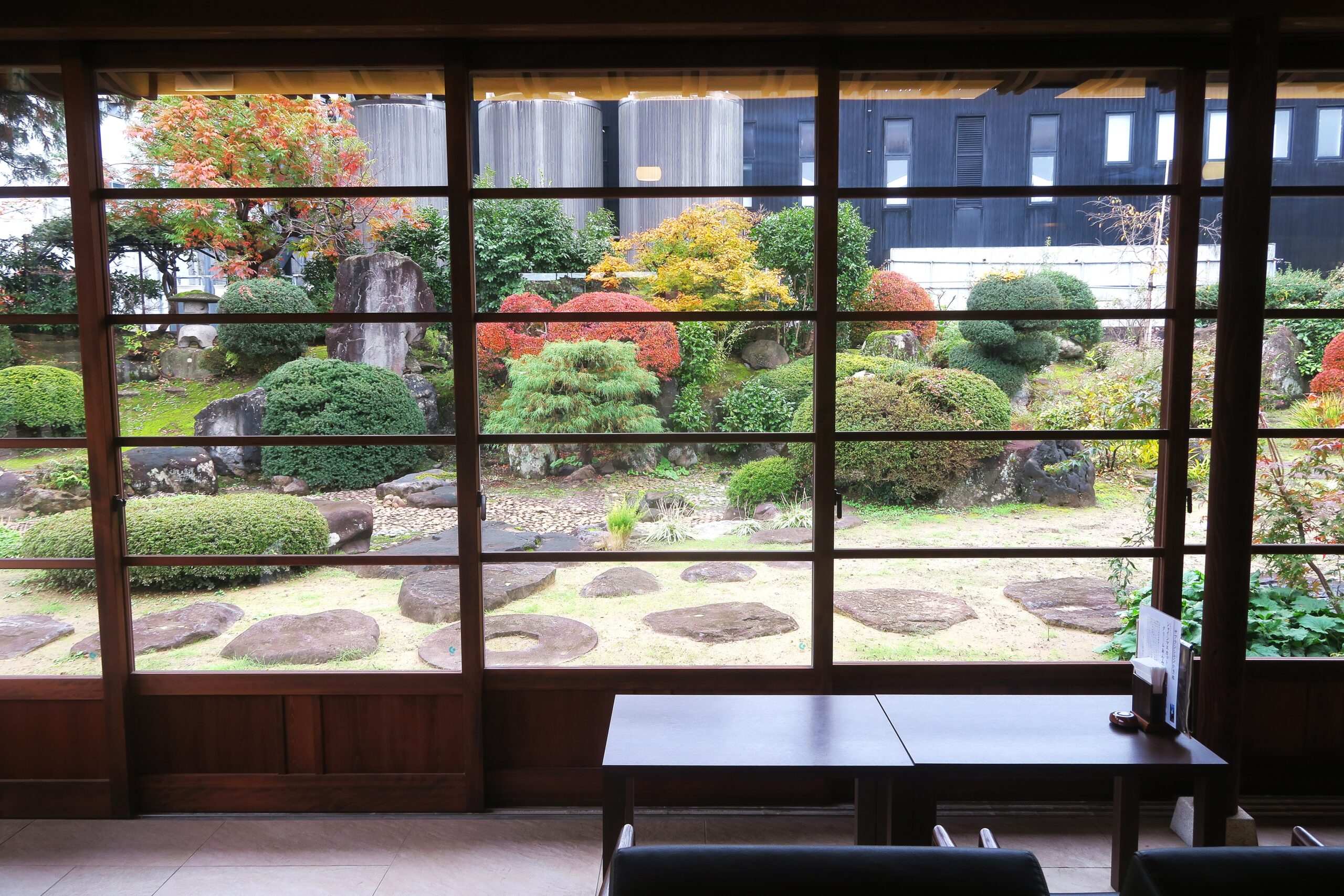 総ケヤキの数寄屋造りだったかつての日本家屋の面影を残しつつ、床をフローリングにするなど店舗として必要な改築を施しています。かつて迎賓の場としても使われていたことから、店内から見える庭園も屋敷を訪ねてきた人たちをもてなすため、見事な造りになっています。そんなお庭の景色がよく見えるように大きな窓をパノラマ状に設えられ、庇を伸ばして庭に近い部分にもカフェコーナーを設けています。こちらにお客様が入っても店内からの景観に影響がないよう、一段低く造られています。