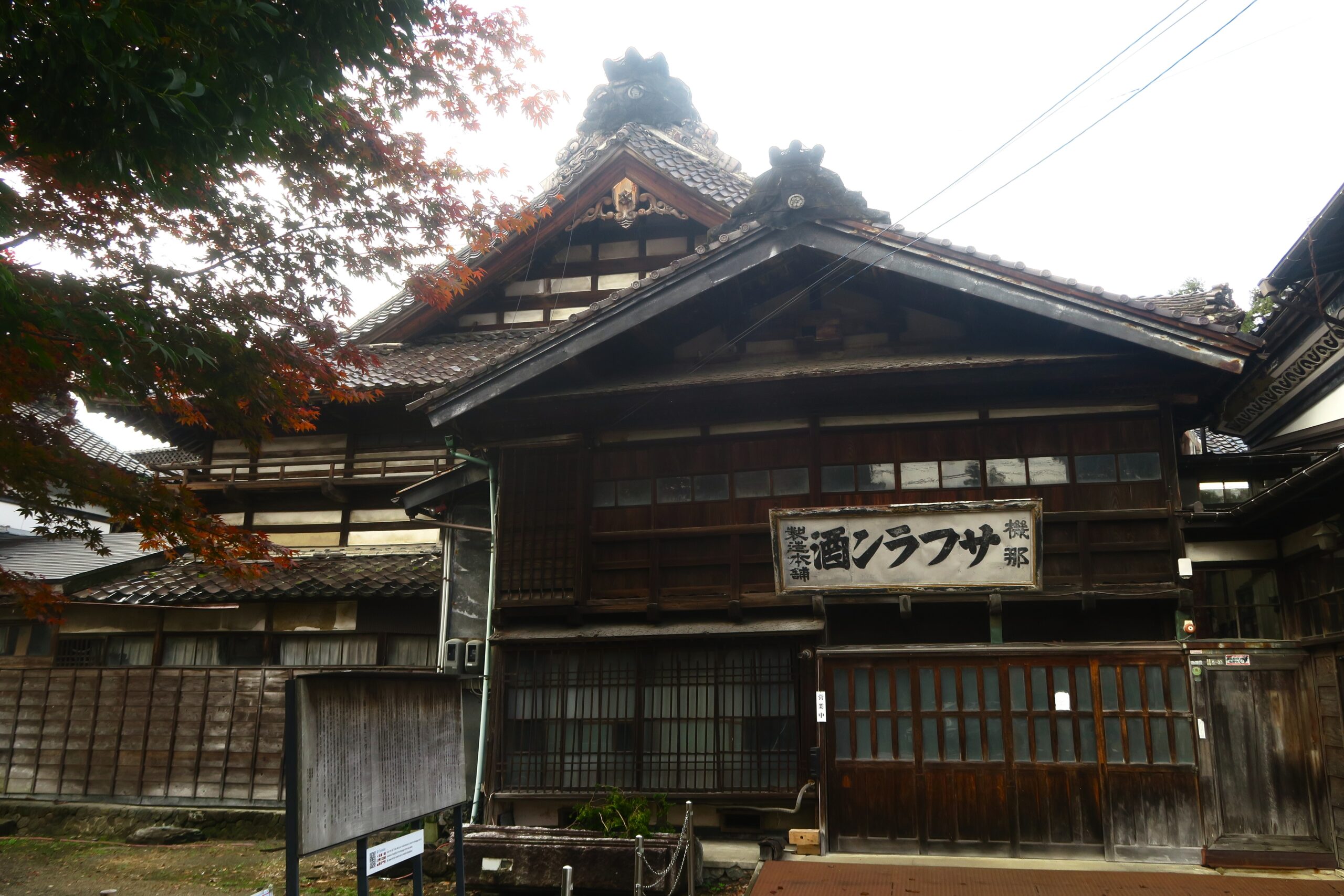 県道に出て、南に向かって歩くと摂田屋に来たら必見なのが機那サフラン酒本舗の鏝絵蔵です。建築主は21歳でサフランやケイヒなどを用い、明治時代に一世を風靡した薬用酒・機那サフラン酒を考案して財を成した豪商、吉澤仁太郎で、現在の地、約3000坪の敷地内に明治27年(1894)店を構え、その32年後には、贅の限りを尽くて建てたなまこ壁の鏝絵蔵を建築しました。土蔵以外にも、敷地内には古い建物がならんでいて、写真の一番古い母屋は明治27年に建てられたものです。