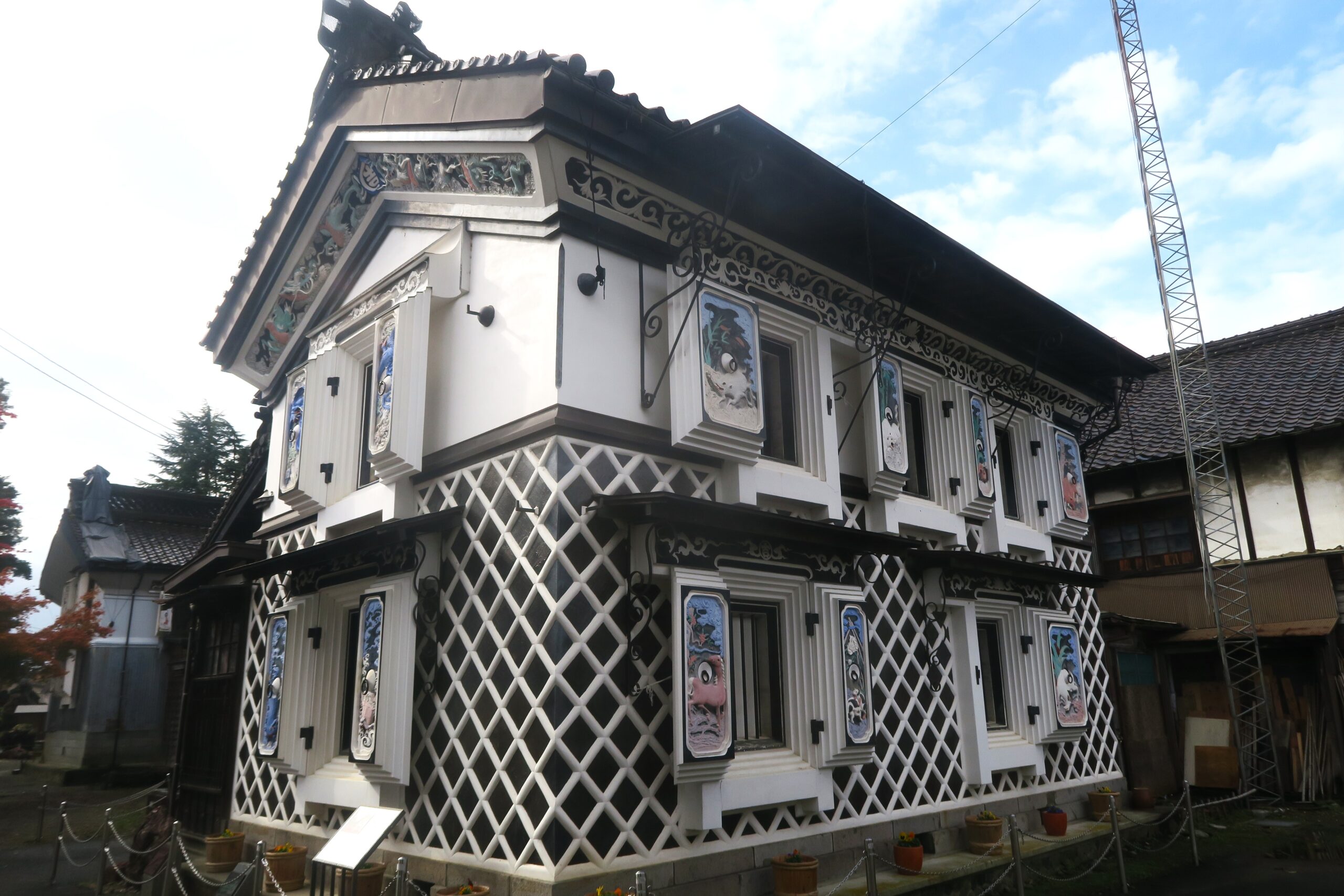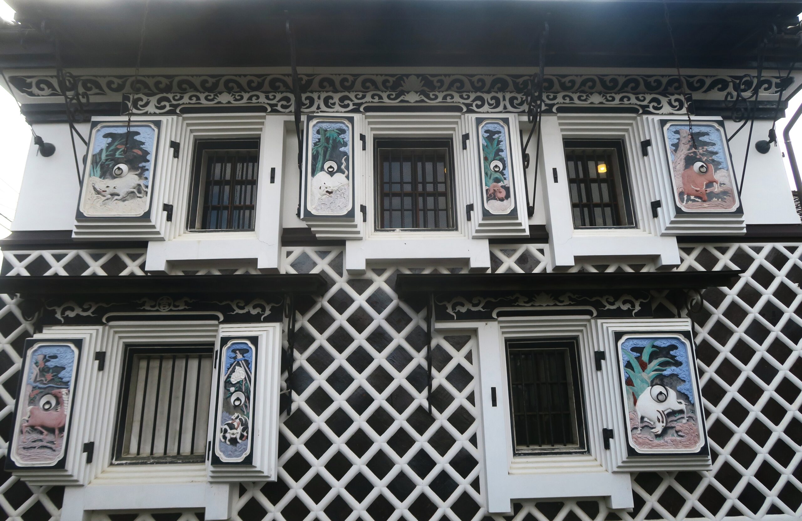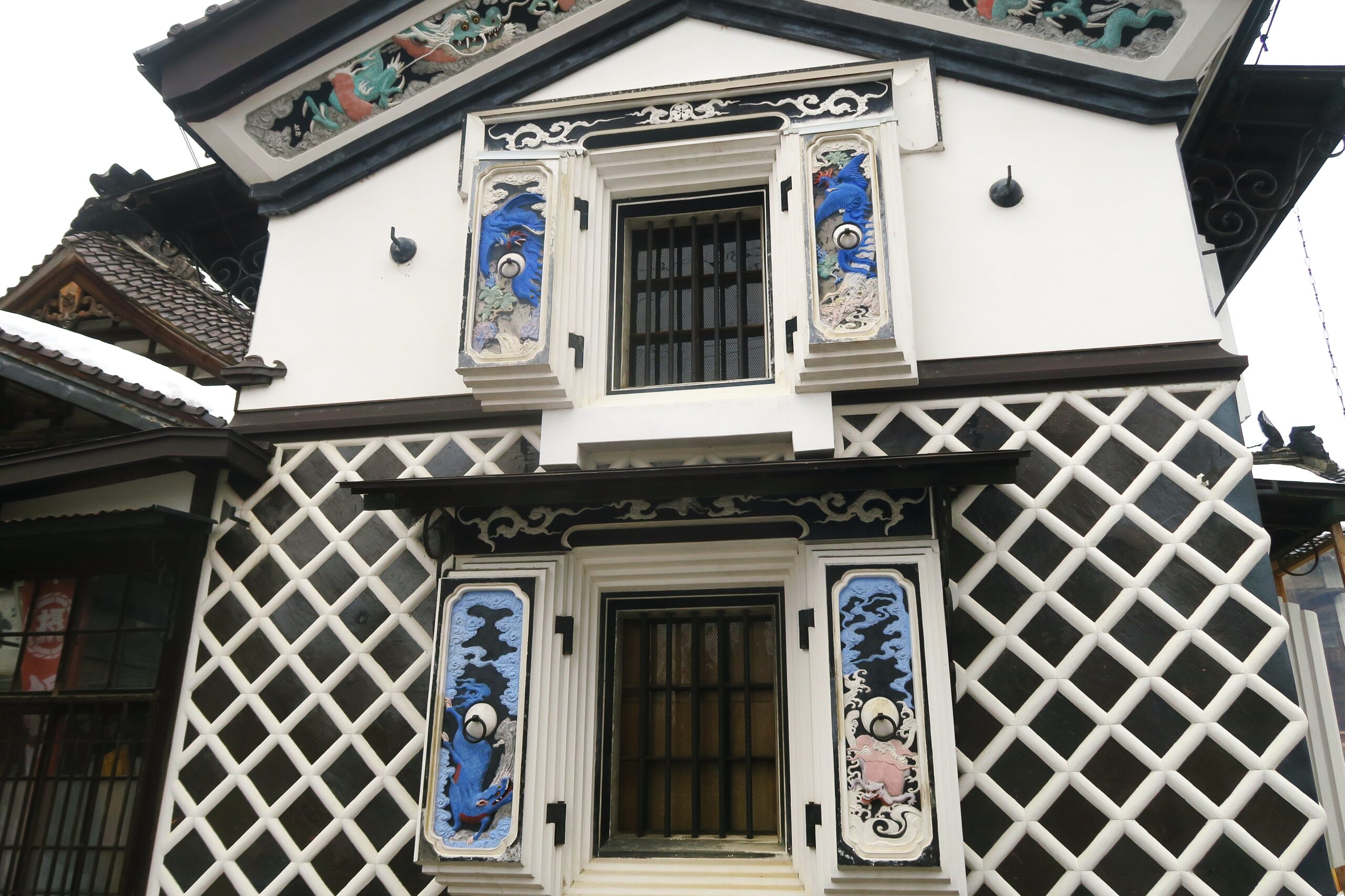 東洋のフレスコ画とも呼ばれるこの蔵の鏝絵の特徴としては、まず、大きいことで、鏝絵は普通建物の一部に点景として描かれるが、ここでは壁から軒から戸袋まで全部鏝絵です。これほど全面展開した例は他にないのでは。二つ目は、絵が大振りで、色彩が鮮やかにして多彩なこと。そして3つ目が一階部分のなまこ壁で、色は白と黒のコントラスト、パターンが斜め格子です。このような派手な建築仕上げは世界に例がない。