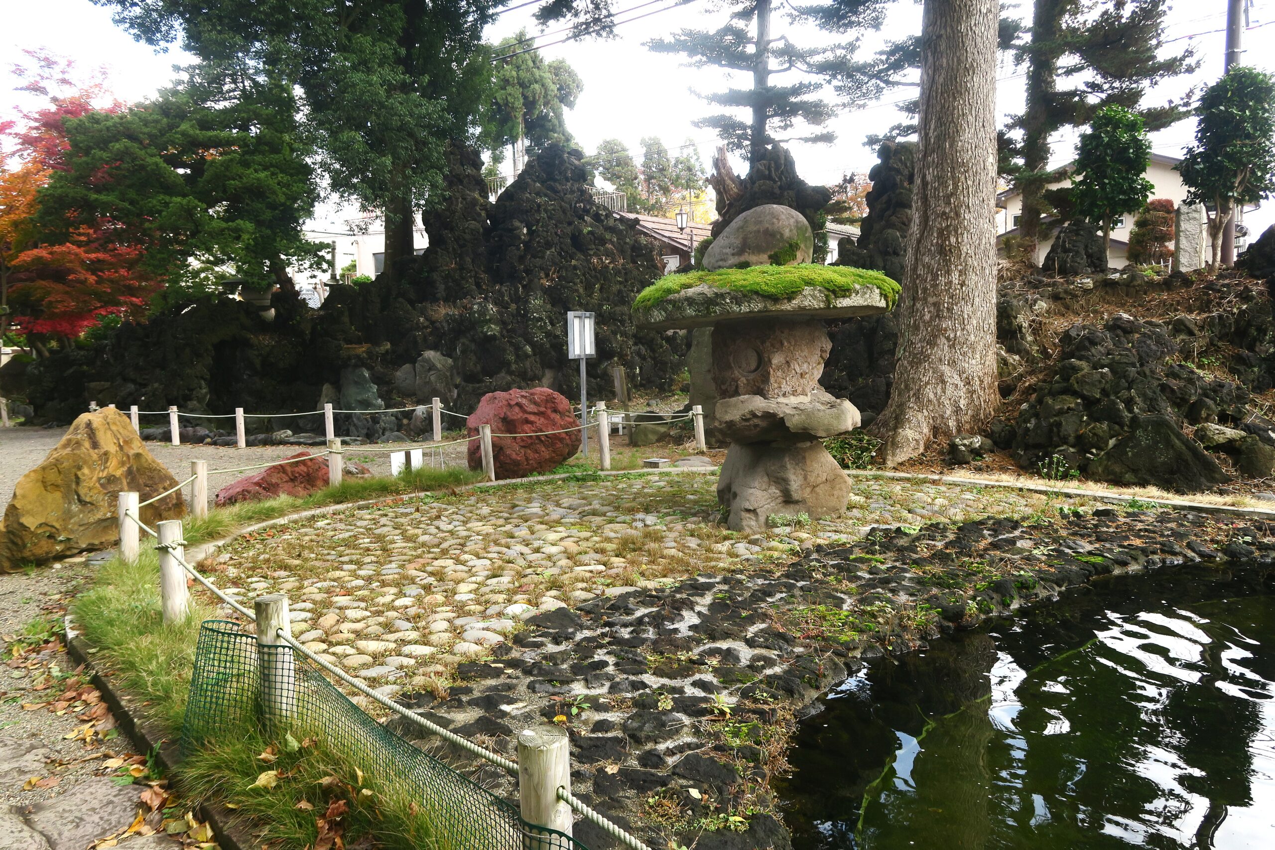 庭もじっくり見るとおもしろい。機那サフラン酒製造本舗の創業者、吉澤仁太郎が、奇想天外な発想で手間と資金を注ぎ込んで造った、少し風変りな庭園です。この庭園の東側には、浅間山・鬼押出から大量の溶岩を運び、積み上げた築山が連なっています。庭園内には、いたるところに佐渡島の赤石や黄石、糸魚川から取り寄せた翡翠の原石(姫川石)があったり、遠くは群馬県山波石、北海道の夕張石など、今では手に入りにくい石が配され、お宝がざきざく転がっています。また至るところに置かれた灯籠や石像のいくつかは、仁太郎が自ら造るり上げたものです、池は中央に溶岩の島が築かれ、そこには龍や鯉などの錬金が埋め込まれています。石のように見えても、よく見ると一部に彫刻が施されたりしていて驚かされます。