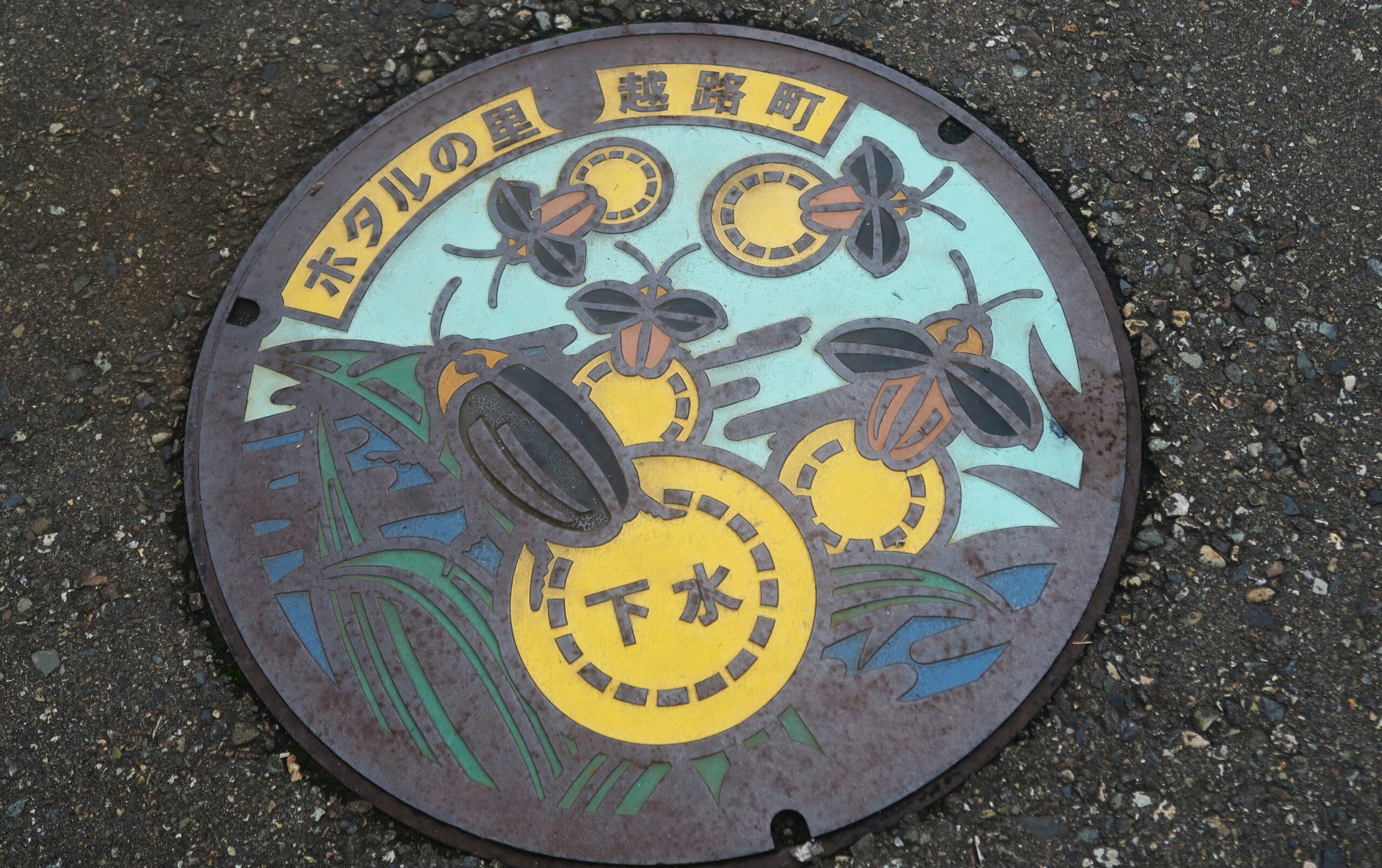 もみじ園に向かう来迎寺県道23号線付近で見つけた長岡市(旧越路町)のマンホールはホタルがデザインされています。越路地域はほたるの里7として環境省のふるさといきものの里100選に認定されています。