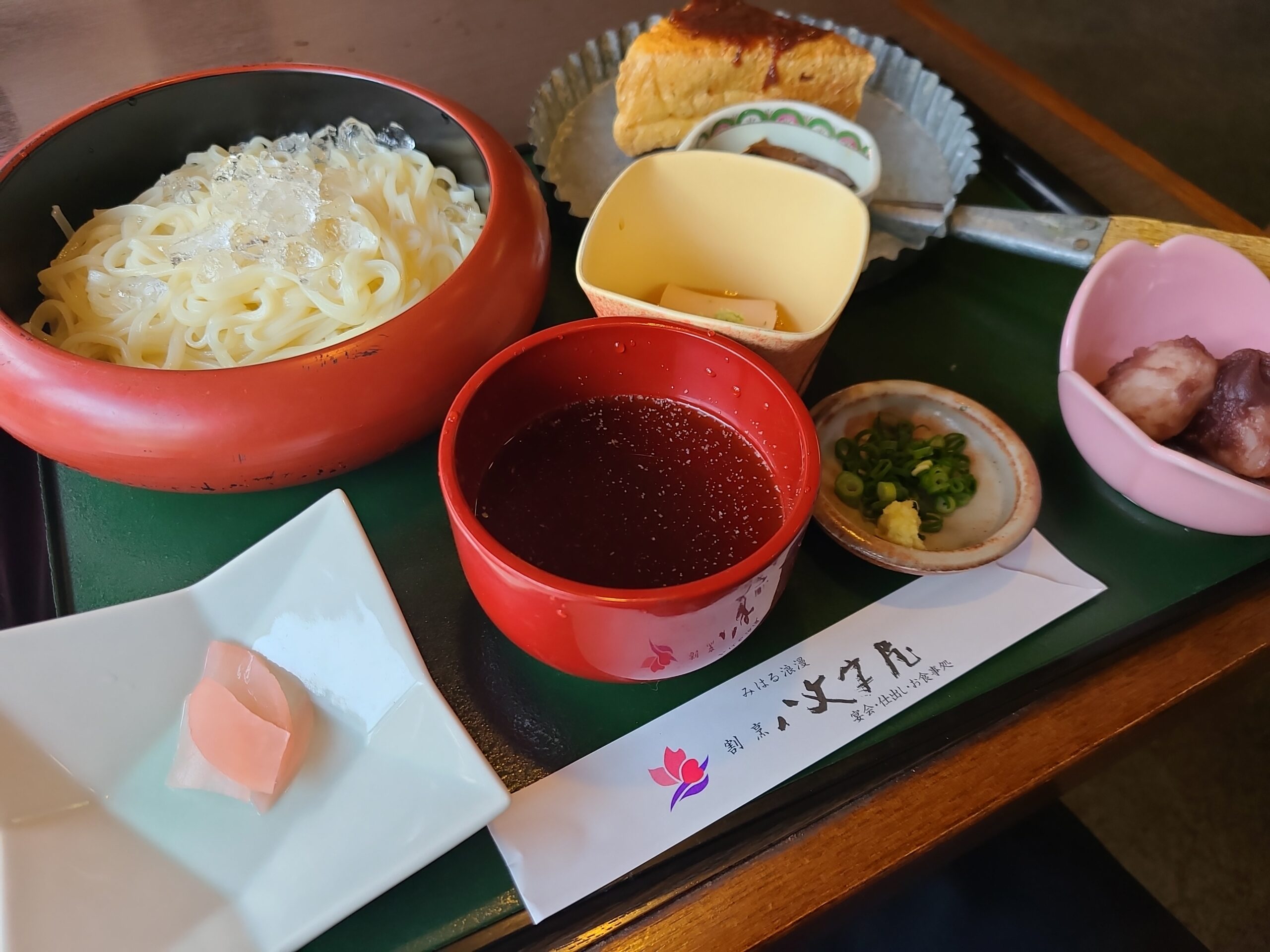町を東西に貫くメインストリート・おまつり道路に出て、昼食を町役場に近い「八文字屋 お食事処ほうろく亭」でとることに。三春庶民が使っていたブリキ製の煎り鍋「ほうろく」で焼くあつあつの「三角油揚ほうろく焼き」は、三春城の別称・鶴舞城に由来し、鶴が高く飛ぶ姿を模したもの。三春藩主が鷹狩りの際に食し賞賛した品で、ふきのとうの甘味噌が香ばしく精進料理の傑作です。江戸時代の百科事典『和漢三才図会』に「奥州三春より出づるものが細白にて美なり」と記載され、藩政時代には幕府献上品となっていた「三春素麺」を再現してセットにした三春御前が人気です。三春素麺は麺が平たくしっかりした歯応えがあります。