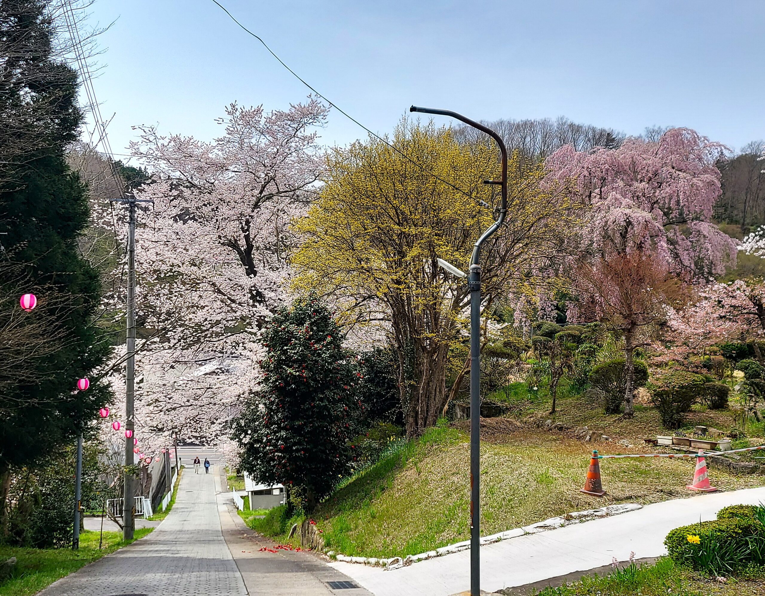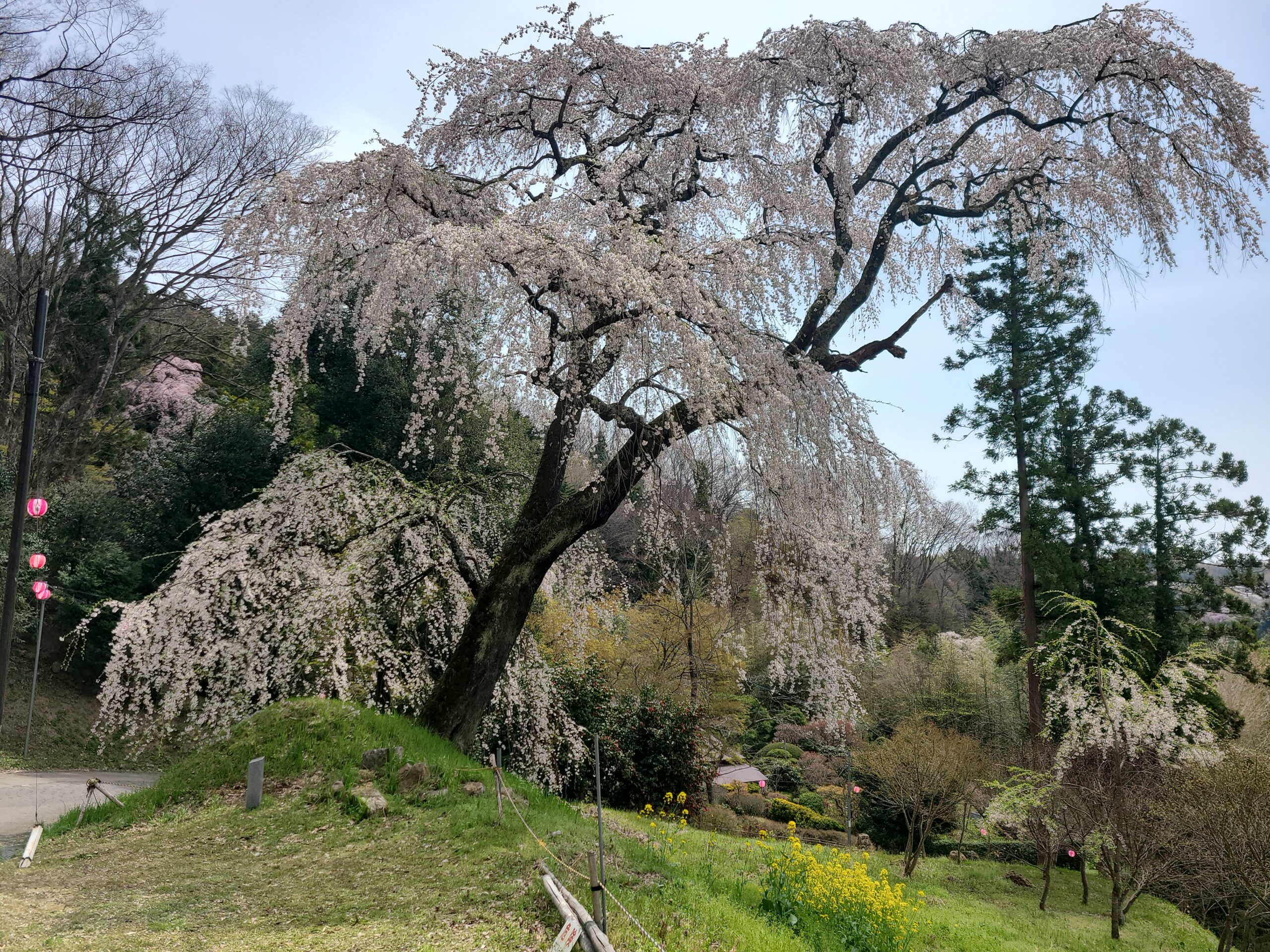 坂の途中、お城山中腹にある浪岡邸に咲く三本のシダレザクラ「お城坂枝垂桜」は幹回りが4mほどにもなる木もあり、樹高もあって圧倒されます。
