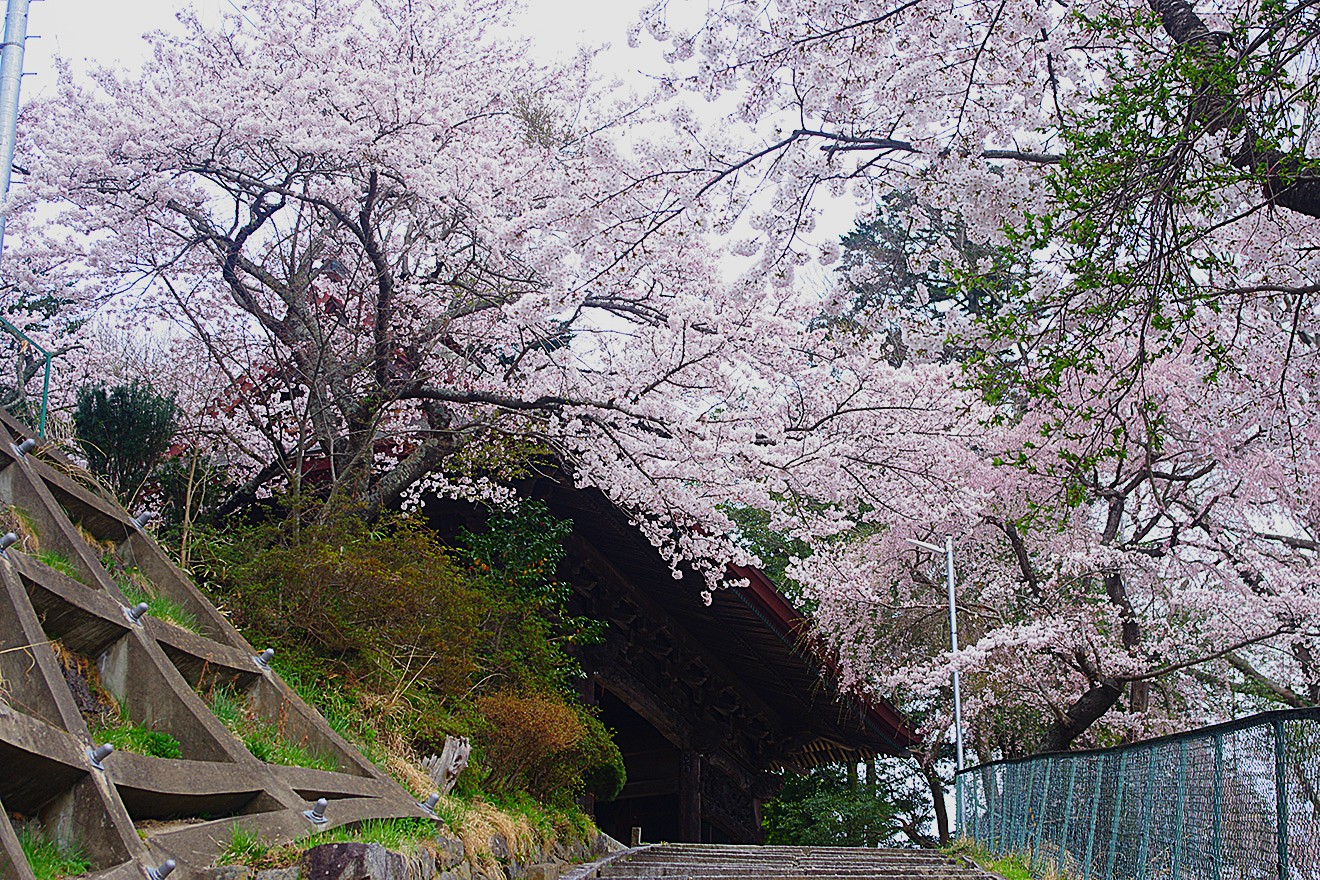境内の山門右方奥にある立派な枝垂れ桜が田村氏が植えたとされる樹齢約470年の福聚寺桜。長く枝垂れた枝に紅色の花が咲き誇る紅枝垂れ桜とソメイヨシノの2本のコントラストが特徴的で竹林の濃い緑を背景に桜が浮かび上がります。桜巡礼二番