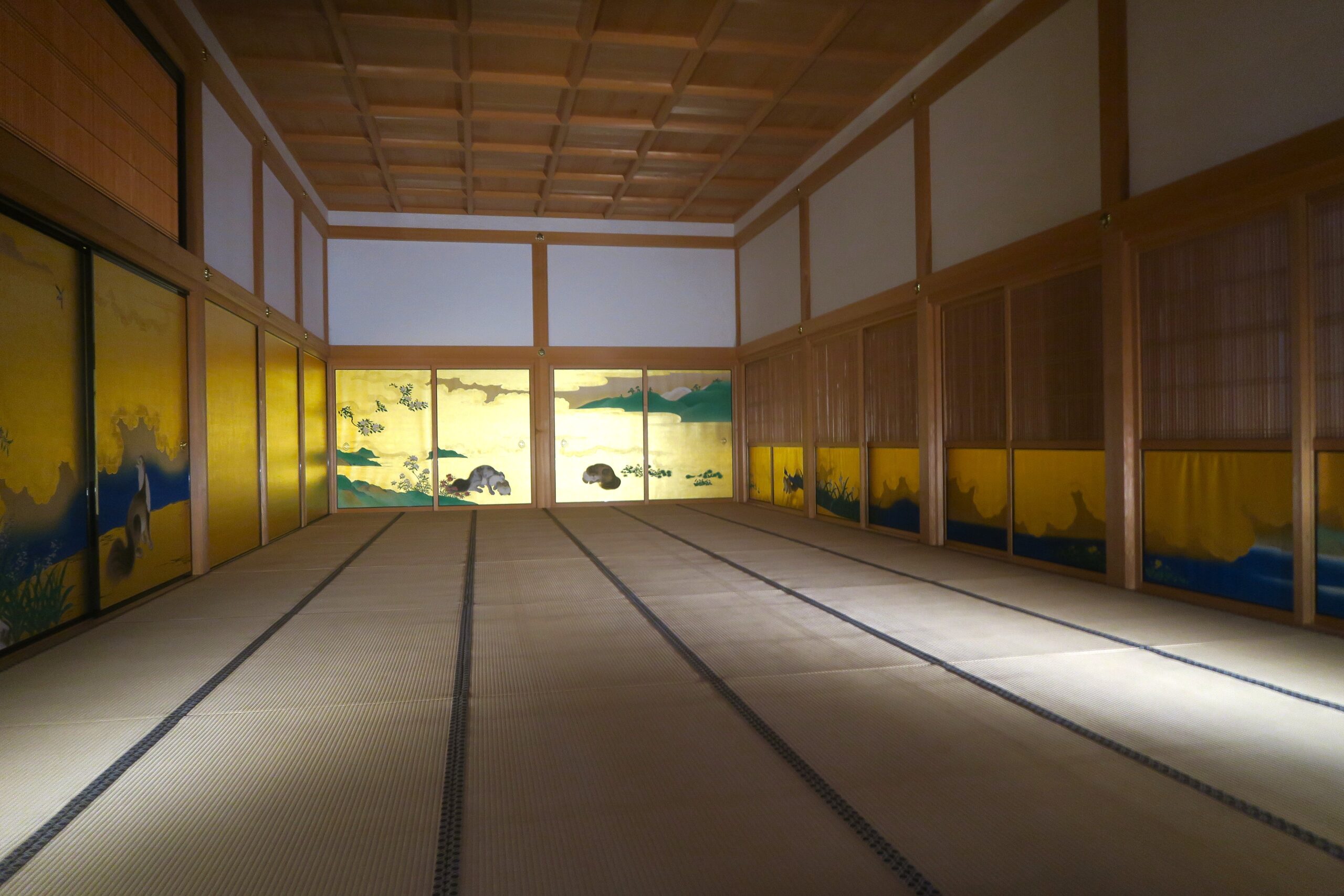 中に入ると廊下沿いに大小の広間が並び、それぞれに障壁画が描かれていて日本画の美術館のようです。将軍家の御用絵師として名を馳せた狩野貞信や狩野探幽ら狩野派の絵師によって、御殿の襖や天井板には異なる題材の絵が部屋ごとに描かれています。写真は表書院三之間でジャコウネコが描かれています。
