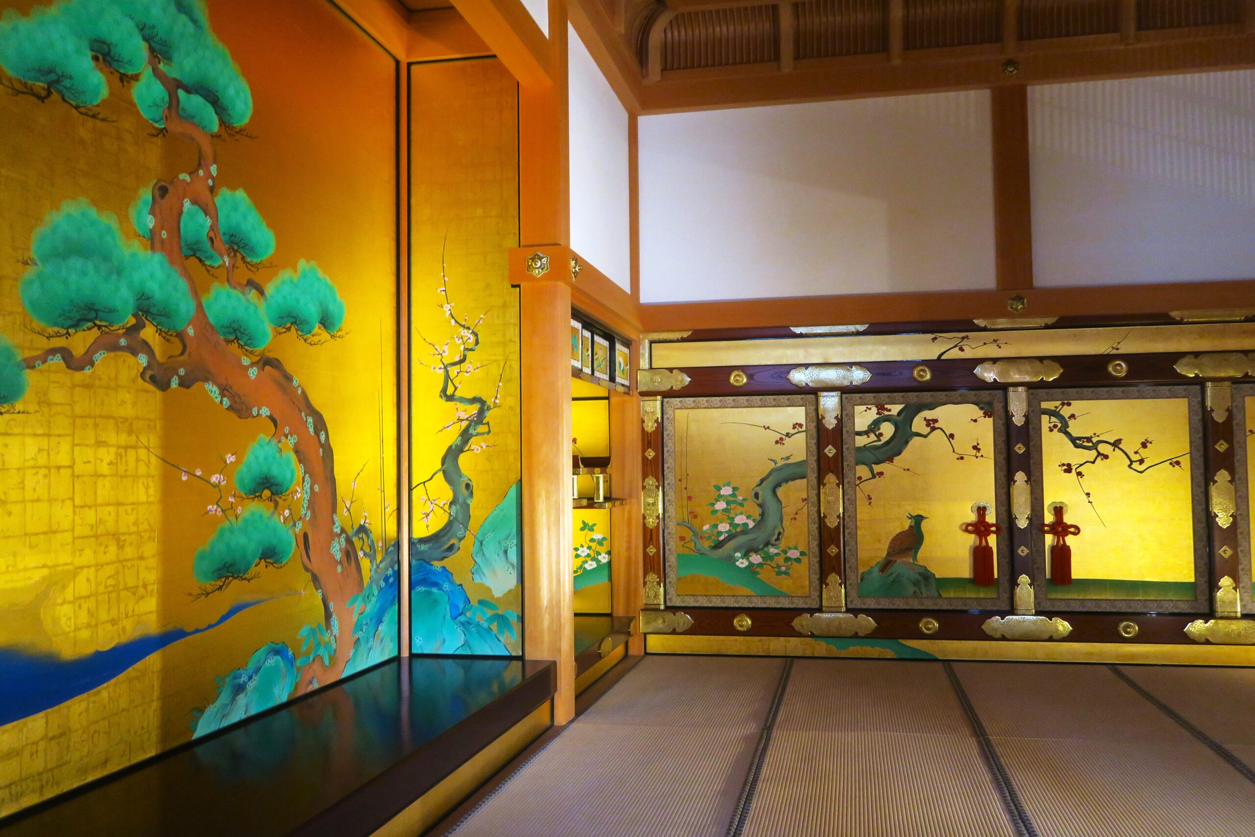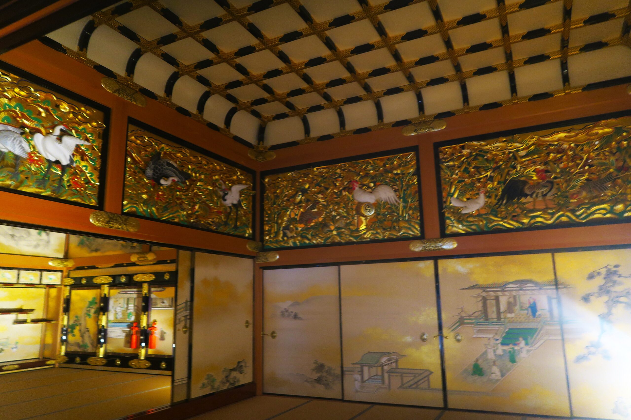 極めつけの上洛殿は、寛永11年(1634)に三代将軍家光の上洛に合わせて増築された最奥部の御成御殿です。江戸時代は御書院・御白書院と呼ばれ、本丸御殿で最も格式の高い建物です。天井には板絵が飾られ、部屋の境には極彩色の彫刻欄間がはめ込まれり絢爛ぶりで、飾り金具も華やかな彩りを添えています。特に家光の御座所となった上段の間は、息をのむほどの空間。江戸初期の絵師狩野探幽による水墨画「雪中梅竹鳥図」「帝鑑図」に囲まれた贅を極めた荘厳な空間に圧倒されます。