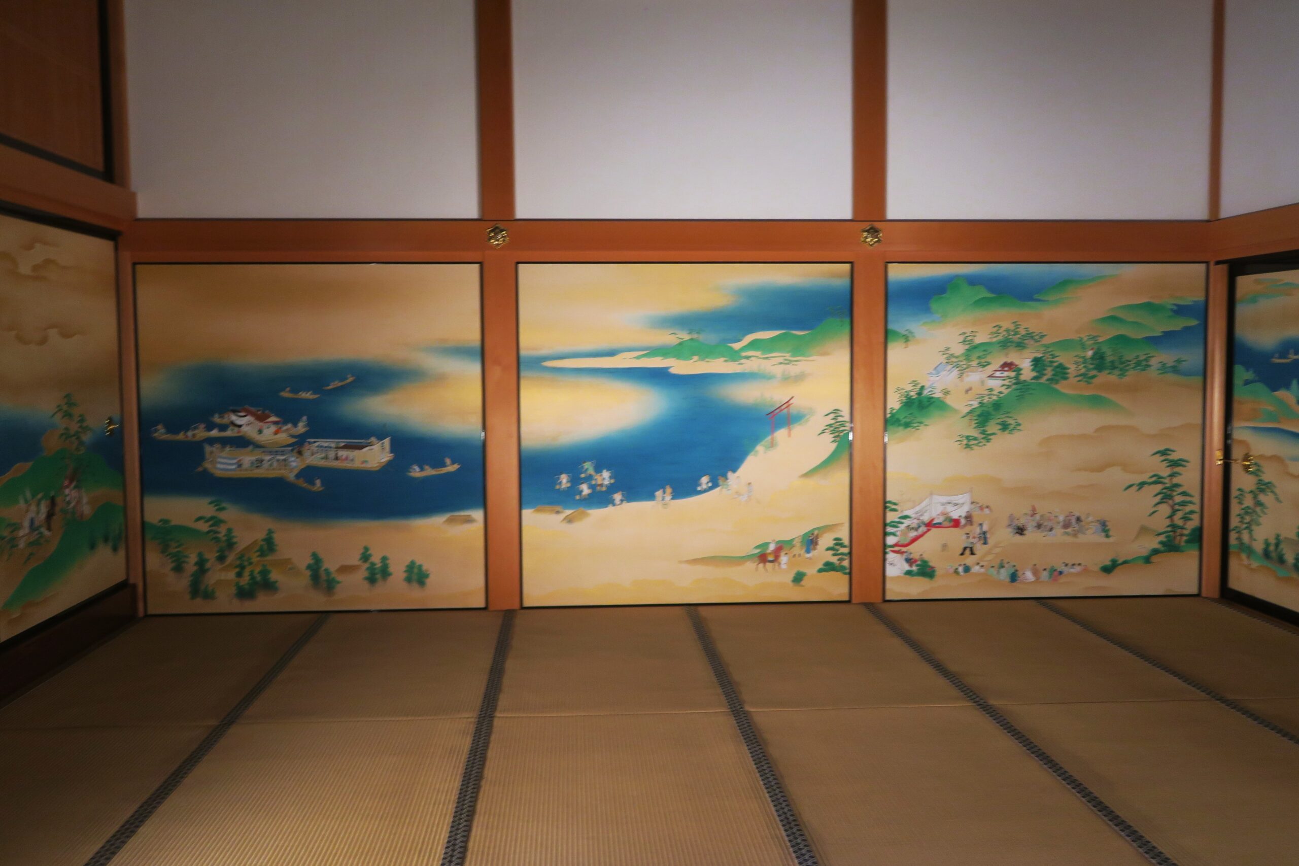初代藩主・義直と春姫との婚儀も対面所で行われたとか。そのため床の間には徳川家にゆかりの深い京都・愛宕山を描いた障壁画を、また壁面には春姫の故郷・和歌山の風景が描かれていて、藩主がよりくつろげる趣になっています。写真は対面所・次之間