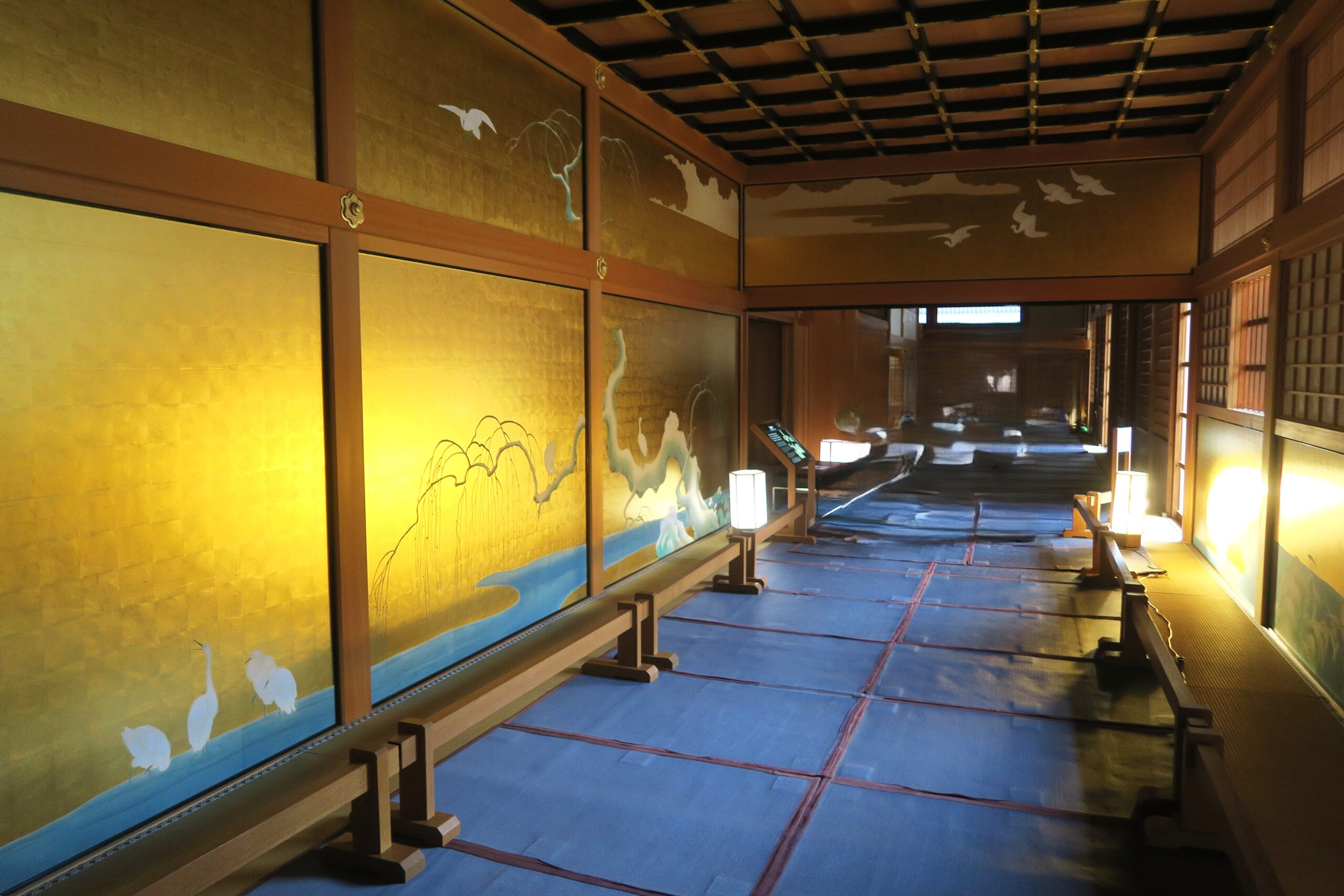 壁一面に金箔を貼った鷺之廊下。対面所と上洛殿を結ぶための廊下で、寛永11年(1634)に上洛殿とともに増築されました。長押の上まで障壁画が描かれるのが寛永期の特徴です。将軍や藩主はここを通り上洛殿へ向かいました。