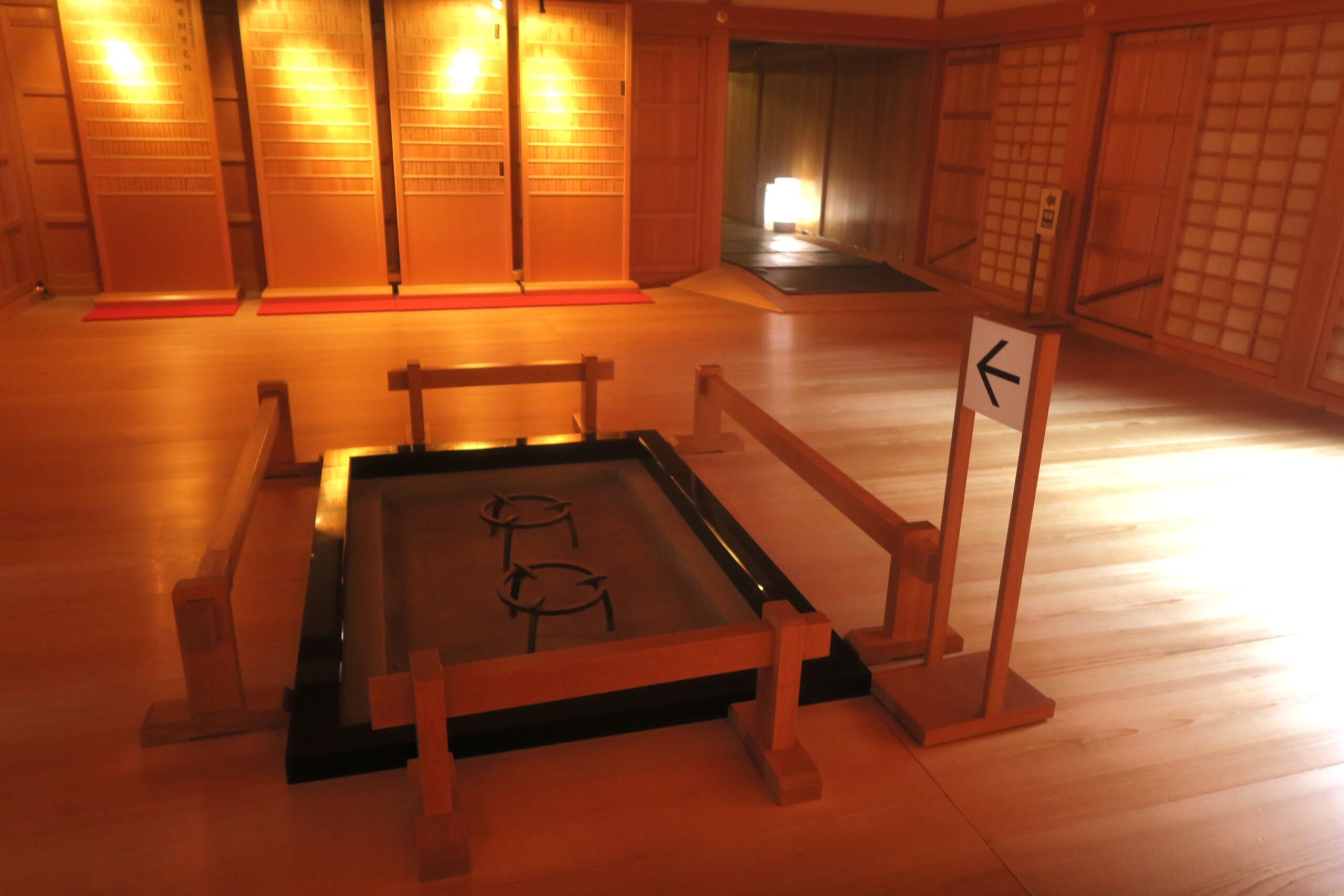 下御善所は、長囲炉裏が備えられており、料理の配膳や温め直しのための建物だと考えられています。天井には煙出しがあります。