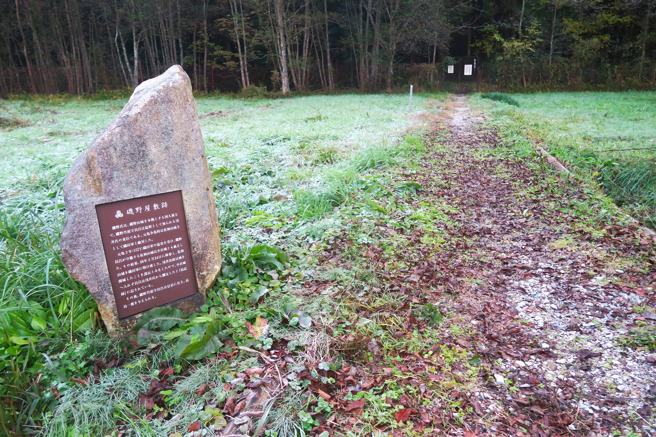 歩き始めてすぐの左手に「磯野屋敷跡」と書かれた案内板が現れます。ここは姉川の合戦等で活躍し、境目の城として浅井氏の重要な戦略拠点であった佐和山城主を務めた磯野丹波守員昌の屋敷があったと伝えられています。追手道の入口に屋敷を与えられていた磯野氏は浅井氏にとって信任の厚い重臣であったと窺わせます。元亀2年(1571)2月織田軍の攻撃により佐和山城を開城するも浅井長政は謀反したとみなし、そのため浅井氏から離反し、信長の家臣となっています。