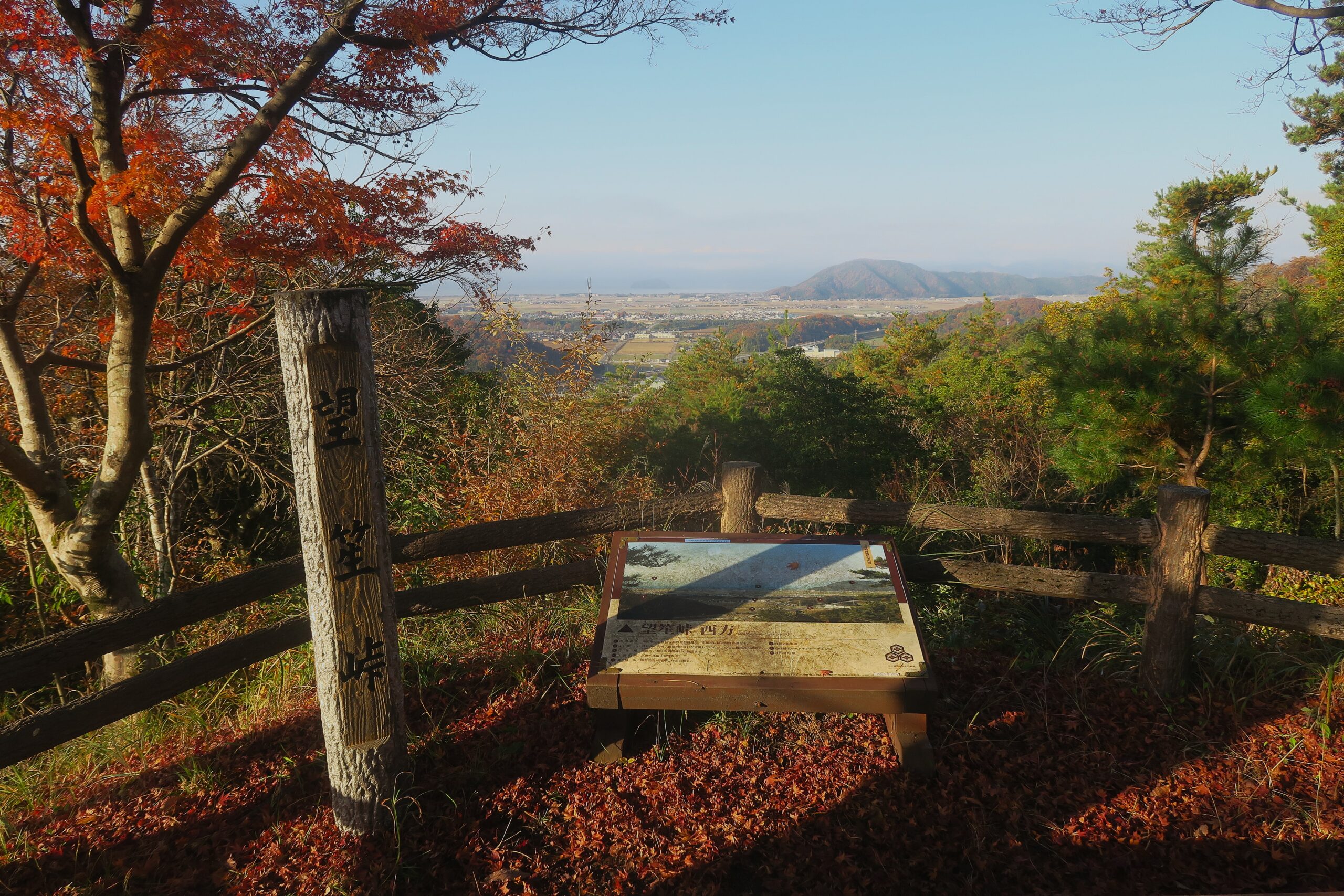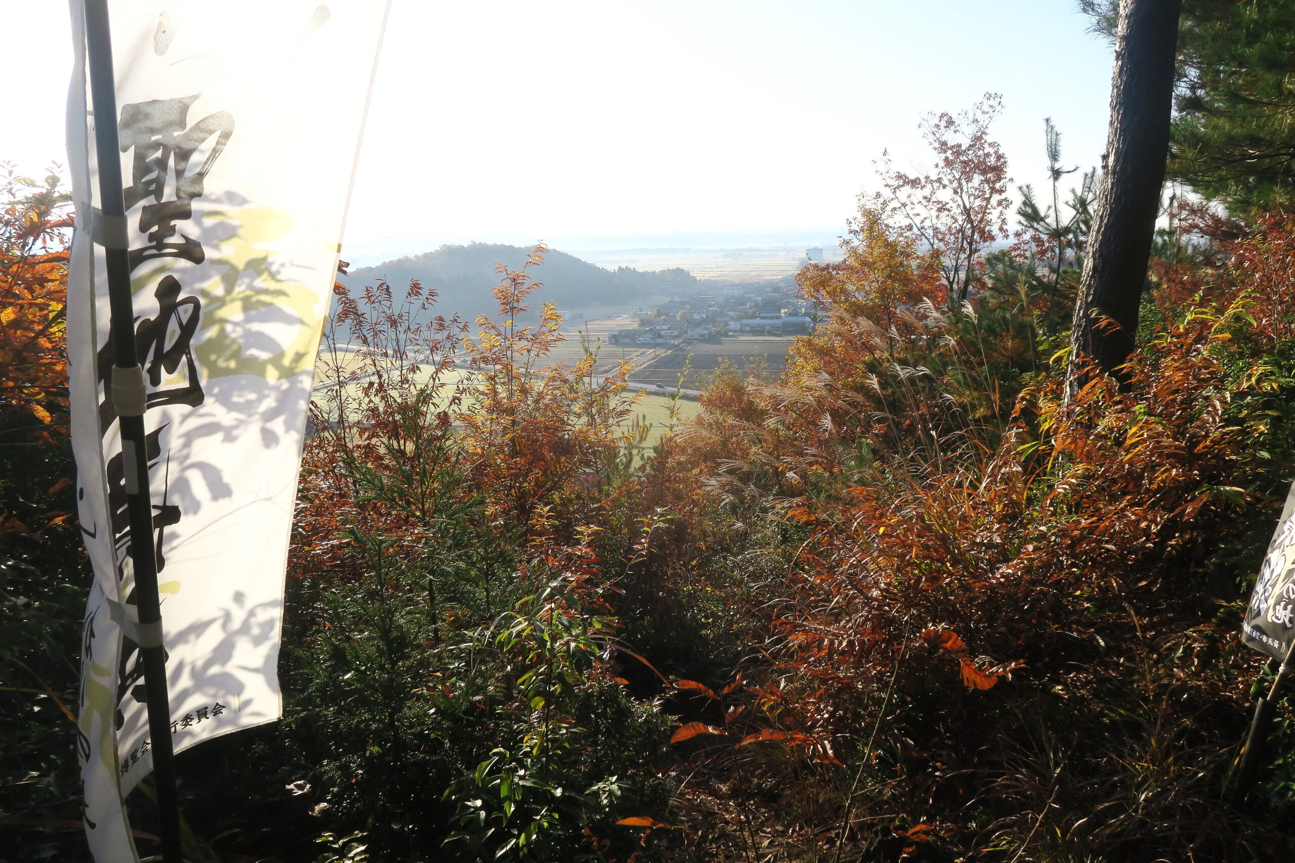 さらに望笙峠という西方に琵琶湖を望める小じんまりとした広場にでます。小谷山の中腹にあるこの峠は、小谷城を東側から支える軍用・生活道路として機能し、戦国時代には軍事戦略や物資輸送の要となる欠かせないルートでした。遠くに琵琶湖に浮かぶ竹生島が望め、笙の字が「竹」かんむりに「生」と書いて「竹生」になることから竹生島を望める峠なので望笙峠かと納得です。