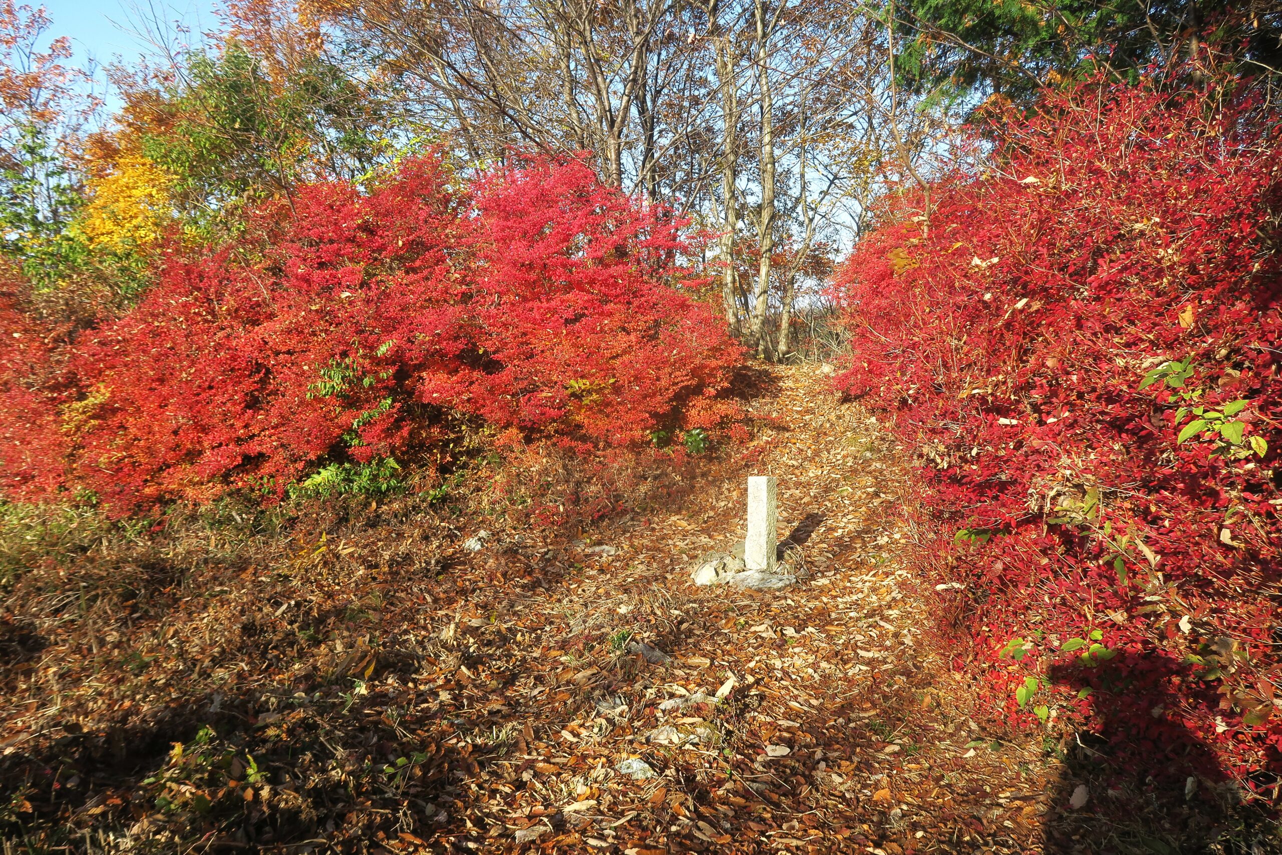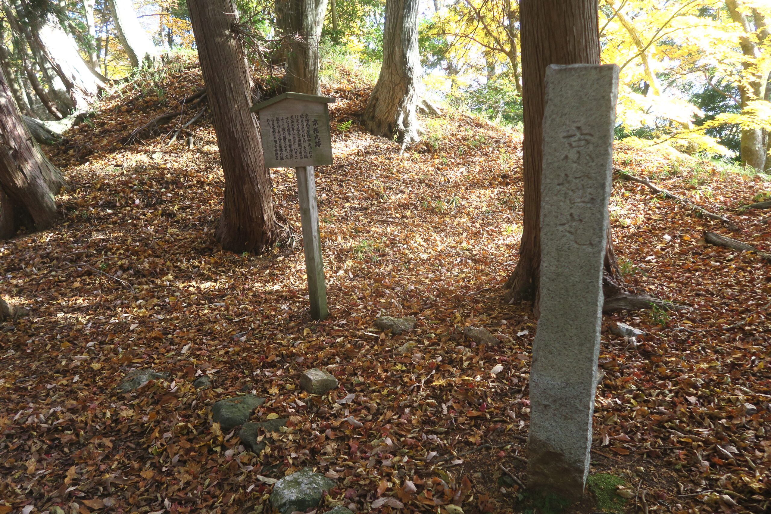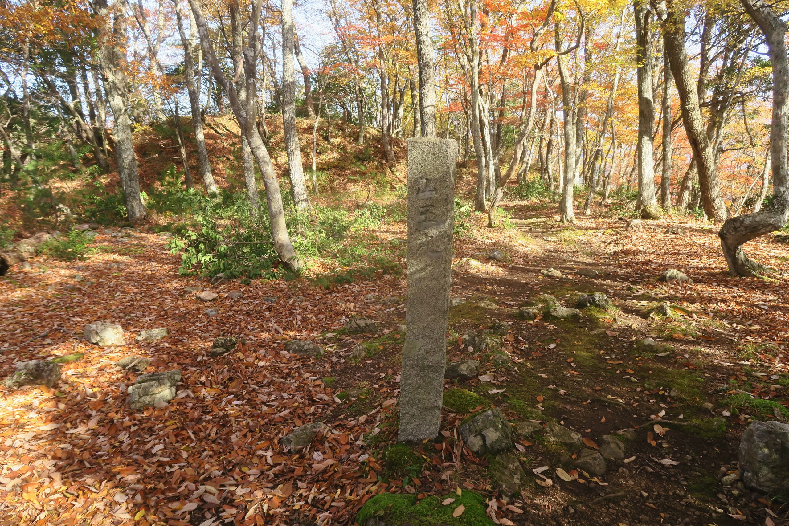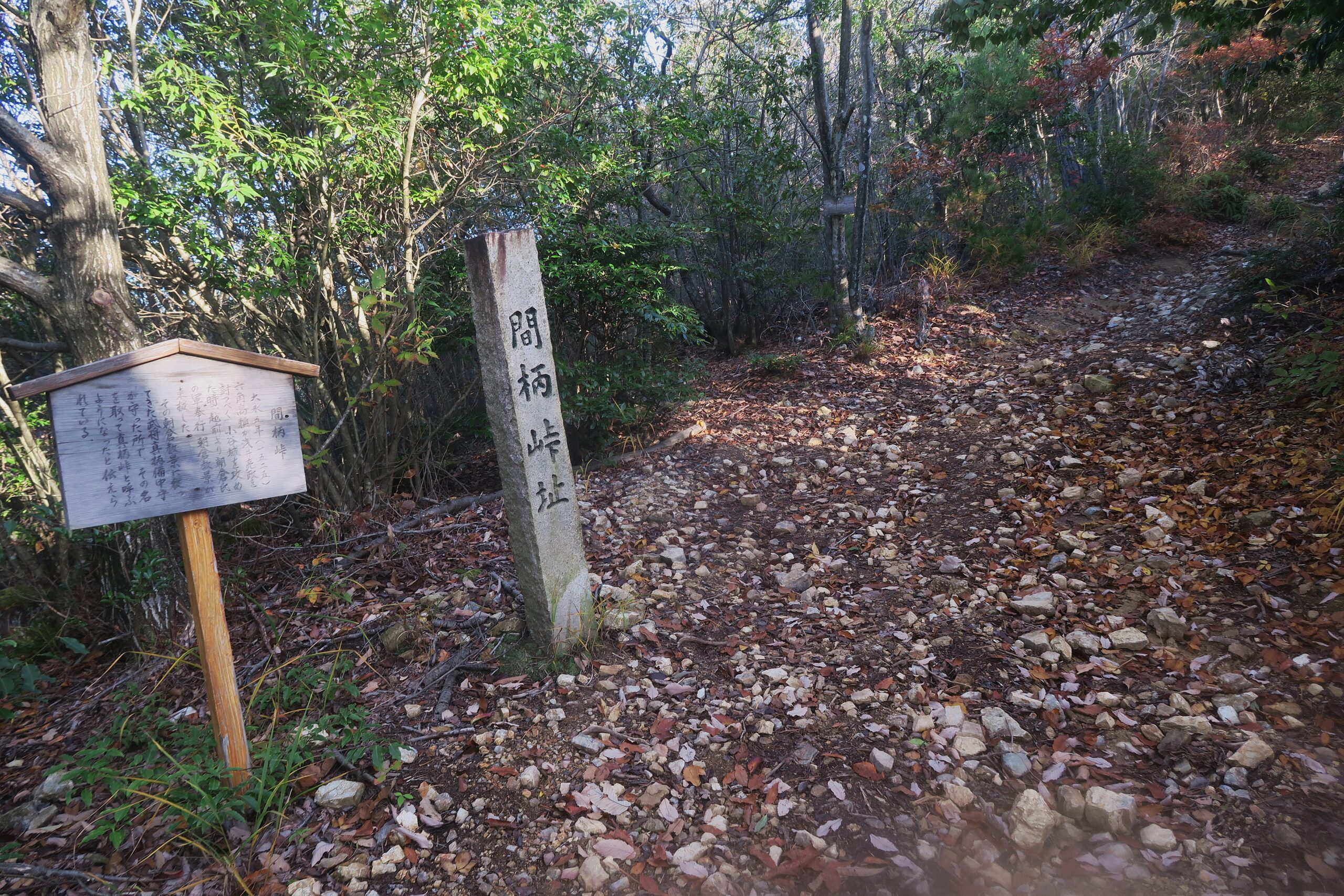 再び追手道の登山道に戻り登って行くとやがて間柄峠址と刻まれた石柱が現れます。大永5年(1525)7月、江南の六角高頼が小谷城へ来攻した際、浅井亮政を助けるため越前より朝倉氏の軍奉行朝倉太郎左衛門教景(宗滴金吾)と武将真柄備中守直隆が来援しました。越前軍が布陣した地がそれぞれ、金吾丸、真柄峠と称されますが、地元では古くから間柄峠として伝わっています。