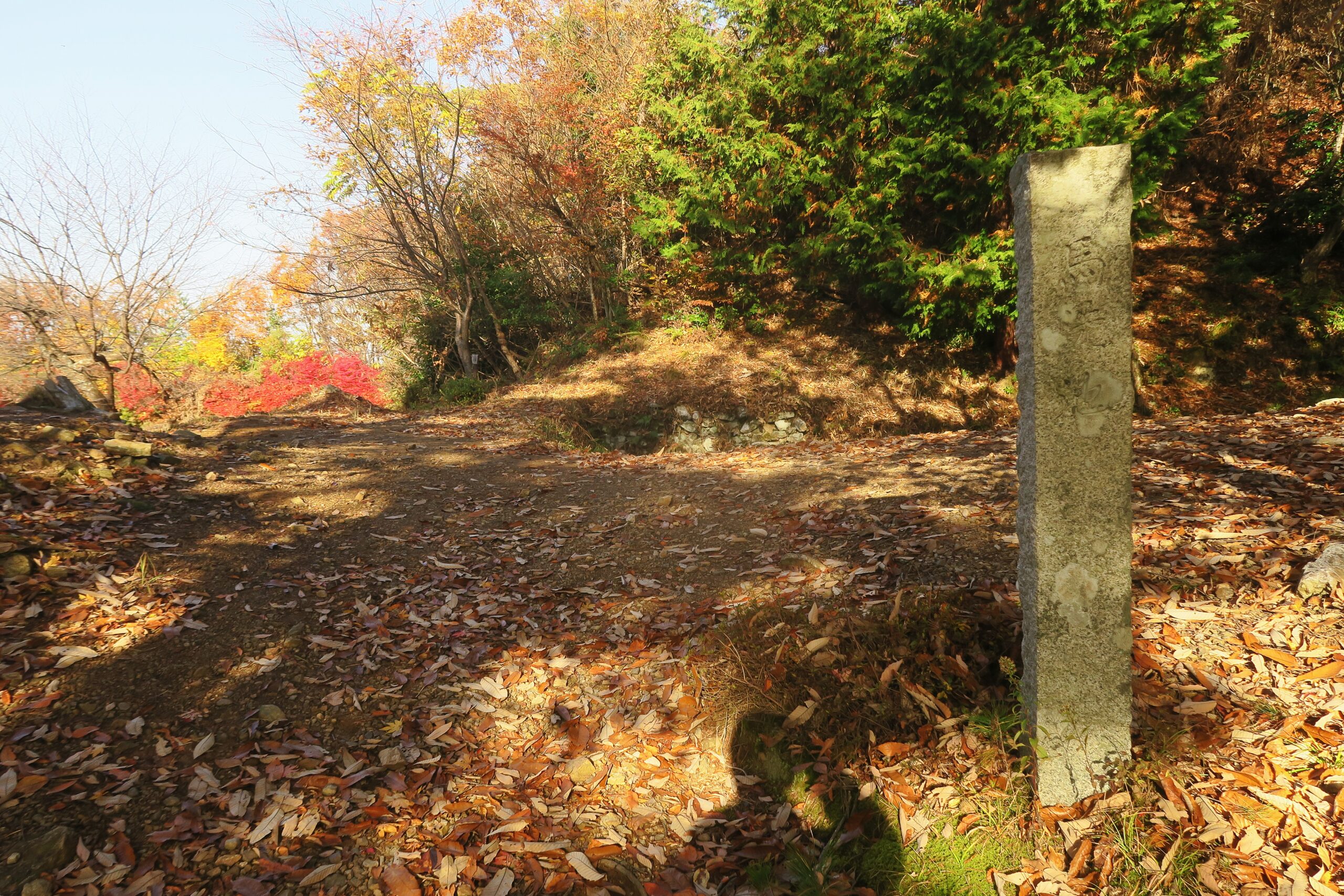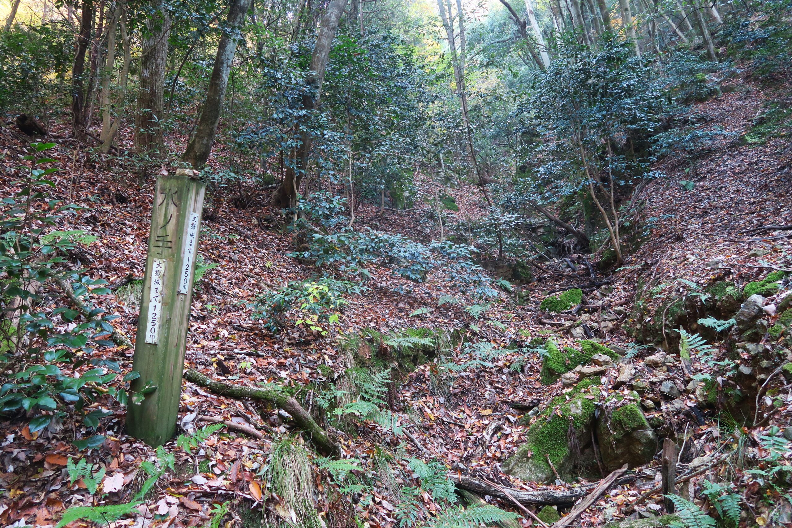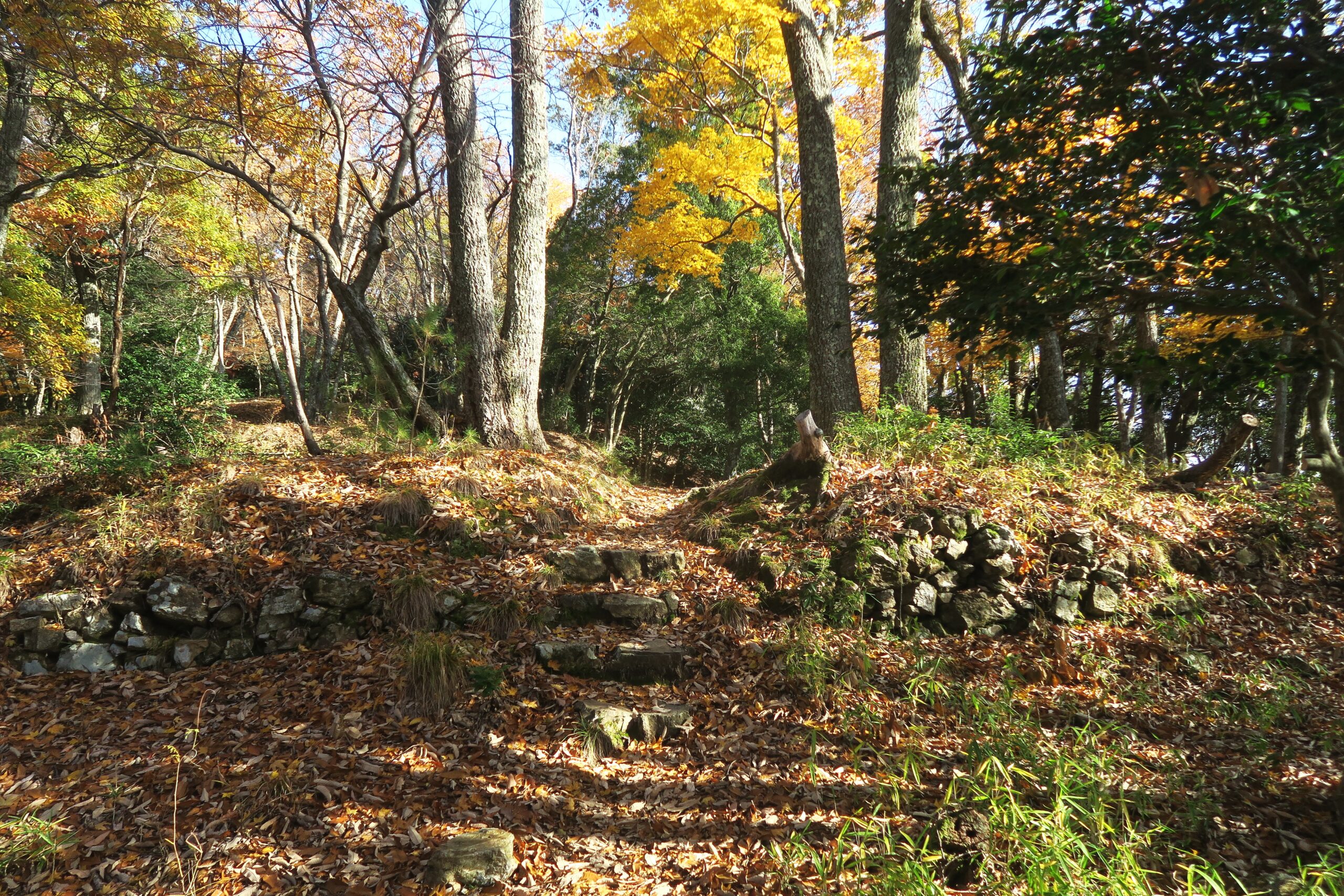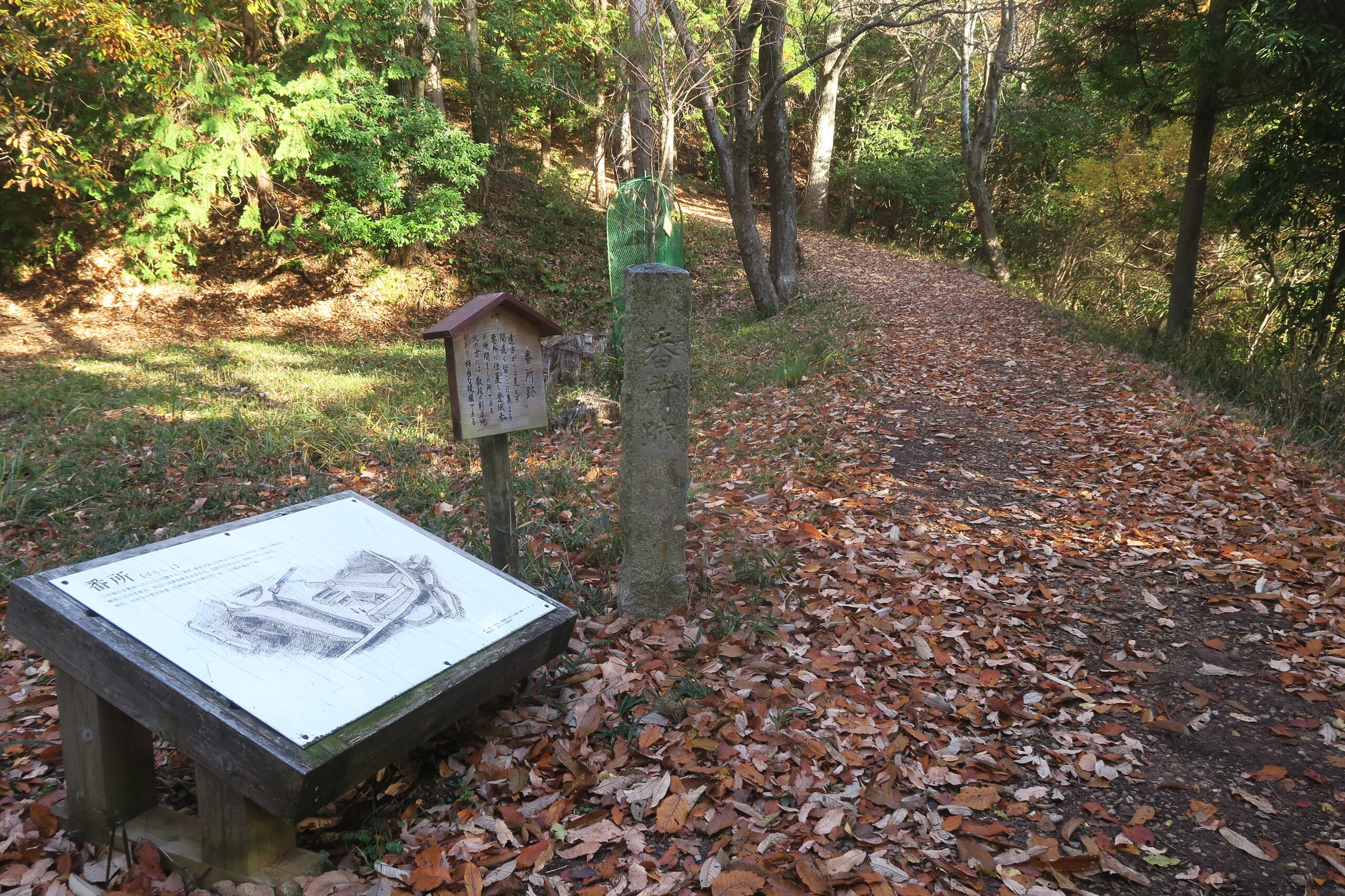 追手道を登り金吾丸を経て番所跡に到着です。金吾丸は大嶽城を真正面に見る南北に四段の曲輪と土塁からなる。土塁は低めで城郭構造にメリハリはなく、大永5年(1525)以降新たね修築はなされていません。金吾丸への登り道は二叉に分かれた厳しい坂道を右手に上っていくのですが、左手にそのまま進めばを金吾丸の西側を通り番所跡に到着します。