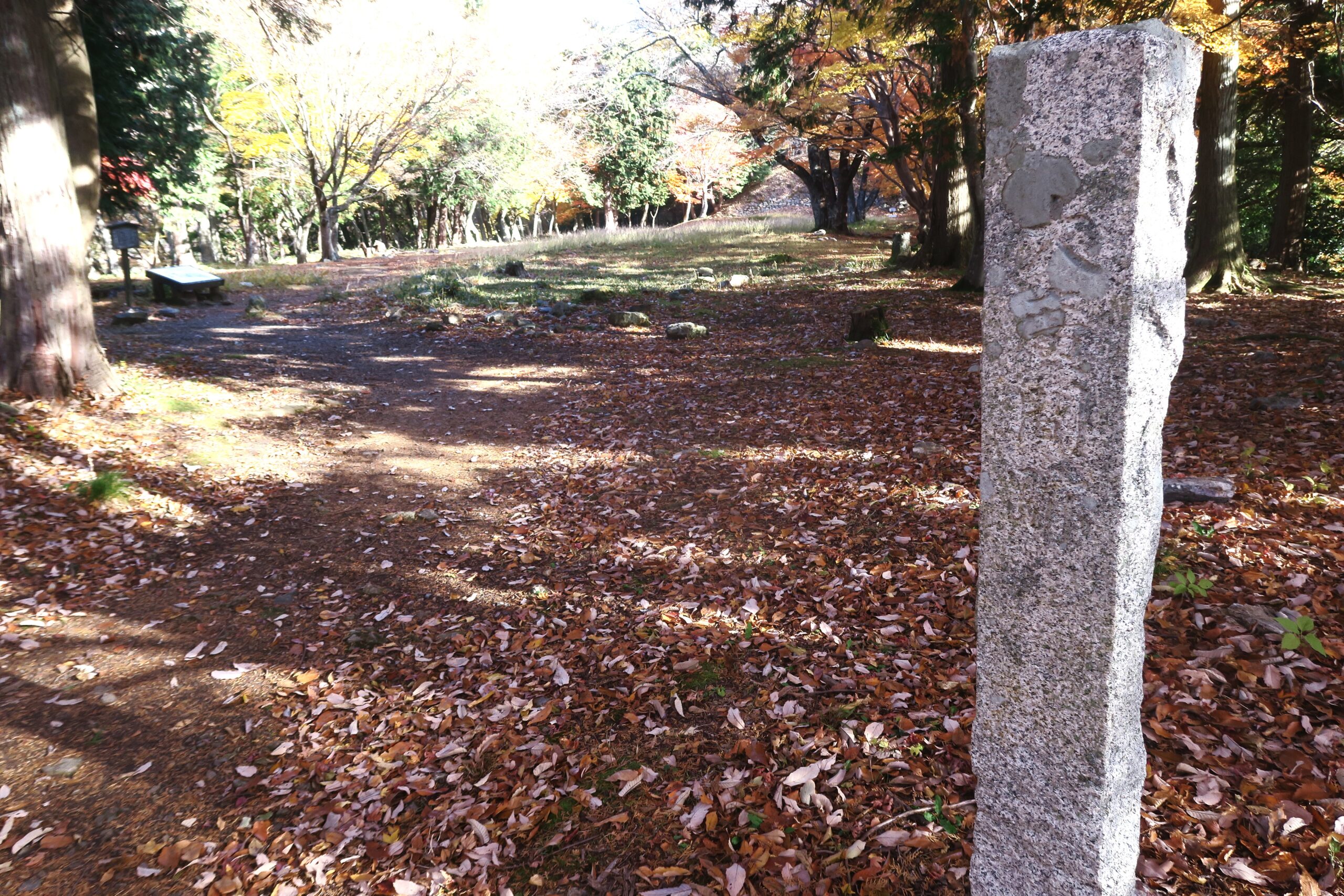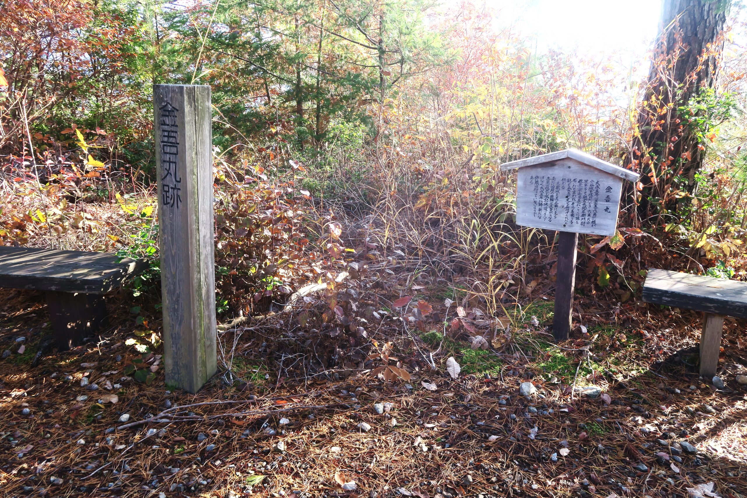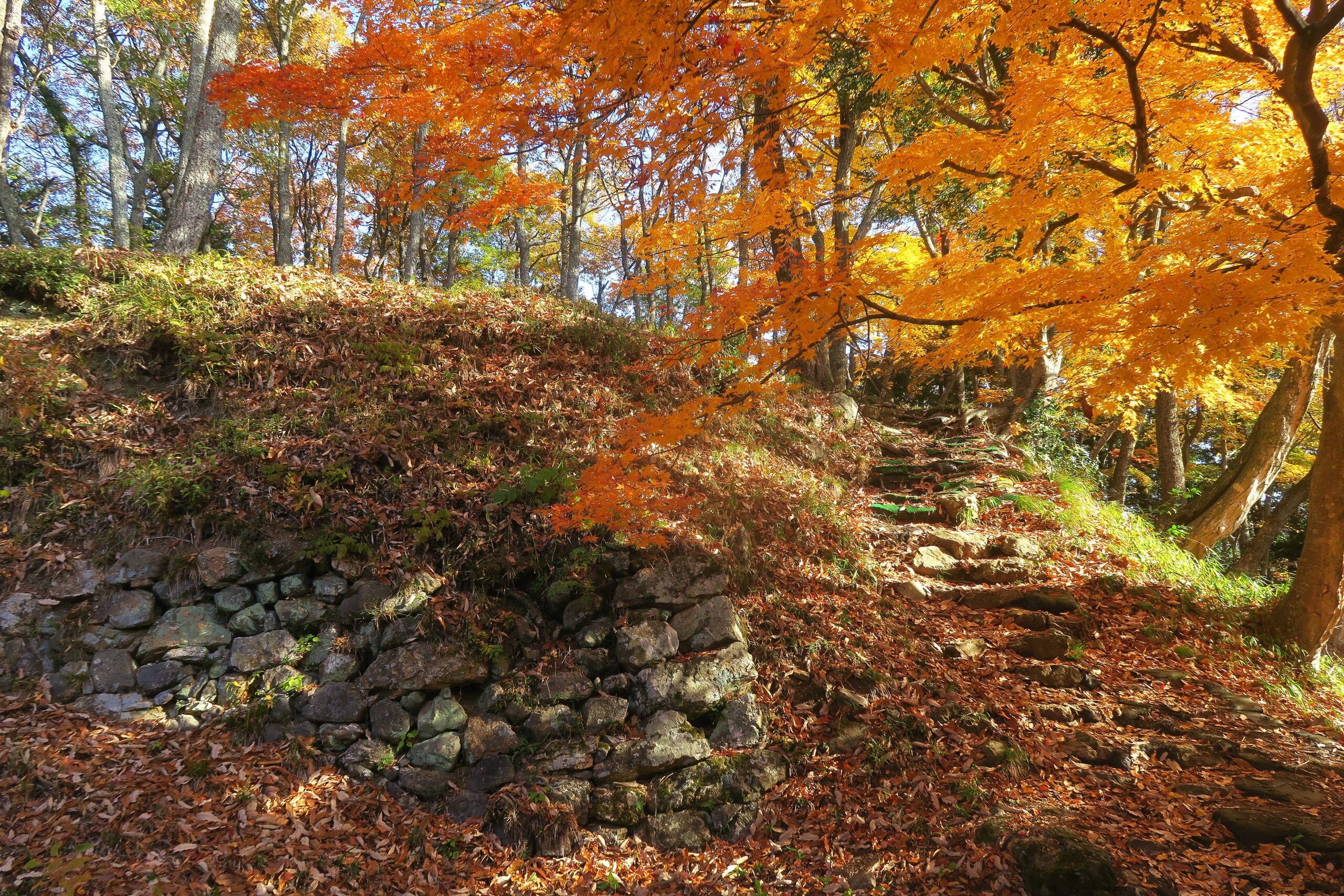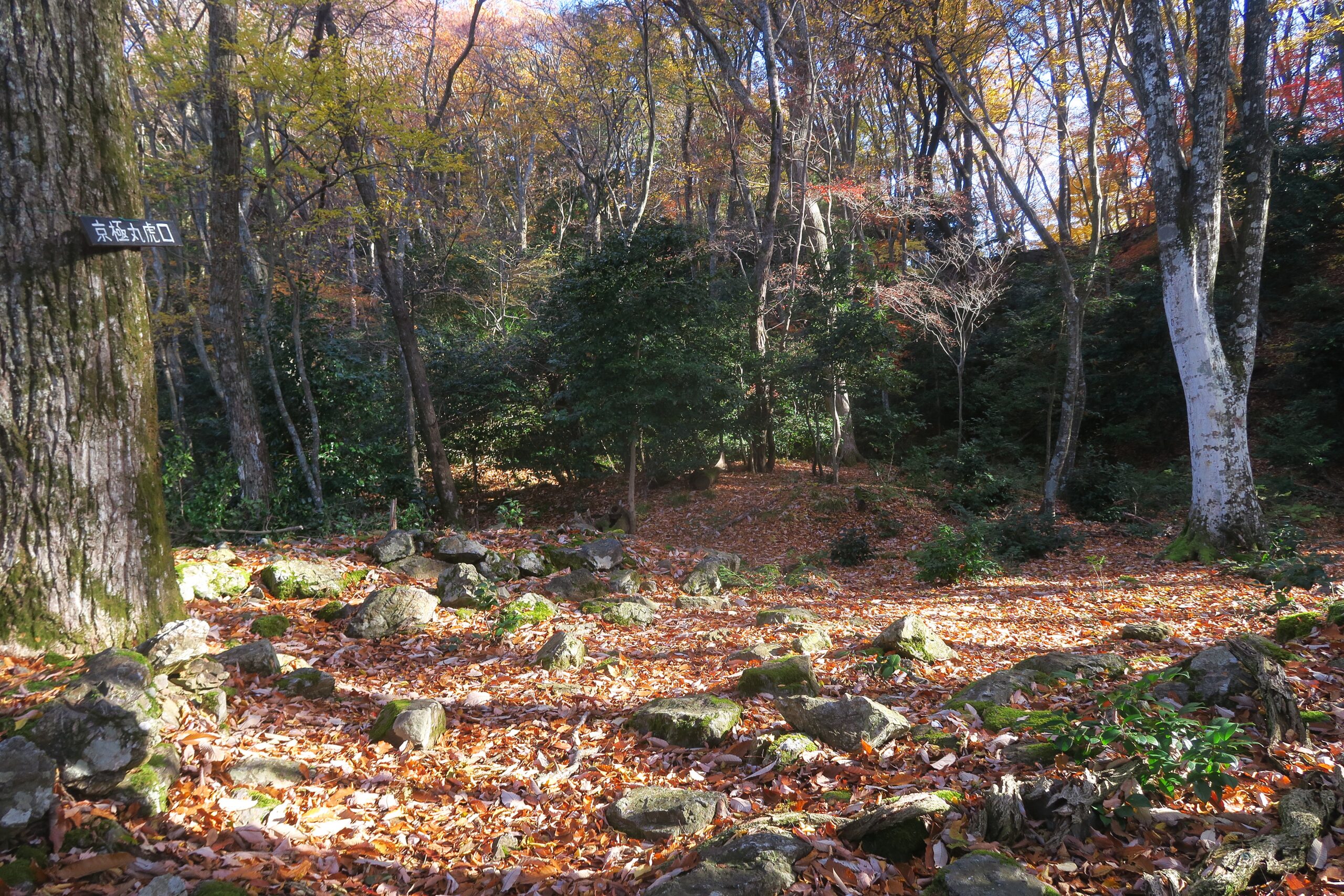 追手道を登り金吾丸を経て番所跡に到着です。金吾丸は大嶽城を真正面に見る南北に四段の曲輪と土塁からなる。土塁は低めで城郭構造にメリハリはなく、大永5年(1525)以降新たね修築はなされていません。金吾丸への登り道は二叉に分かれた厳しい坂道を右手に上っていくのですが、左手にそのまま進めばを金吾丸の西側を通り番所跡に到着します。