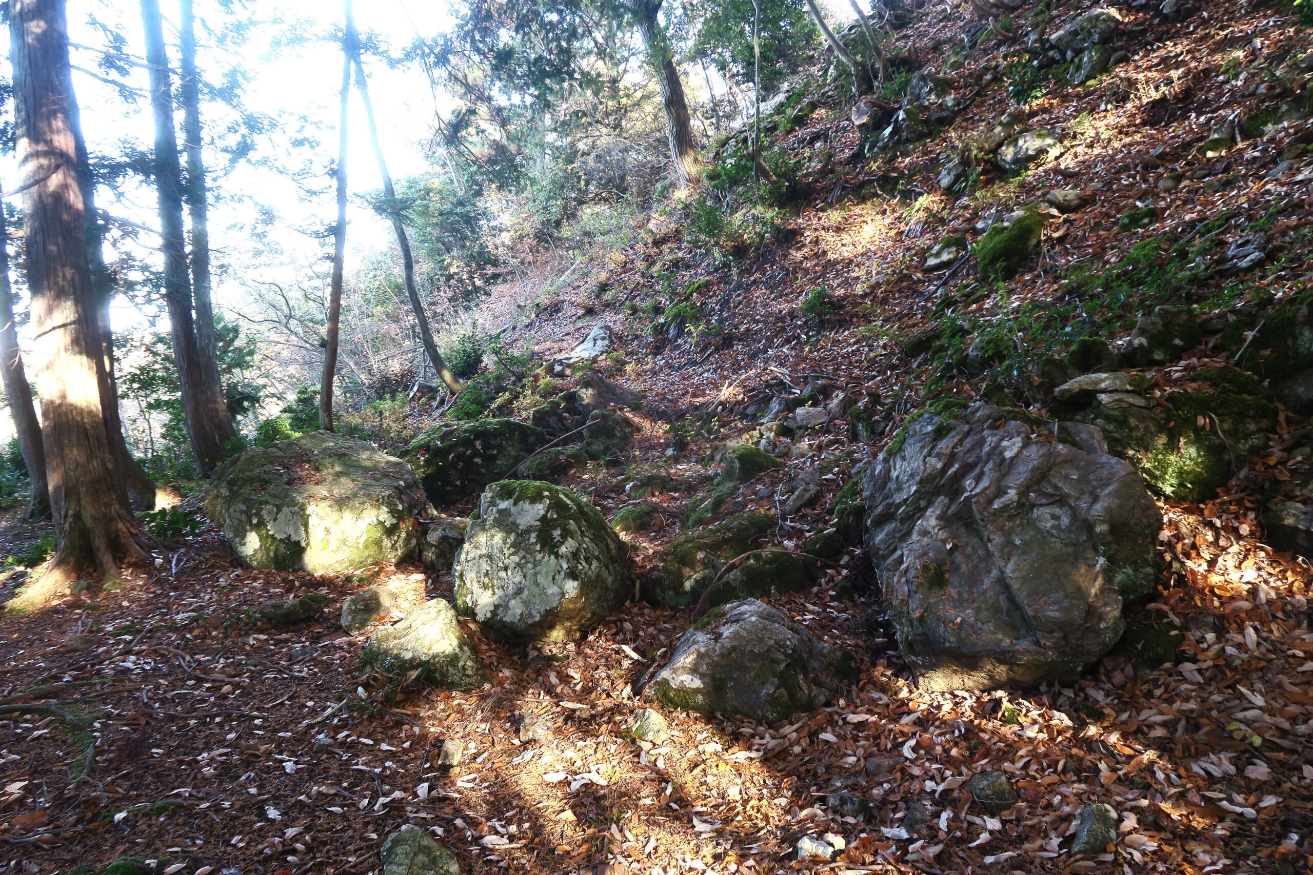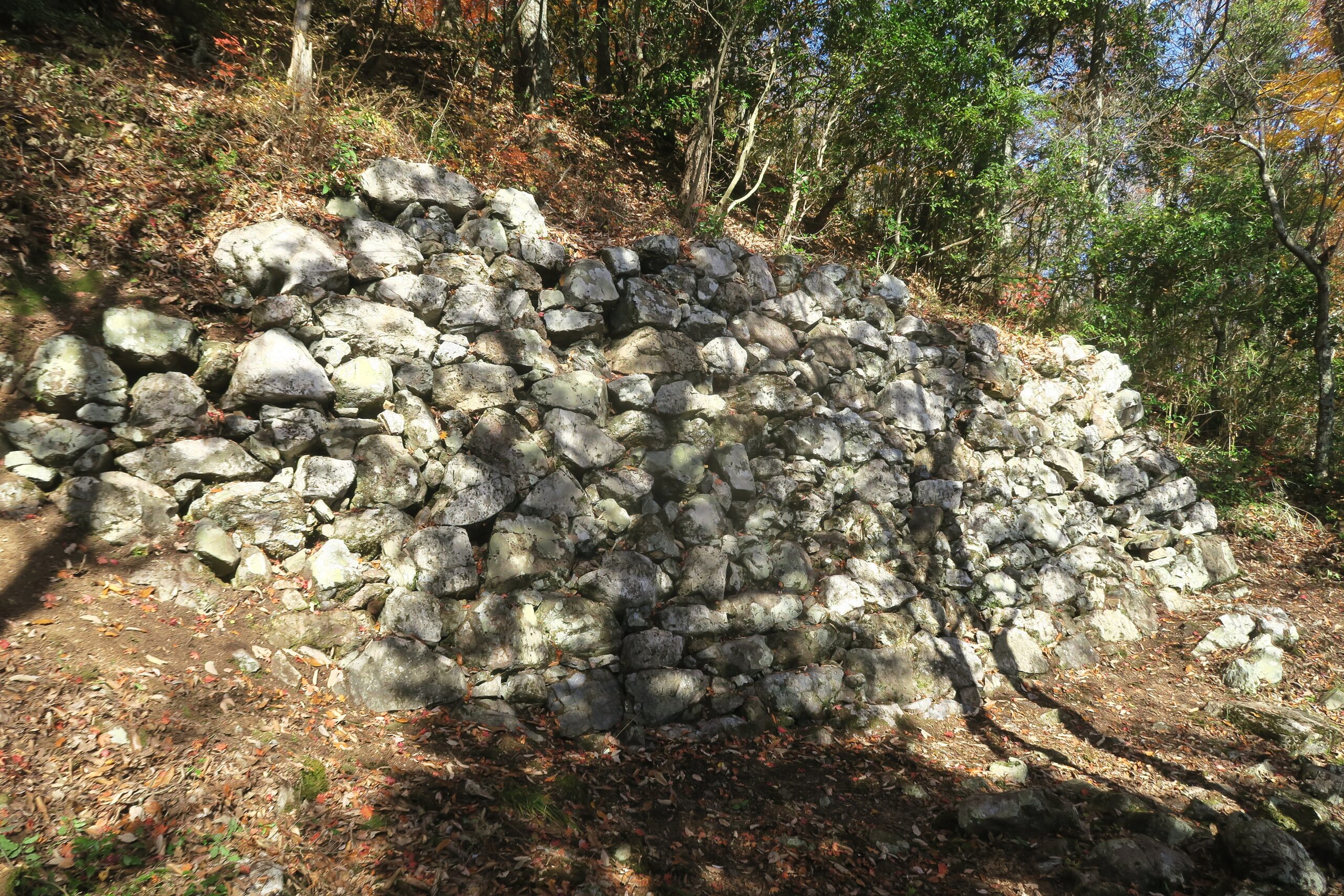 山王丸へ上る手前の石垣の石が散乱している所から東へ回り込むと目の前に現れるのが大石垣です。山王丸の東側に残る高さ5m余り、長さ約20mの石垣です。山王丸には巨大な切岸が立ちはだかり、その前面にゴロゴロと巨石が転がっています。かつては数メートルの石垣が築かれていたのです。城内で意図的に巨石が使われているのは、黒金門とこの山王丸で、黒金門が浅井一家が住んでいた大広間の格式を高めていたように、山王丸の石垣も権威付けであったと考えると小谷城の本丸はこの最高所の山王丸だったと考えられます。