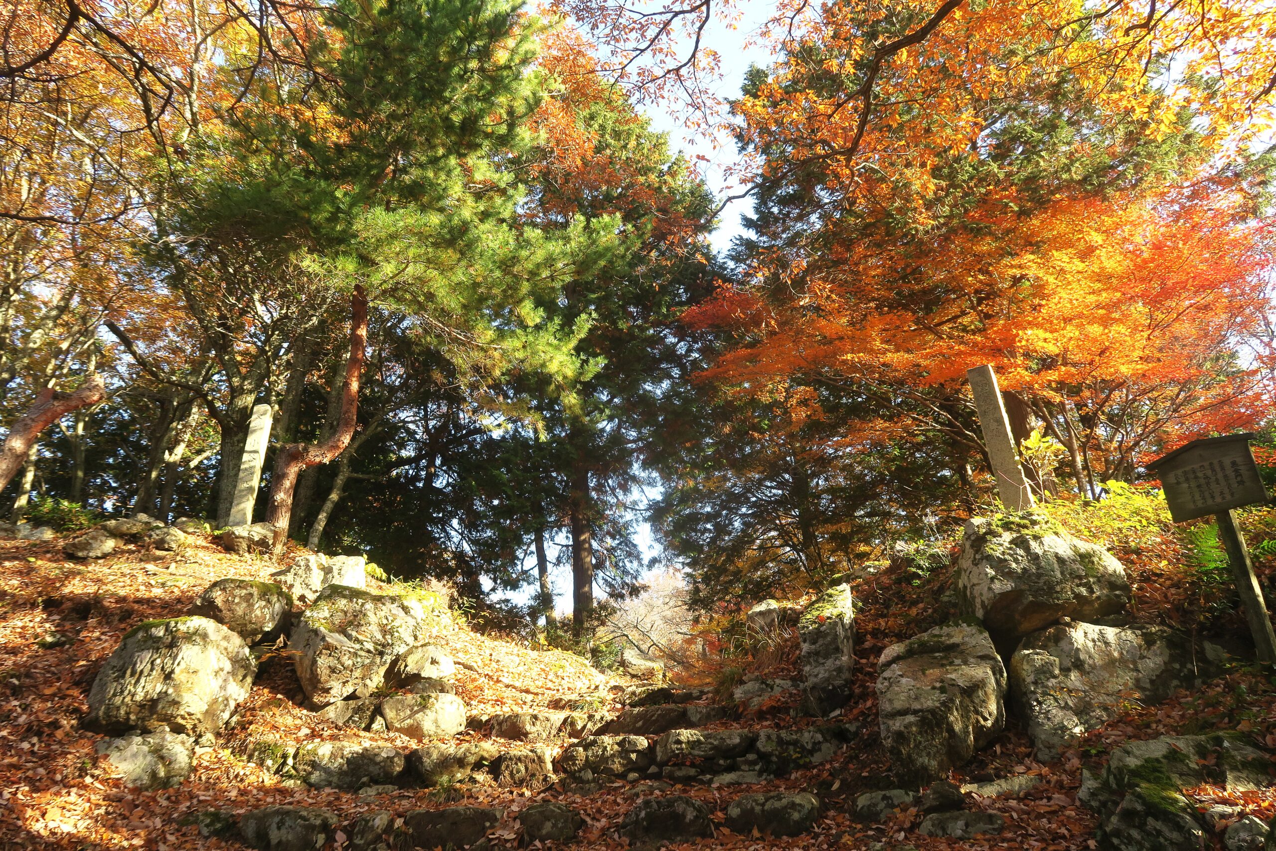 小谷城には山麓と中腹に駐車場が整備されていて登城ルートは、健脚の人は、山城の堅固さを体感するために山麓の小谷城戦国歴史資料館からの追手道入口または戦国ガイドステーションからの出丸入口を利用します。自信のない人は中腹の駐車場を利用します。