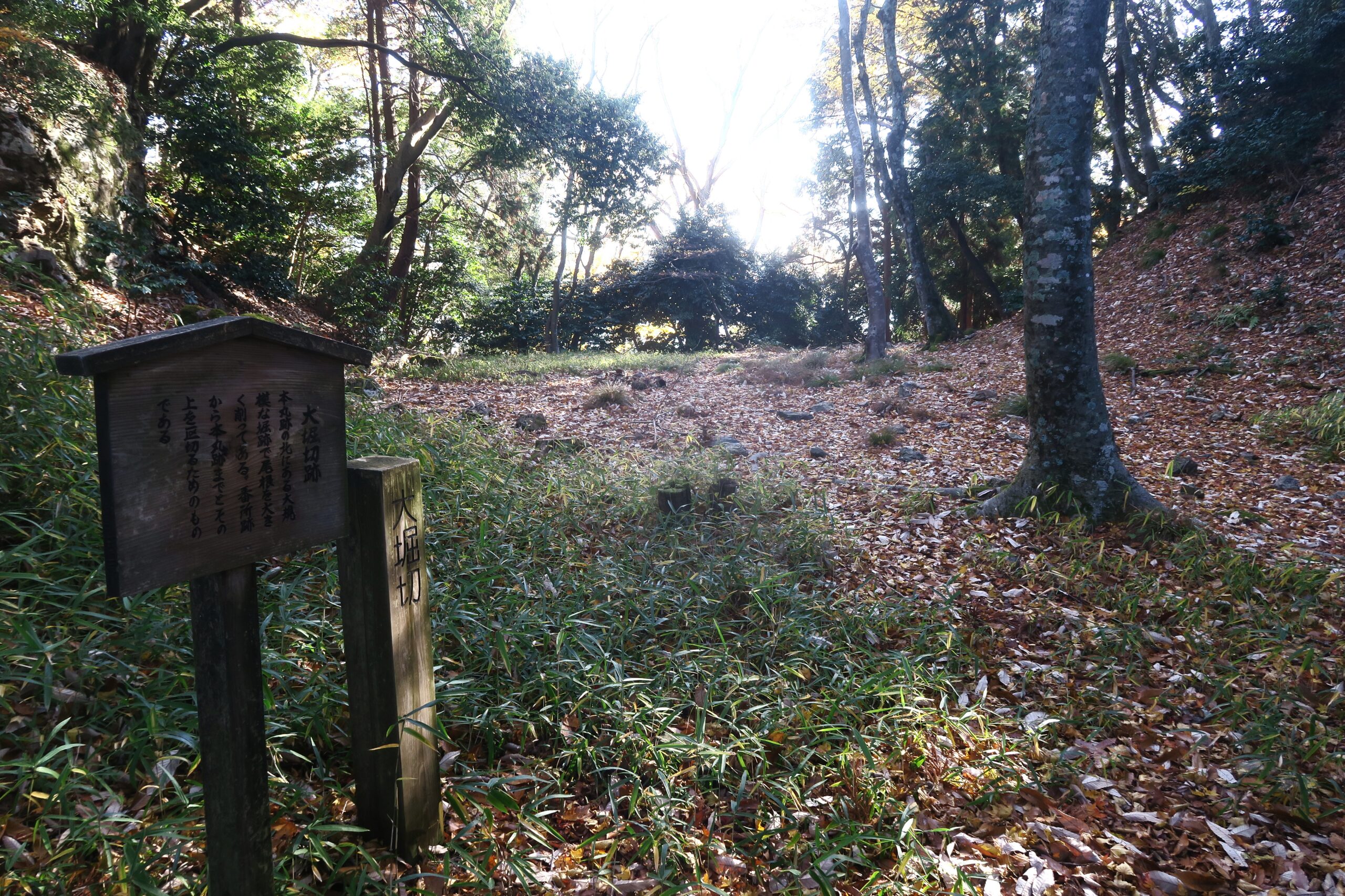 本丸の脇を通り、大堀切へ。堀切とは、尾根を断ち切って尾根伝いに敵が移動できないようにした防御施設のことで、この本丸と中丸の間の大堀切は、ほかの城ではなかなか見ることのできないほど規模が大きい。深さ約6m、幅約20mのこの堀切を境に曲輪の構造に変化が見られます。大堀切より北の曲輪群の多くは虎口が中央に設けられていますが、それに対して本丸までの曲輪は敵がまっすぐ抜けられないように側面から入る動線になっています。