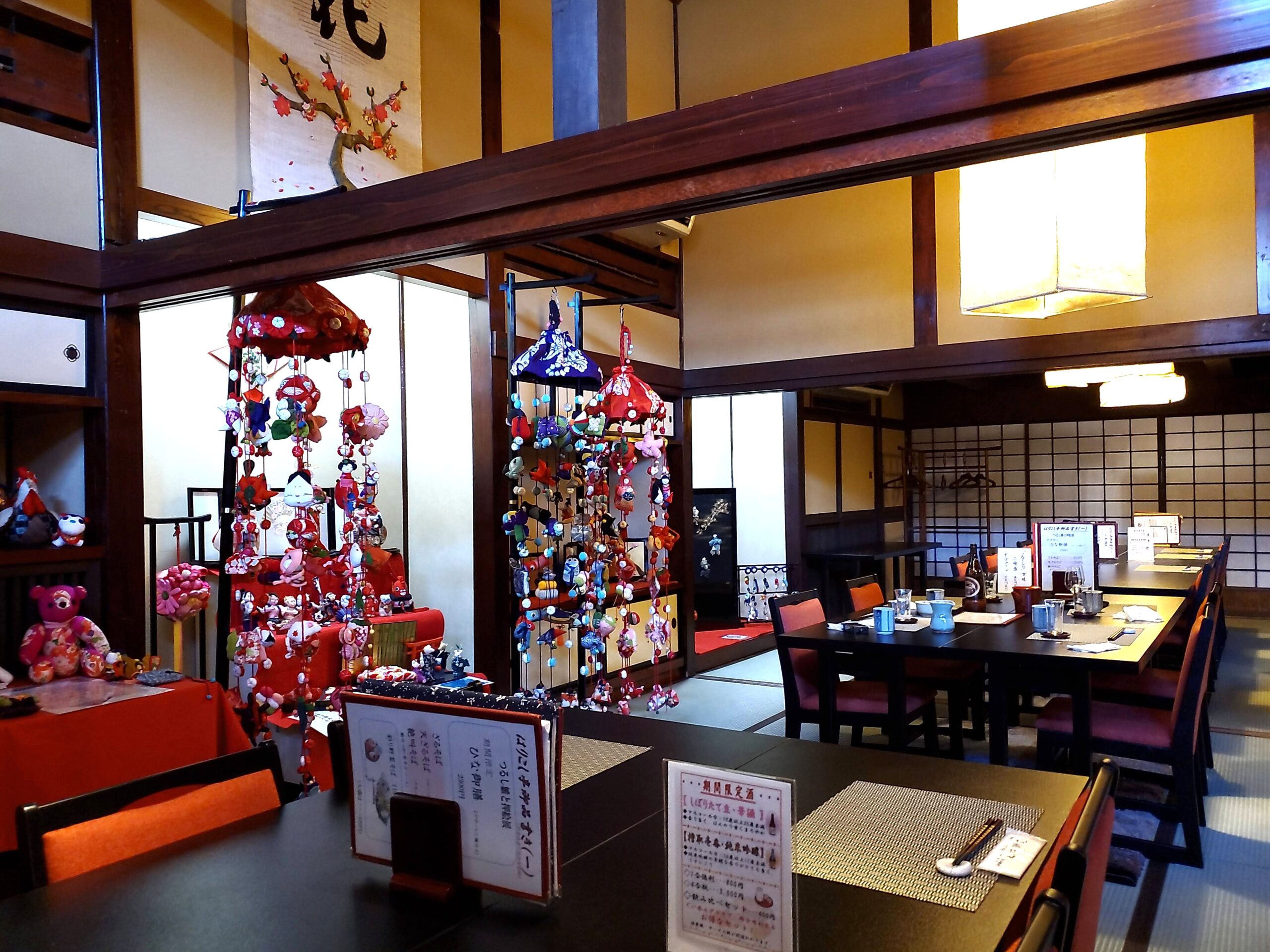 木組みの高い天井には太く見事な梁がめぐり、畳敷きに信州名物の長座布団と掘り炬燵式の佇まいは古き良き時代の日本建築そのままです。お座敷では、足を伸ばしてゆっくり食事が楽しめます。民家に残っていたという藍染の型紙を使った、タペストリーや暖簾が何とも粋な雰囲気です。