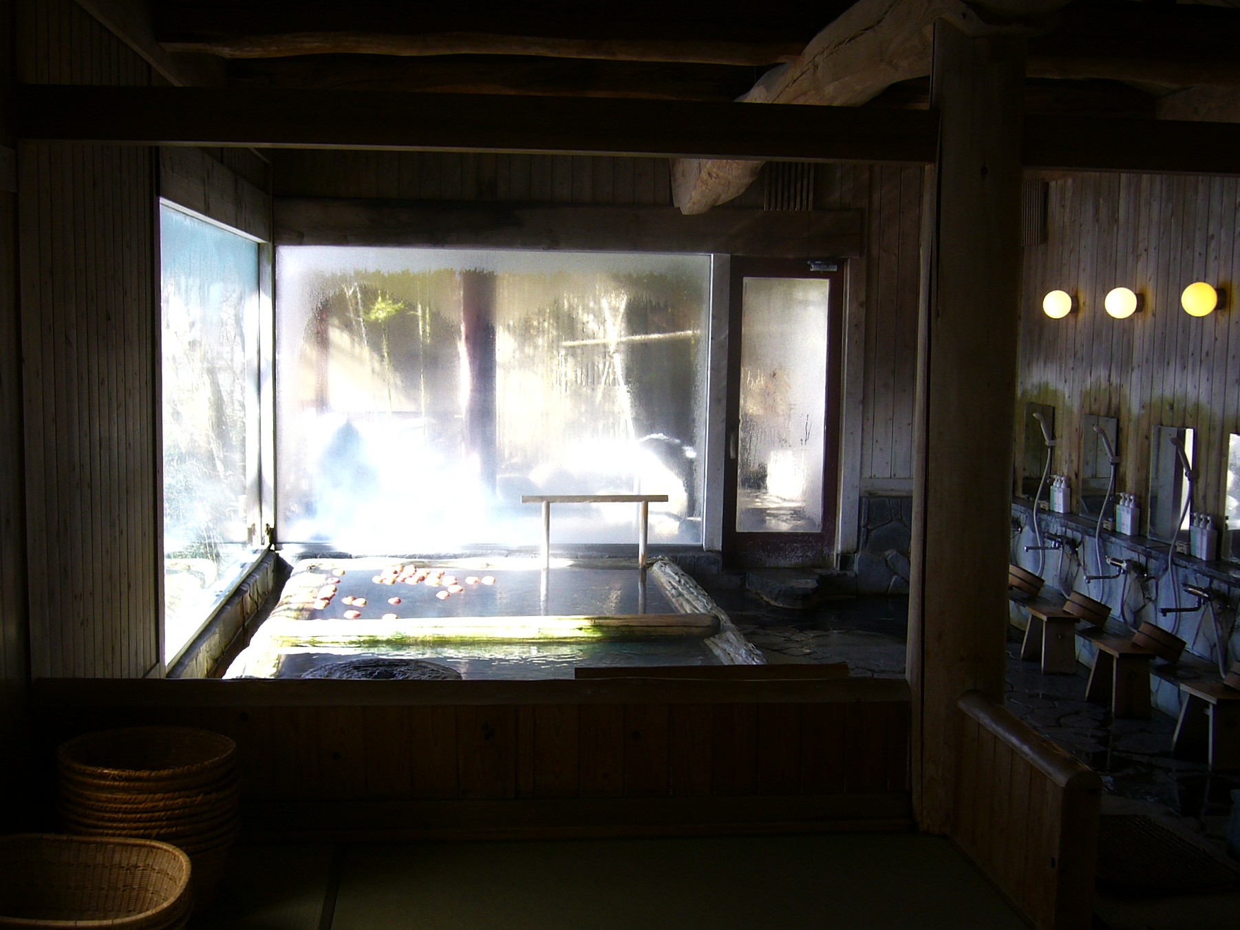 冬の寒さで冷えきった体を温めるには温泉に限ります。その温泉にりんごが浮いていたらもっと素敵ではないでしょうか。中棚荘の浴室には、平成5年(1993)に増築された平成館の客棟の裏手から風雨除けの覆いに囲われた長い石段を50段ほど上って行くきます。途中には、休み処もあって風情あふれる心遣いにうれしい気持ちになりながら、手前に男湯「樹林の湯」、奥には女湯の「観月の湯」と書かれた湯小屋に着きます。大浴場は源泉に近い場所に設けられています。畳敷の脱衣所と浴室の仕切りがない「大名風呂」と言われる開放的な浴室で、むき出しになった梁が印象的です。※以前は浴槽の真ん中に枕木が横たわっていましたが現在は撤去されています。