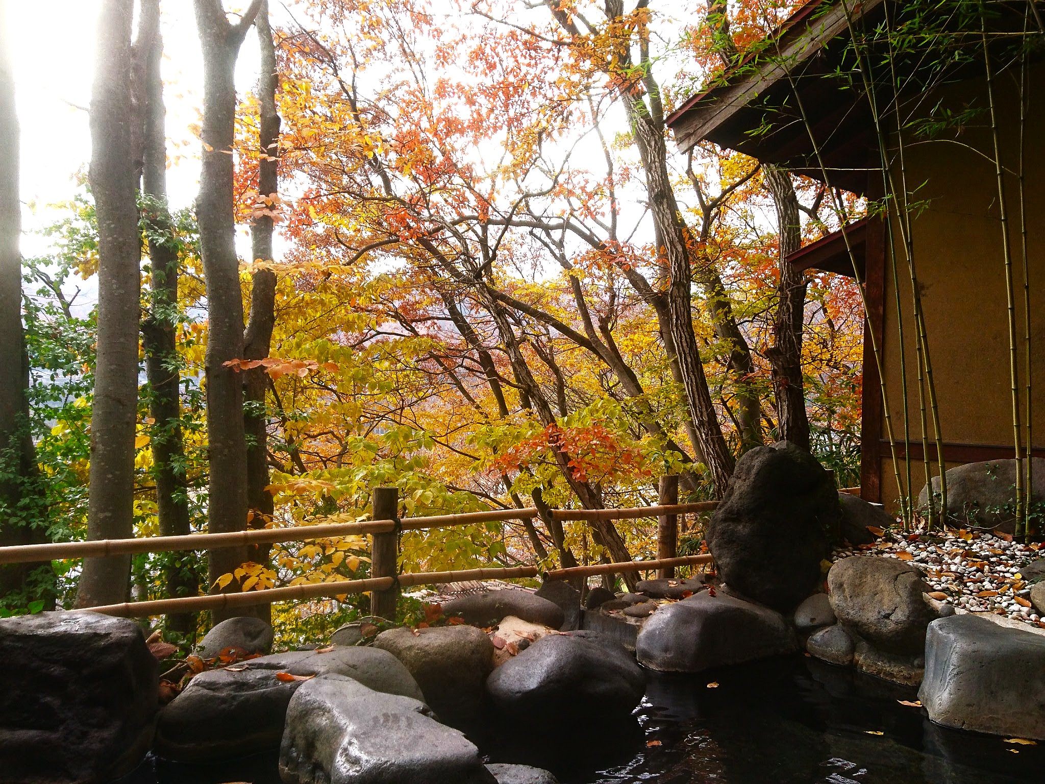 露天風呂からは眼下に、木々の葉が鮮やかな赤や黄色に色づき始めた千曲川沿いの風景が広がり、飽きることなく、浴槽から眺めることができます。