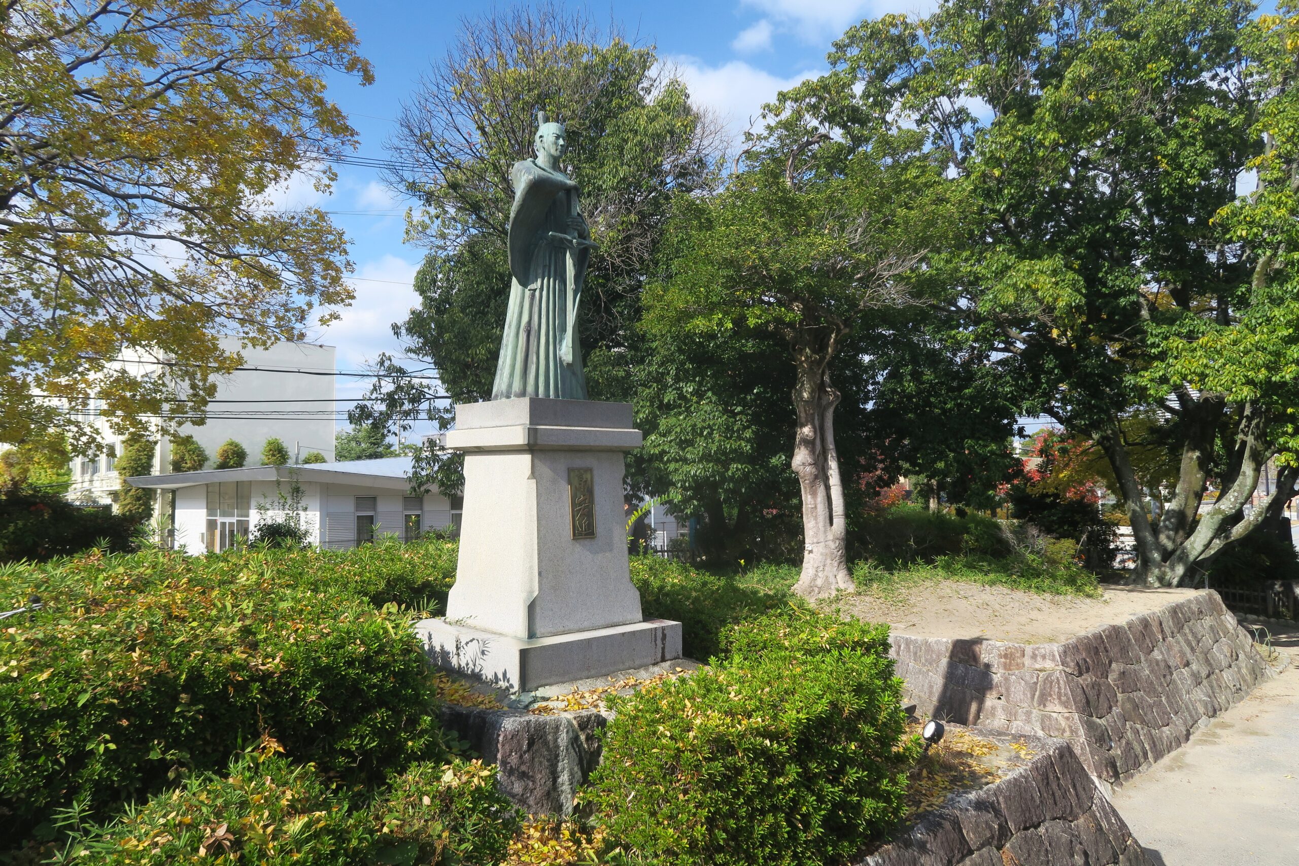 天守台を模した高台には高山右近の像が立ちます。滋賀県の彫刻家、西森方昭氏の手によるもので同じデザインのもが全部で5体あります。高槻城公園と高槻市民会館前、富山の高岡城、カトリック小豆島教会、最後となったフィリピン・マニラ湾公園です。