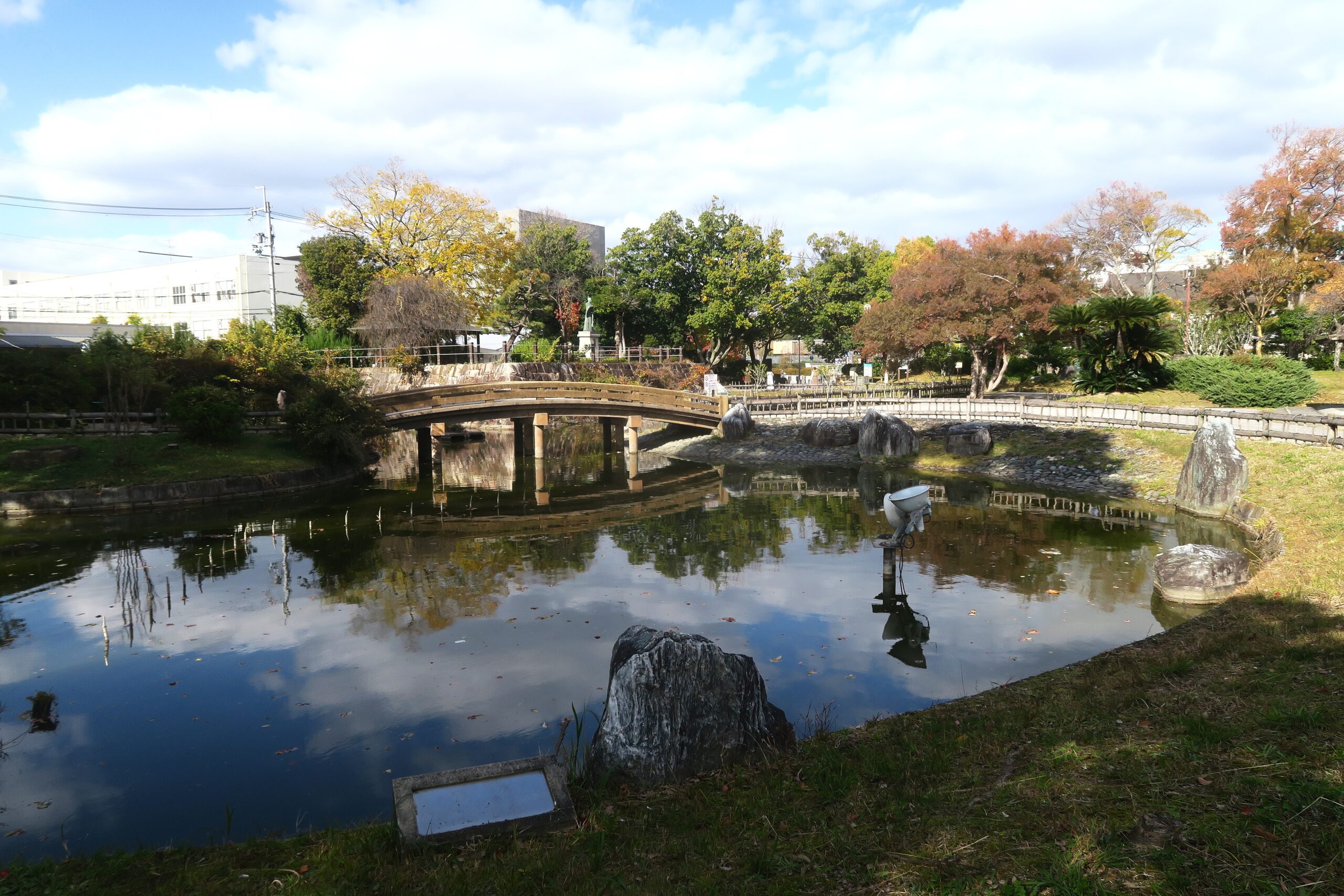 高槻城本丸は、城の石垣や堀を模した池を中心とする公園として整備されています。
