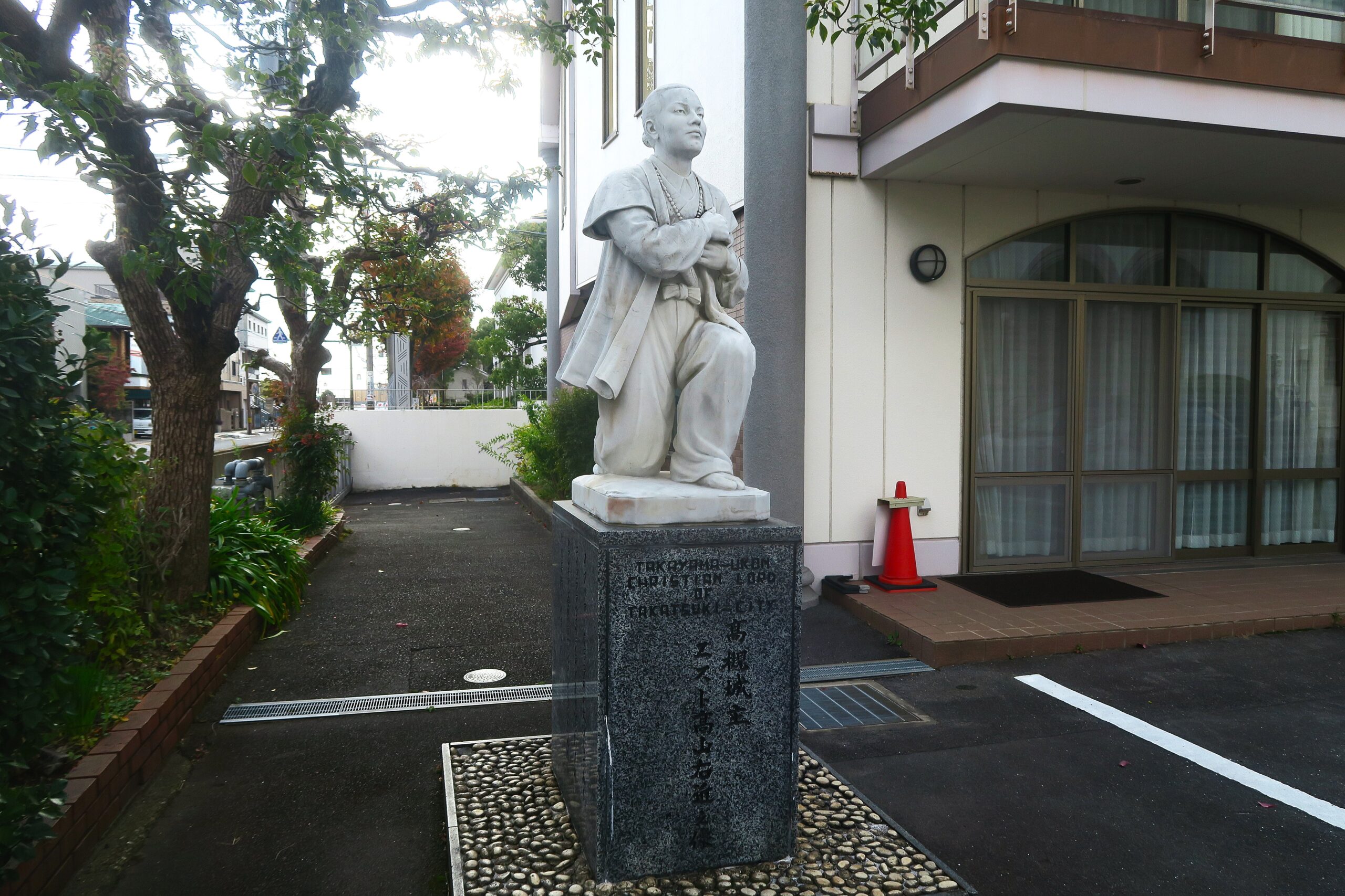 高山右近は豊臣秀吉のバテレン追放令で明石の領土を失い、徳川幕府のキリシタン禁教令によってマニラで生涯を閉じました。前庭にはカトリック本山・バチカン市国のクラレチアン総長から贈呈されたイタリア産大理石でできた記念聖堂に向いて祈りを捧げる高山右近像があります。