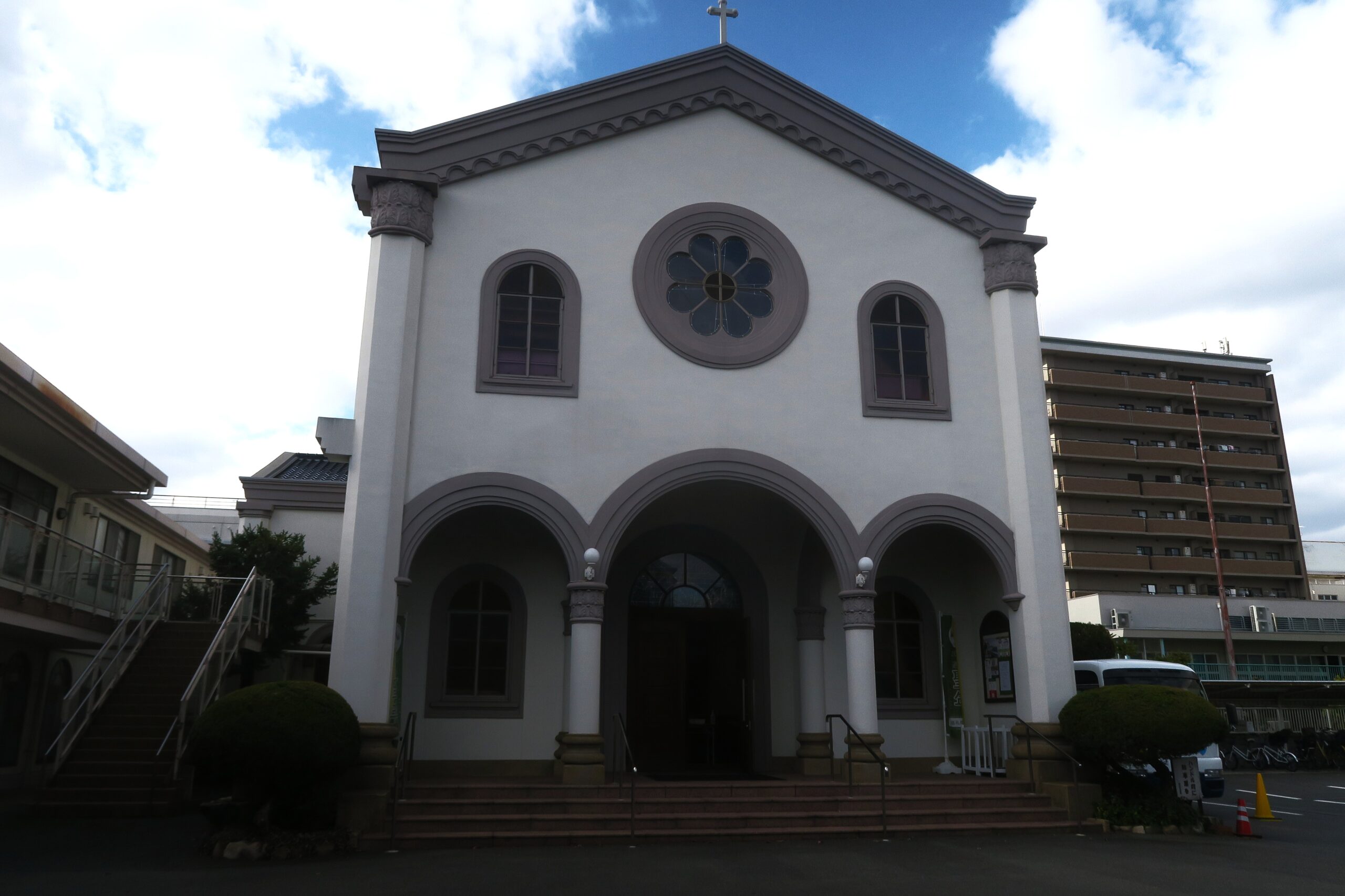 JR高槻駅から高槻センター街を抜け阪急高槻市駅から南にあるくこと約12分、高槻城に向かいます。北大手門跡をすぎるとカトリック高槻教会があります。キリシタン大名・高山右近ゆかりのカトリック教会で、高山右近記念聖堂として知られ、高山右近臨終の地、、マニラ郊外のアンティポロにある聖母大聖堂をモデルにして昭和37年(1962)に建てられました。