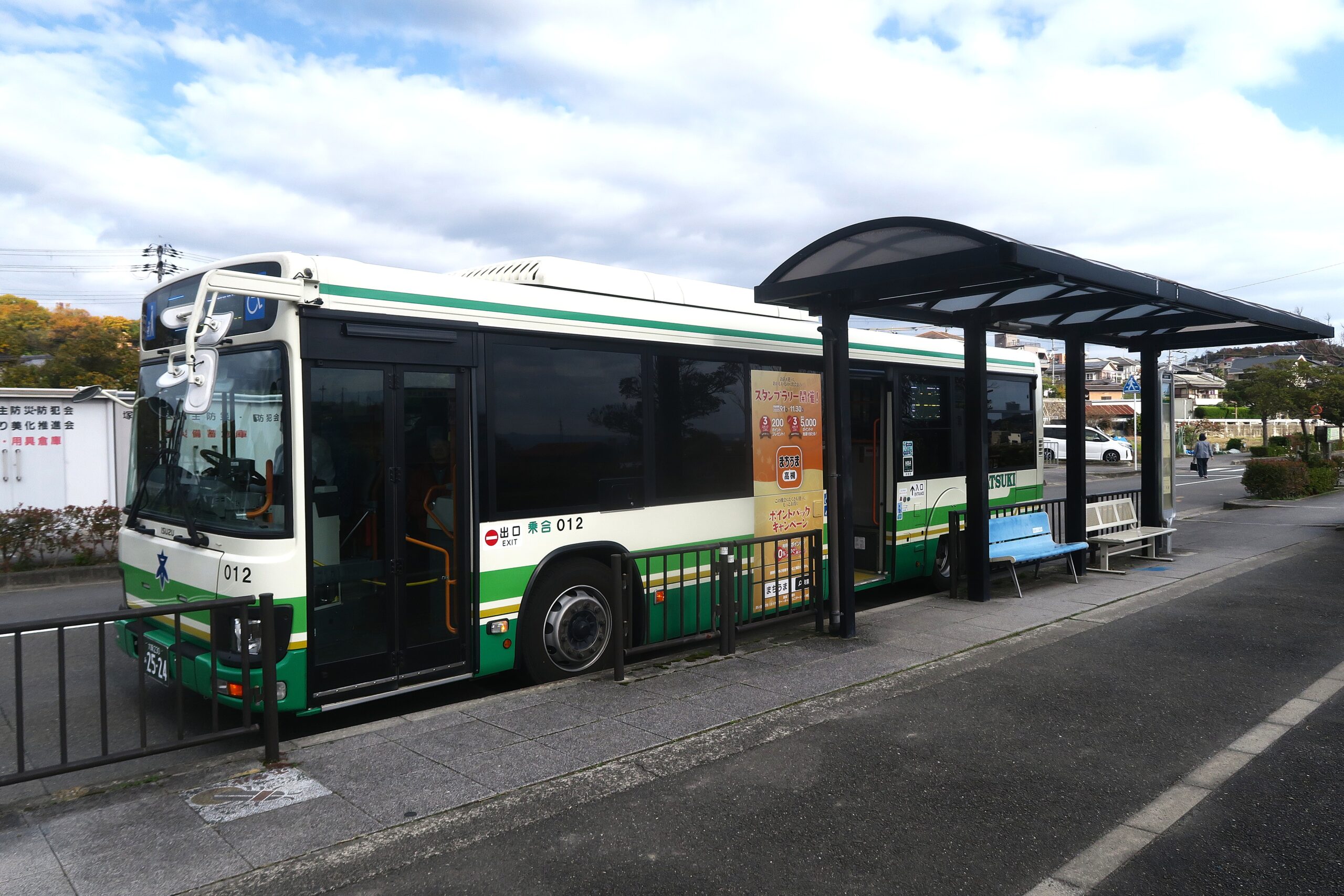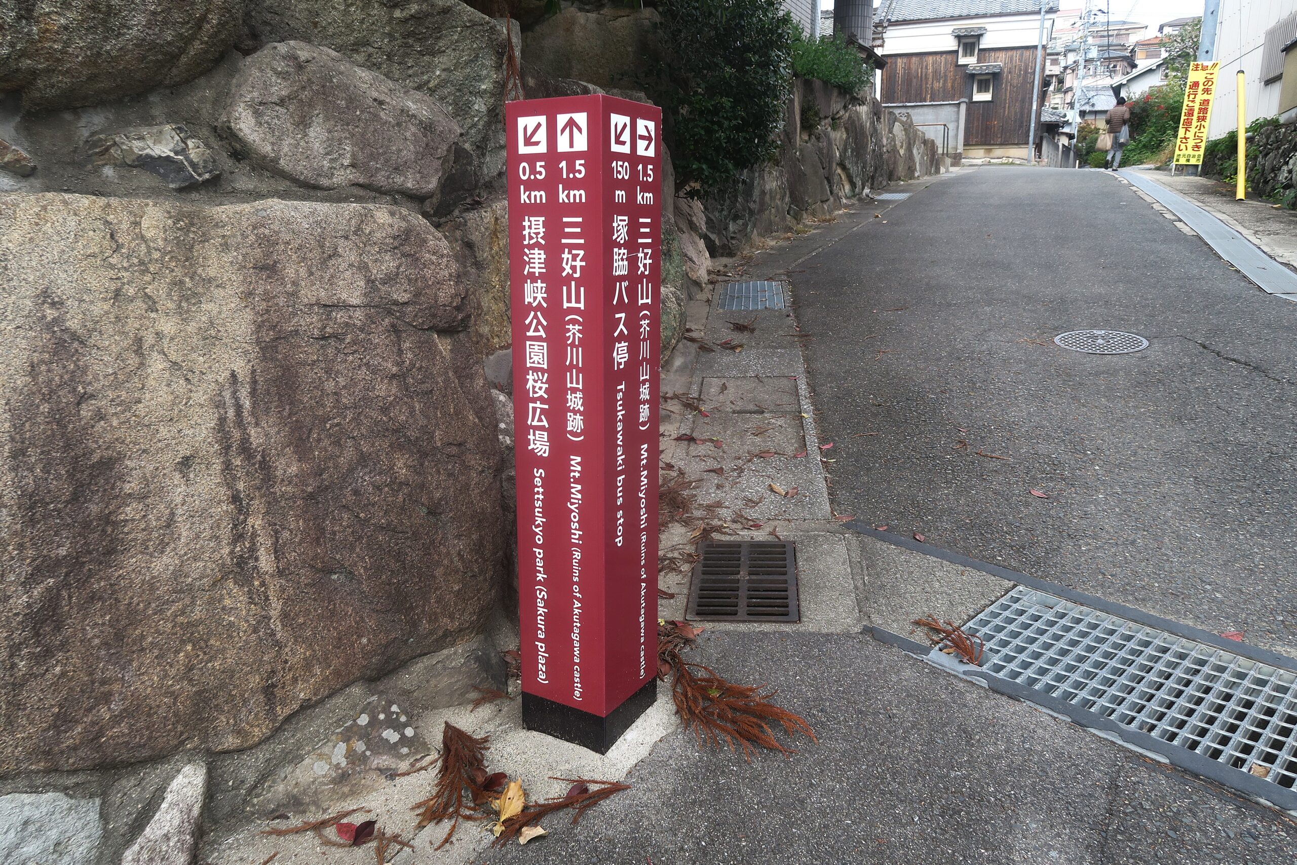 最寄りの交通アクセスはJR高槻駅北側バスロータリー北2から市バスで約15分、摂津峡大通りにある塚脇バス停で下車します。バス停近くには、芥川城の復元図やアクセスルートが書かれた素晴らしい看板があります。車の場合は摂津峡公園近くの下の口駐車場に停めてバス停まで10分戻ります。