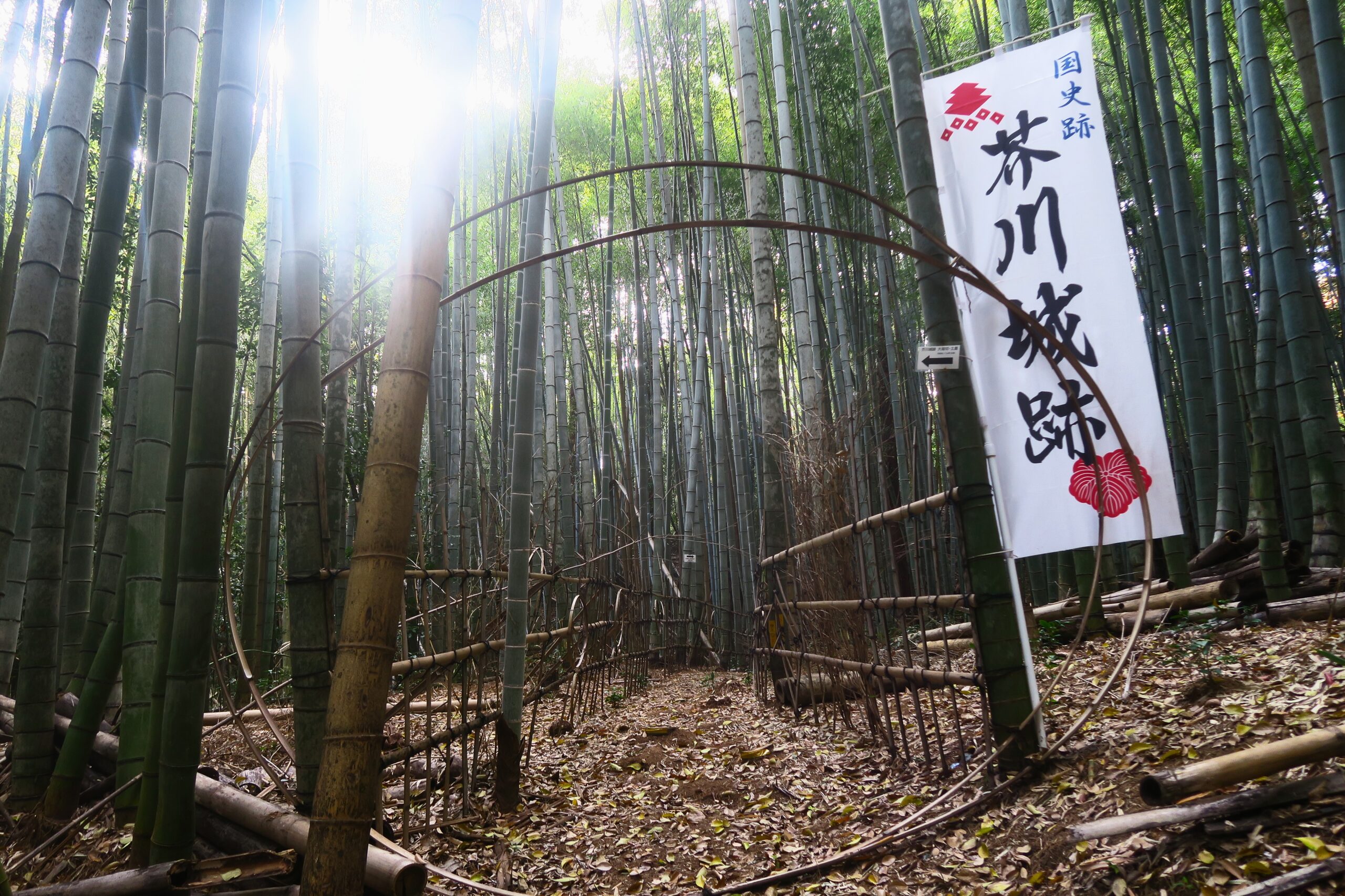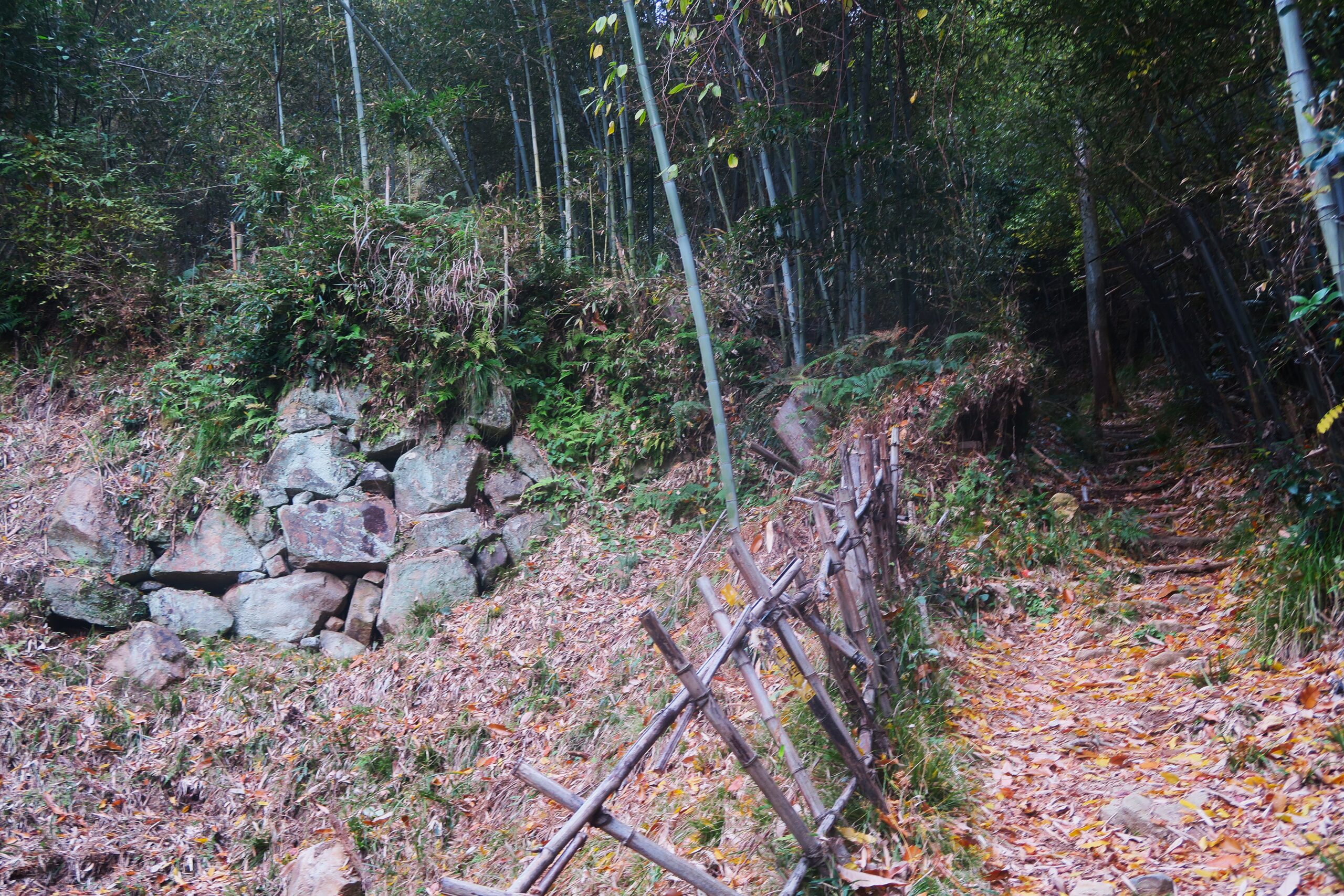 途中猪除けの柵のところで、大手道と田ノ丸ルートに分かれますが、ここから大手道は急登で険しく、田ノ丸ルートは竹林の中を遊歩道がよく整備されています。また途中堀切も見れることから田ノ丸ルートを選択します。