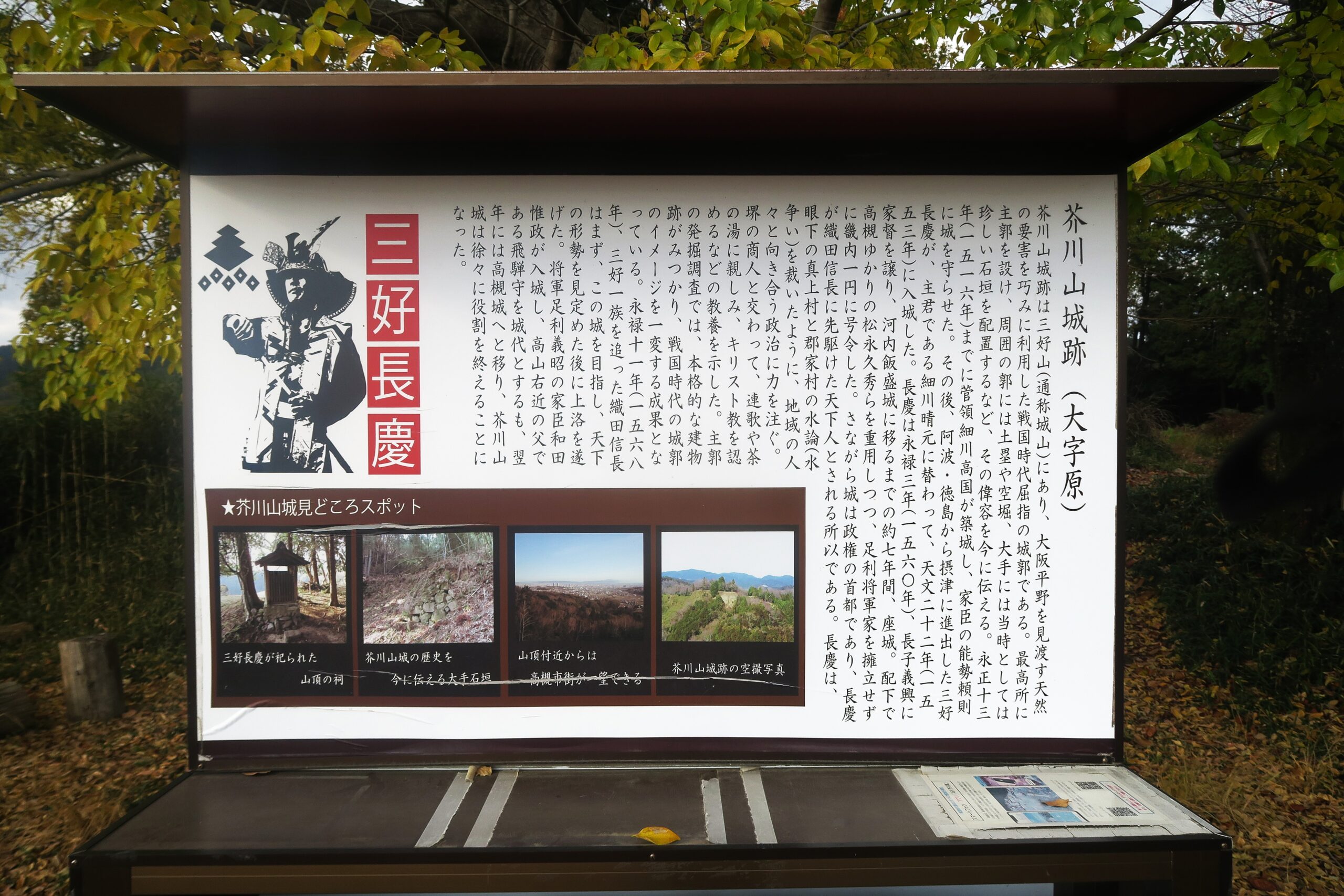 主郭部には三好長慶の看板が立ち、かつて三好長慶や当時配下だった松永久秀などがこの場所に立ち、畿内一円に号令を発していたことを思い浮かべながら大坂平野を一望します。芥川城は京都と貿易港・堺を結ぶ中間点に位置し、政治と経済を一度の掌握できる、まさしく天下人にふさわしい拠点でした。