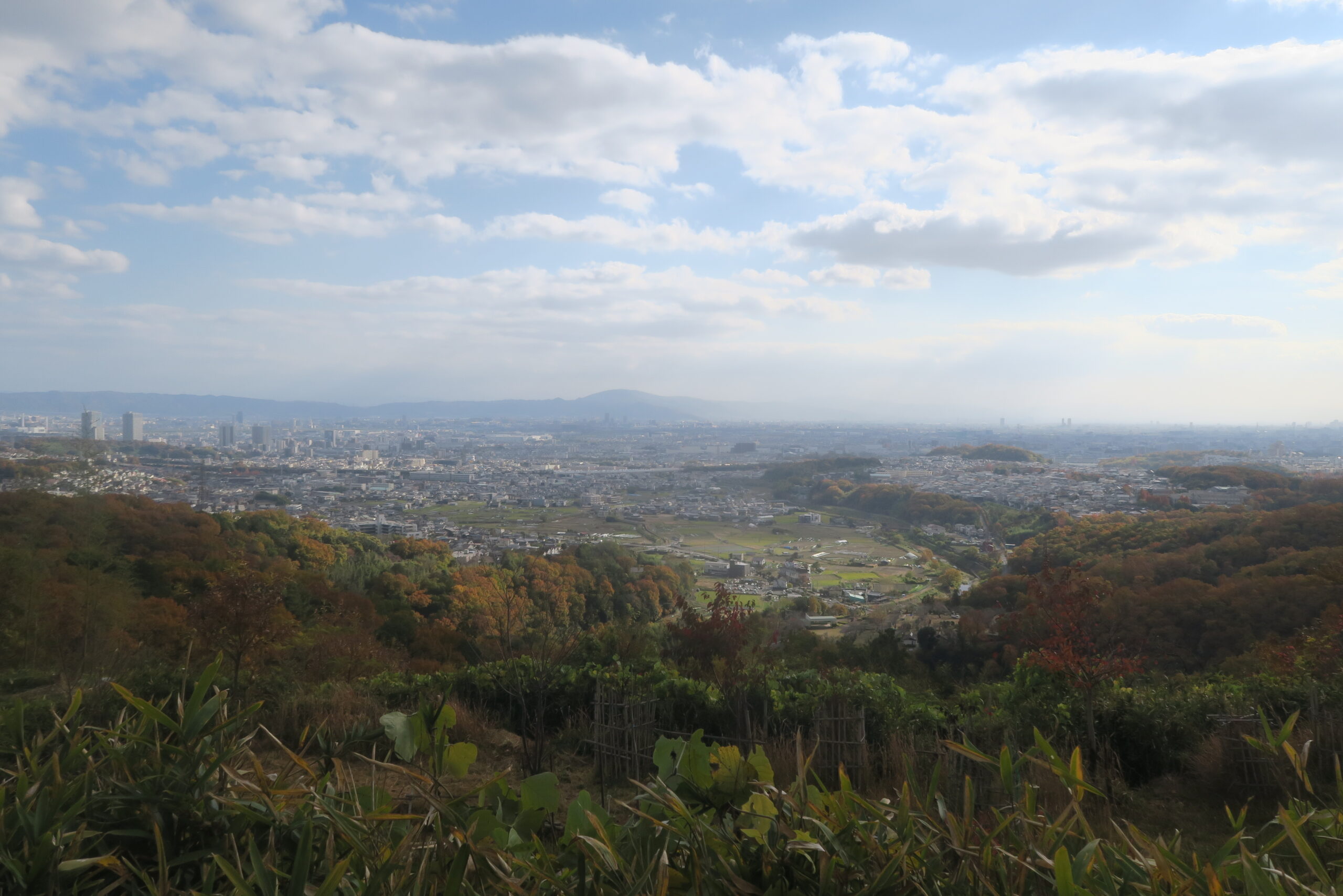 15分ほどで展望スポットに到着します。丸太で作った手作りの椅子が並べられていて、休憩に丁度よい場所です。正面に生駒山を望み、手前に飯森山城跡があります。中央に淀川、その手前を京都から西日本をつなぐ西国街道が横切っています。手前から生駒山に向かって淀川と合流する芥川が見えます。ここは頂上ではなく、この先を上ったところが頂上です。