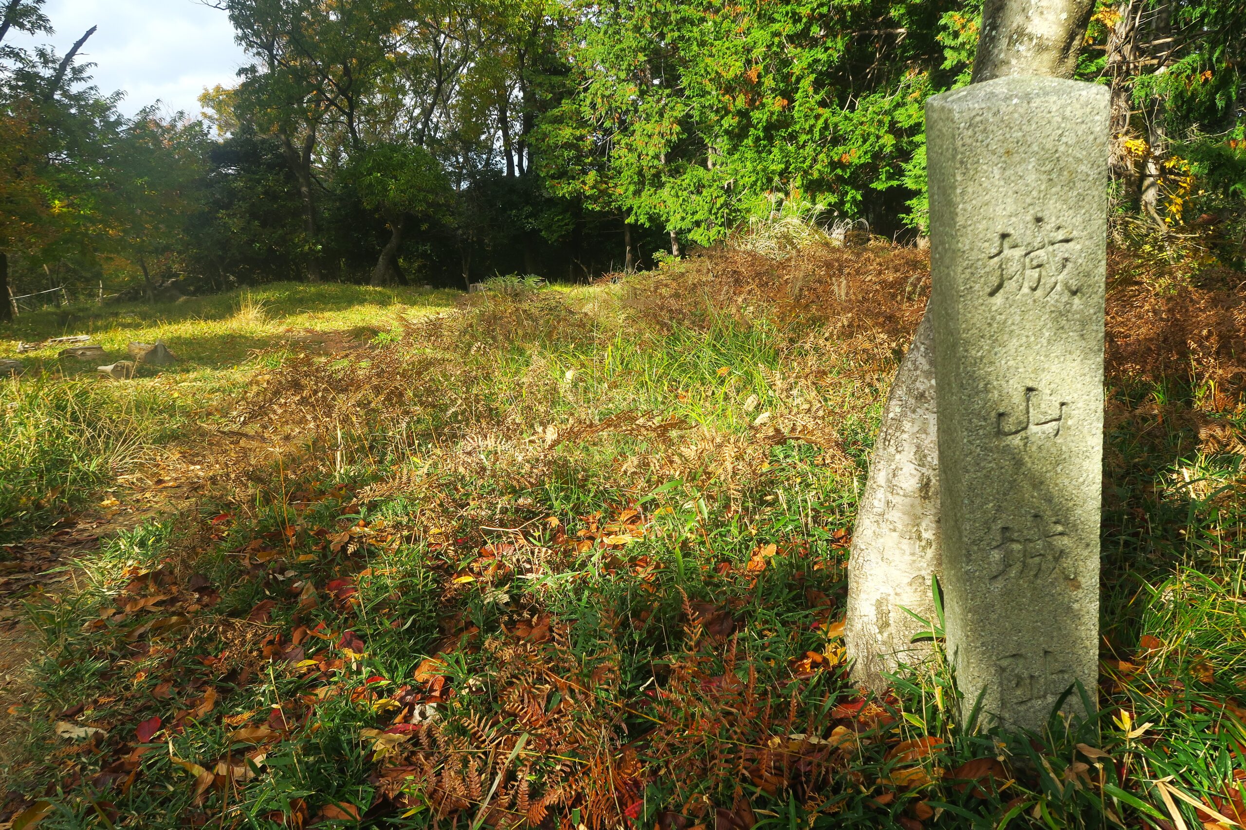 展望スポットから約5分、頂上付近は少し広場になっていて「城山城址」という標柱が建っています。当時の文献には芥川城とあり、高槻市の平野部にも同名の城が存在することから便宜上ことらうぃ「芥川山城」と呼称しています。最高所となる西曲輪群が城の中心です。