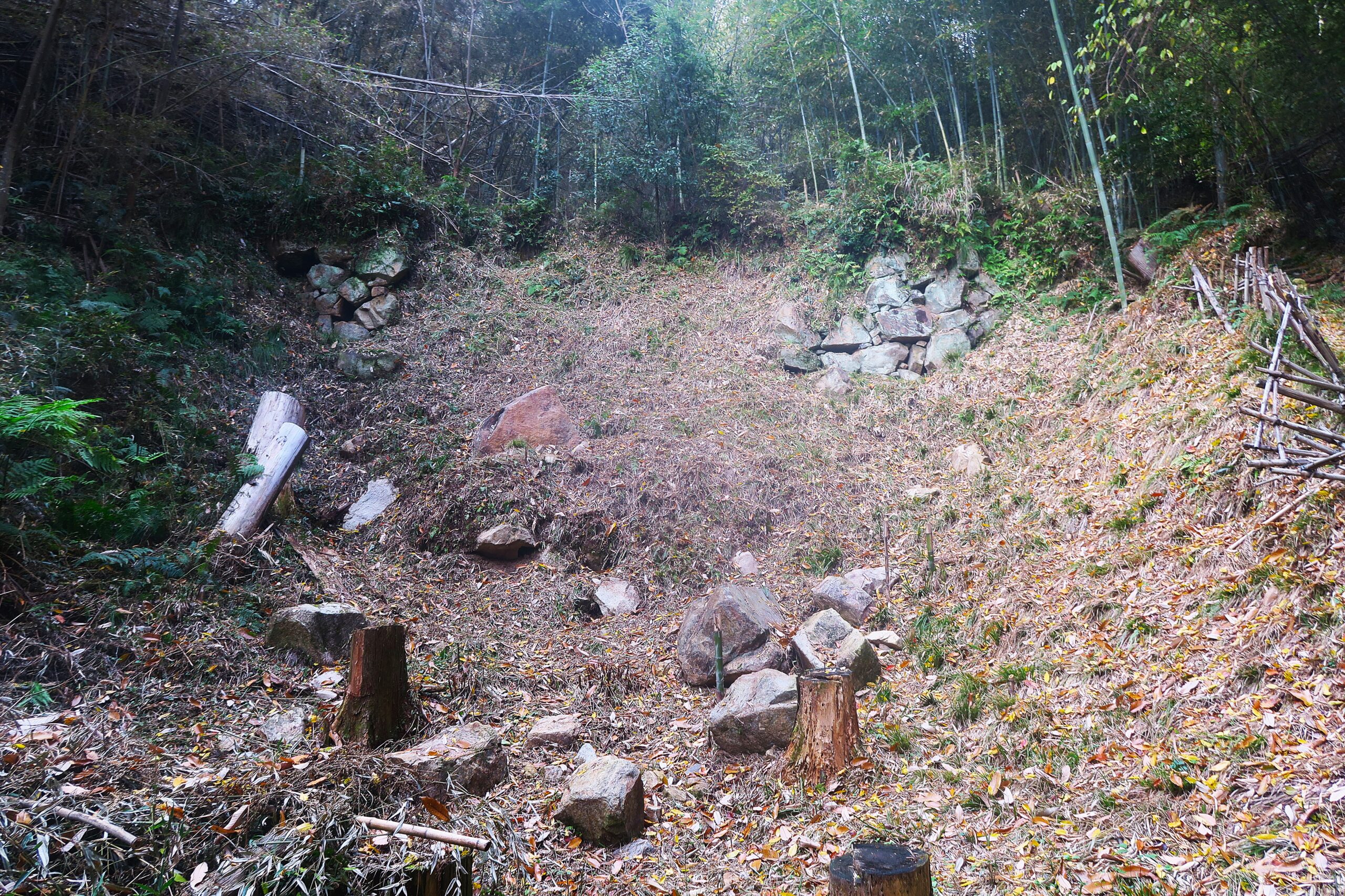 戦国初期の山城で石垣が造られるのはまだ珍しく、先駆的な大手門石垣は、現在は中央が崩れていますが、本来は谷を塞ぐように一直線に石垣が積まれ、長さは約12m、高さも3m以上あったと思われ、その荒々しく迫力のある姿に圧倒されます。まだ石垣が城郭に用いられるようになるのは織田信長が小牧城や安土城を築いた以降だとされ、三好長慶は天下人にふさわしい威厳を城の顔ともいうべき大手門で見せつけたのではなでしょうか。