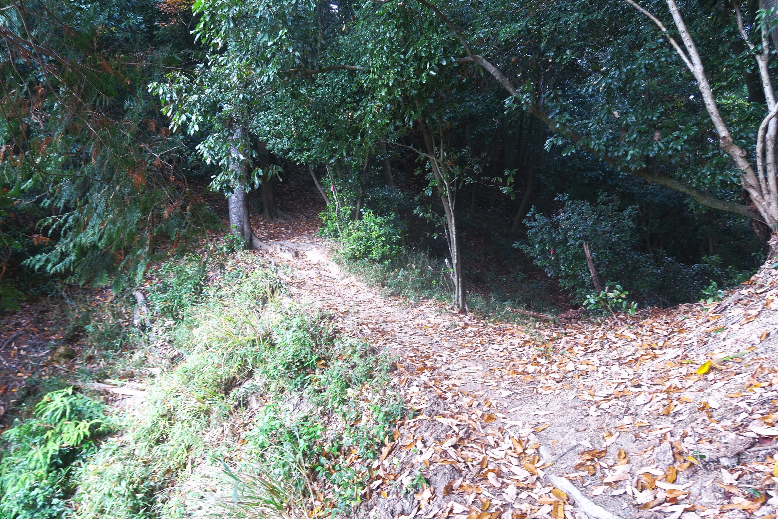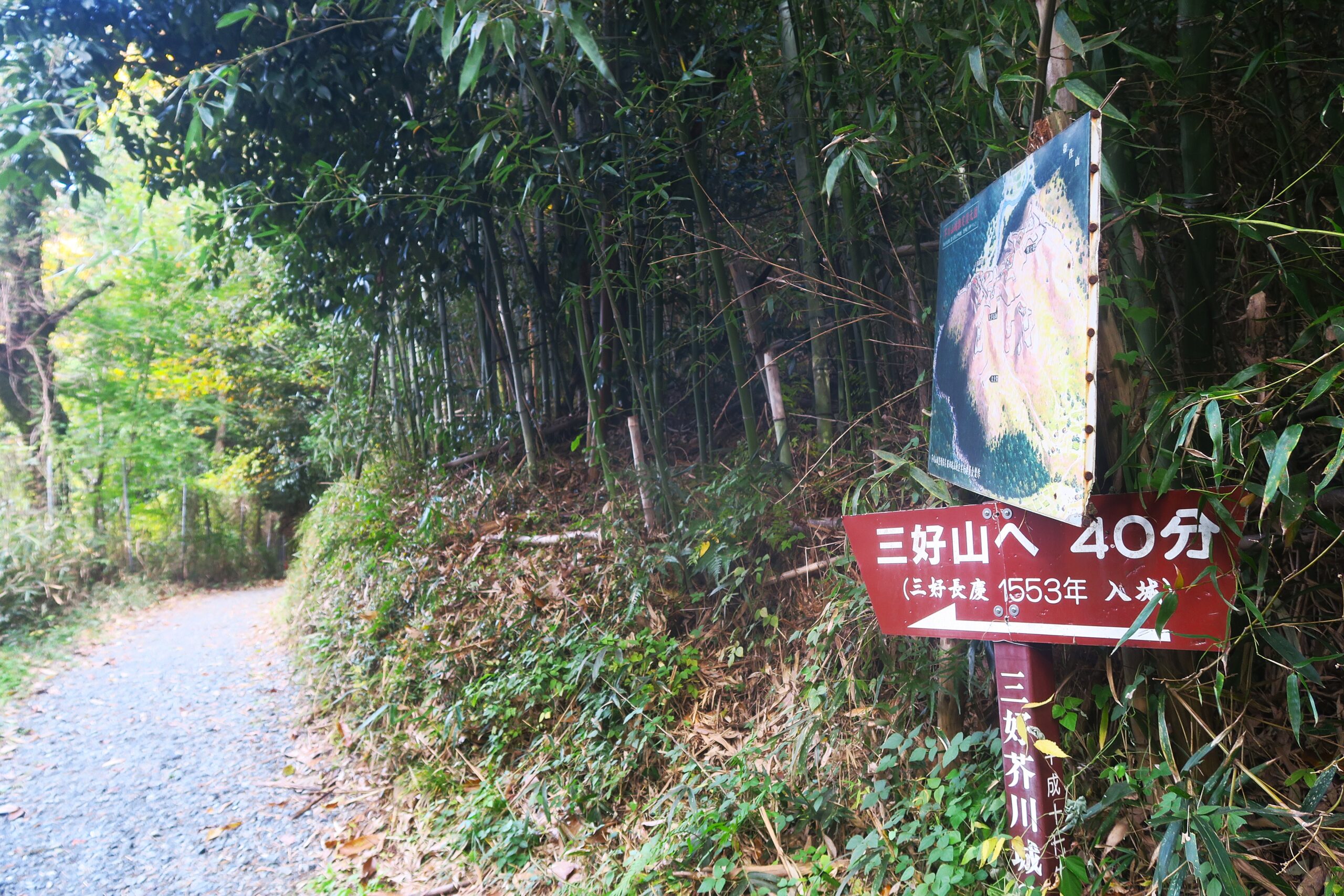 塚脇バス停から住宅街の中を通って15分で田ノ丸ルートと塚脇ルートのY字分岐に到着します。写真が右手側道の東側から回り込む塚脇ルートですが、今回は左本道の大手道・田ノ丸ルートで上ります。案内板には三好山と書かれていますが芥川城と書かれていても同じです。