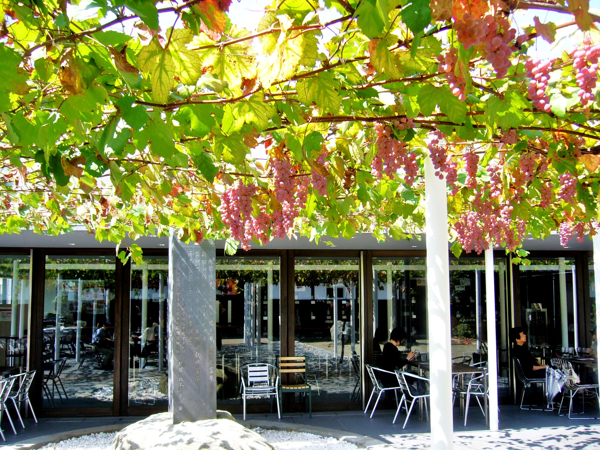 ショップに隣接するテラスからは目に前にブドウ畑と甲府盆地、富士山を一望できます。現在は「富士見テラス」として風景を楽しむ「ビューエリア」、ゆっくりくつろぐ「リラックスエリア」、ブドウ畑を散策できる「ファームエリア」に分かれています。