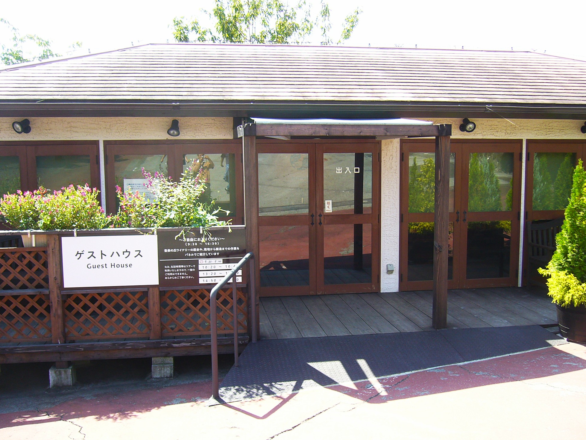 緑に囲まれた中に茶色の屋根の白い建物「ゲストハウス」についたら笑顔のスタッフが出迎えてくれます。受付をすまして、集合待合室に入ったら「登美の丘ツアー」スタートです。レセプションを受けた後、バスで富士山や甲府盆地が一望できるブドウ畑へ。