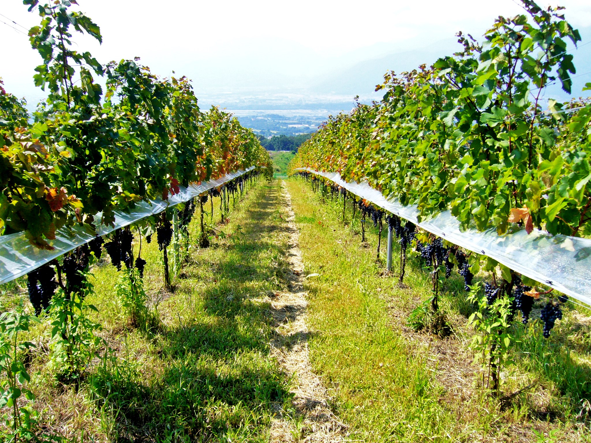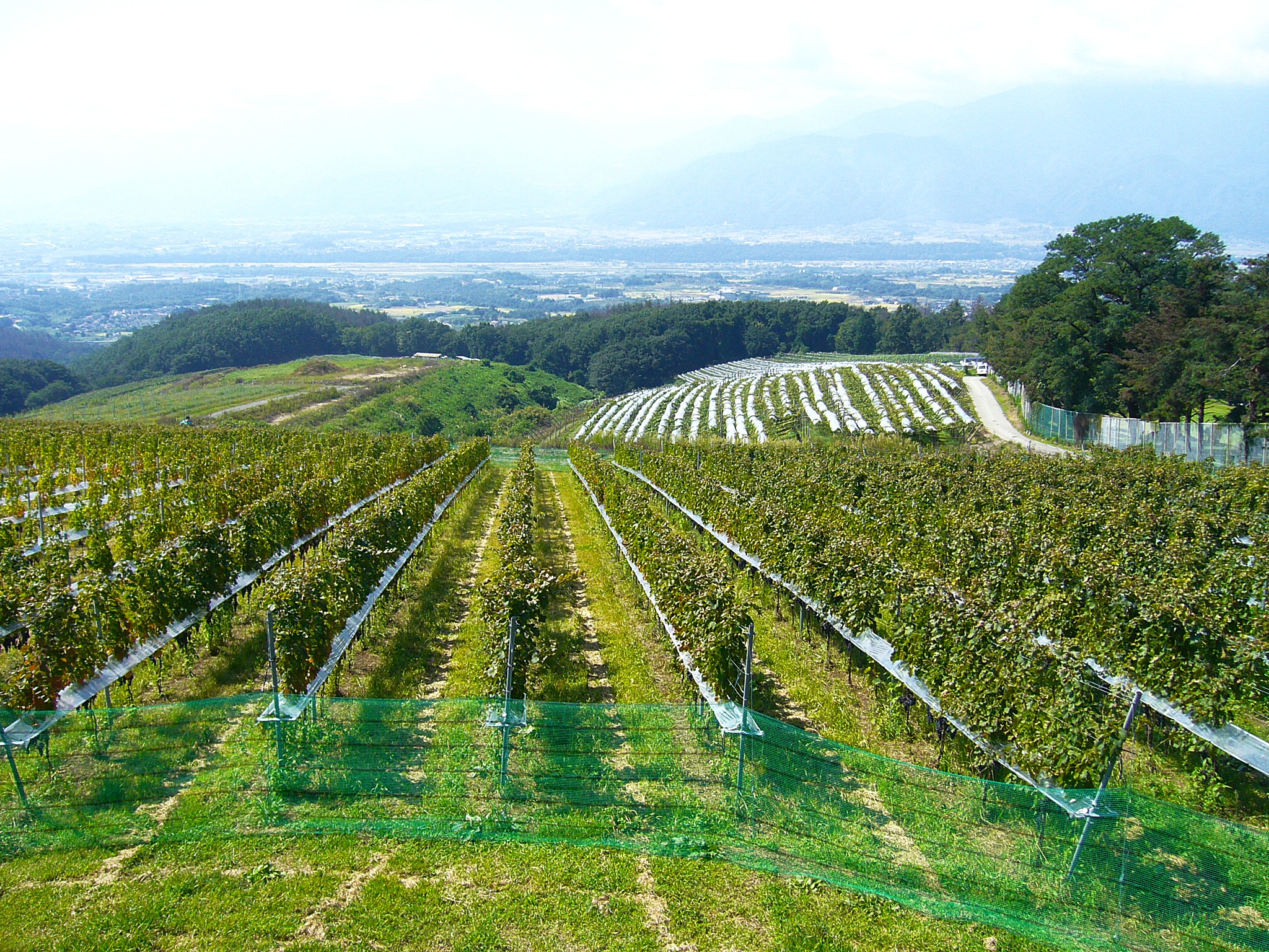 総面積150haの明治期に開拓された登美高原は、今や山梨県屈指の大規模ワイナリーです。ワイン用ブドウの生育には、雨は少なく、日当たり良好で、1日の寒暖差が大きい気候が適しているといます。その点登美の丘は、富士山、南アルプス、甲斐駒ケ岳、八ヶ岳連峰の山々に囲まれているこちから雨雲がかかることが少ない。さらに甲府盆地に面した標高400mから600mのボルドーの地にも似た日当たりのよい明るい南傾斜地は、「見晴らし台園」「萌黄台園」など10以上の畑に細かく分けられ、その土地や水はけ、日照時間などにあったブドウが植えられています。秋の収穫期の昼夜の寒暖差が10℃以上になる日が多く、ブドウの成熟の度合を高めてくれます。まさしく登美の丘はワイン用ブドウの栽培に最適の土地なのです。成熟し糖度が十分になったころの収穫間近のブドウ畑には、そのまま食べておいしそうなブドウがずらり、高台もあり写真撮影には最高のロケーションです。