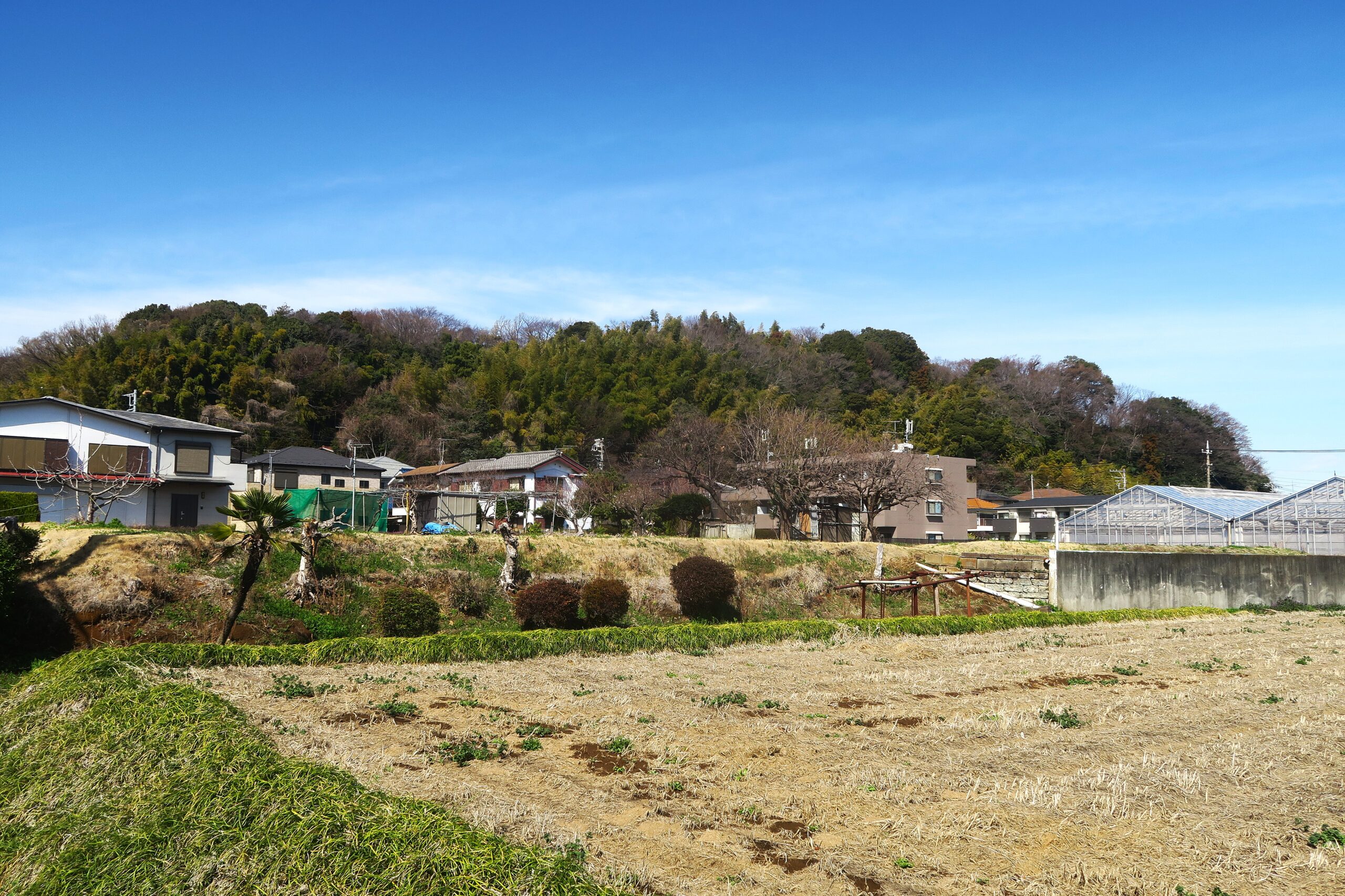 徒歩で北西に約800m、途中民家や畑の遠方に小高い丘を望みながら約10分ほどで小机城址入口に到着します。小机城の築城時期は定かではないが、永享の乱(1438~1439)の頃に関東管領上杉氏によって南武蔵の軍事拠点として築城されたとされています。小机城は別名根古屋城(城山の裾野の古い地名)とも言われ、城山と呼ばれる城のある丘陵は、北・西・東の三方を鶴見川に囲まれ、鶴見川右岸の湿地帯に突き出た標高45m比高22m程の丘で、周囲の展望に優れた要害の地となっていました。またかつて飯田道といわれた神奈川湊から小机・下菅田を通る陸路と、当時舟着き場のあった鶴見川の水路の合流地点が小机であったことから交通の要衝でもありました。