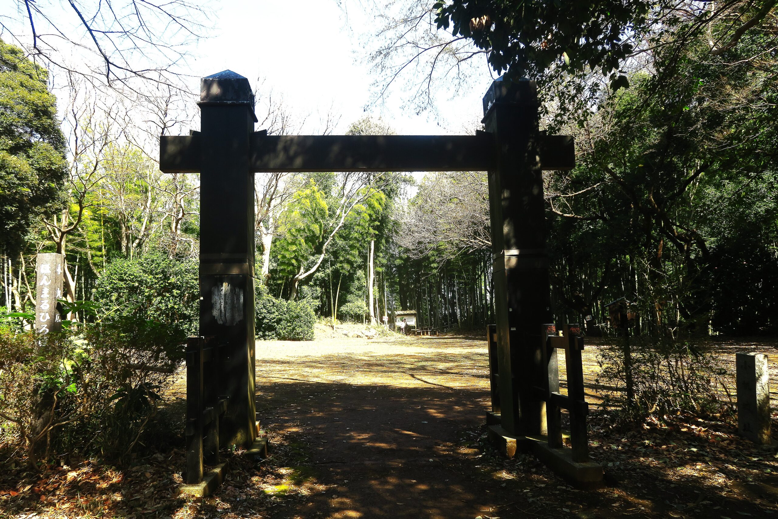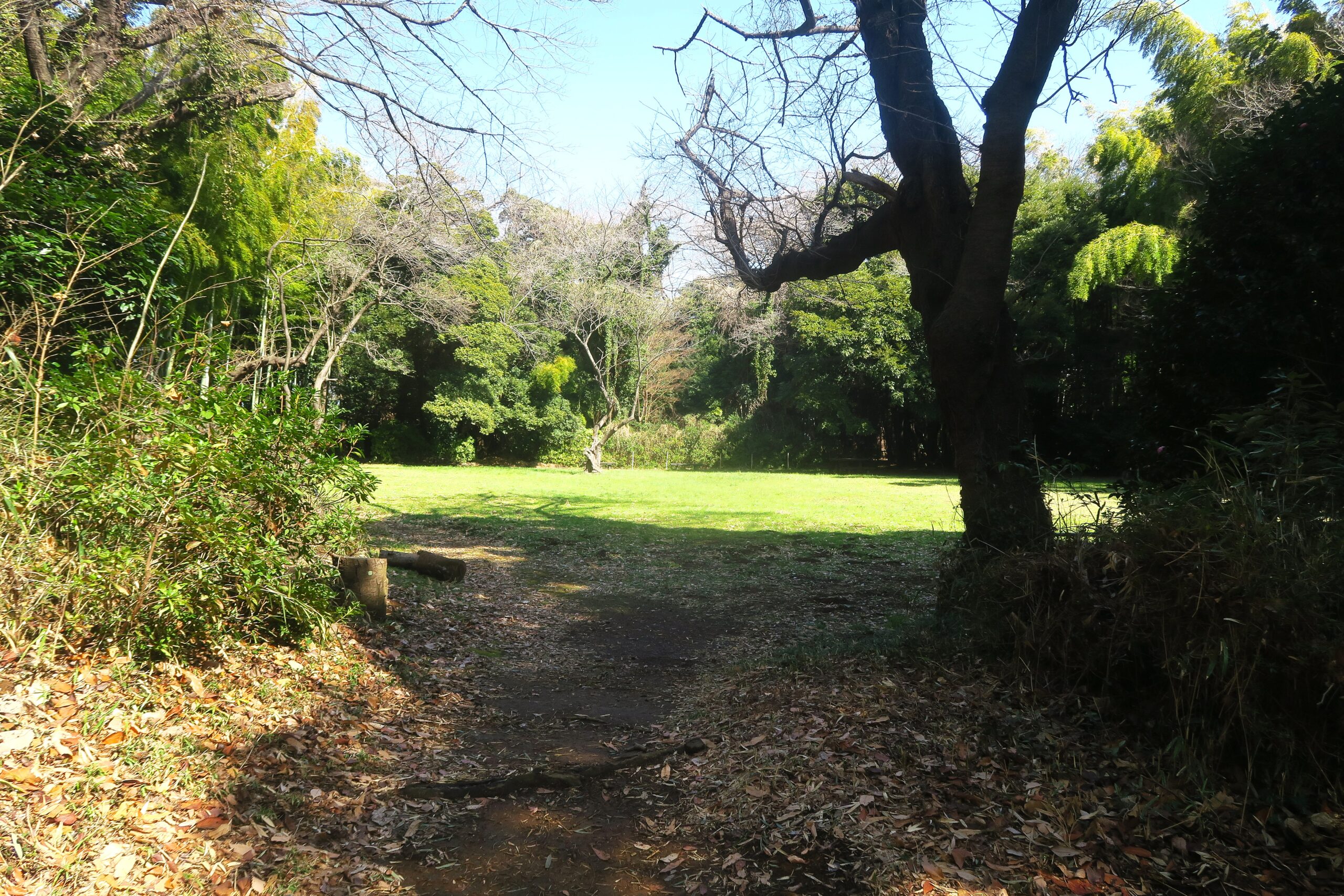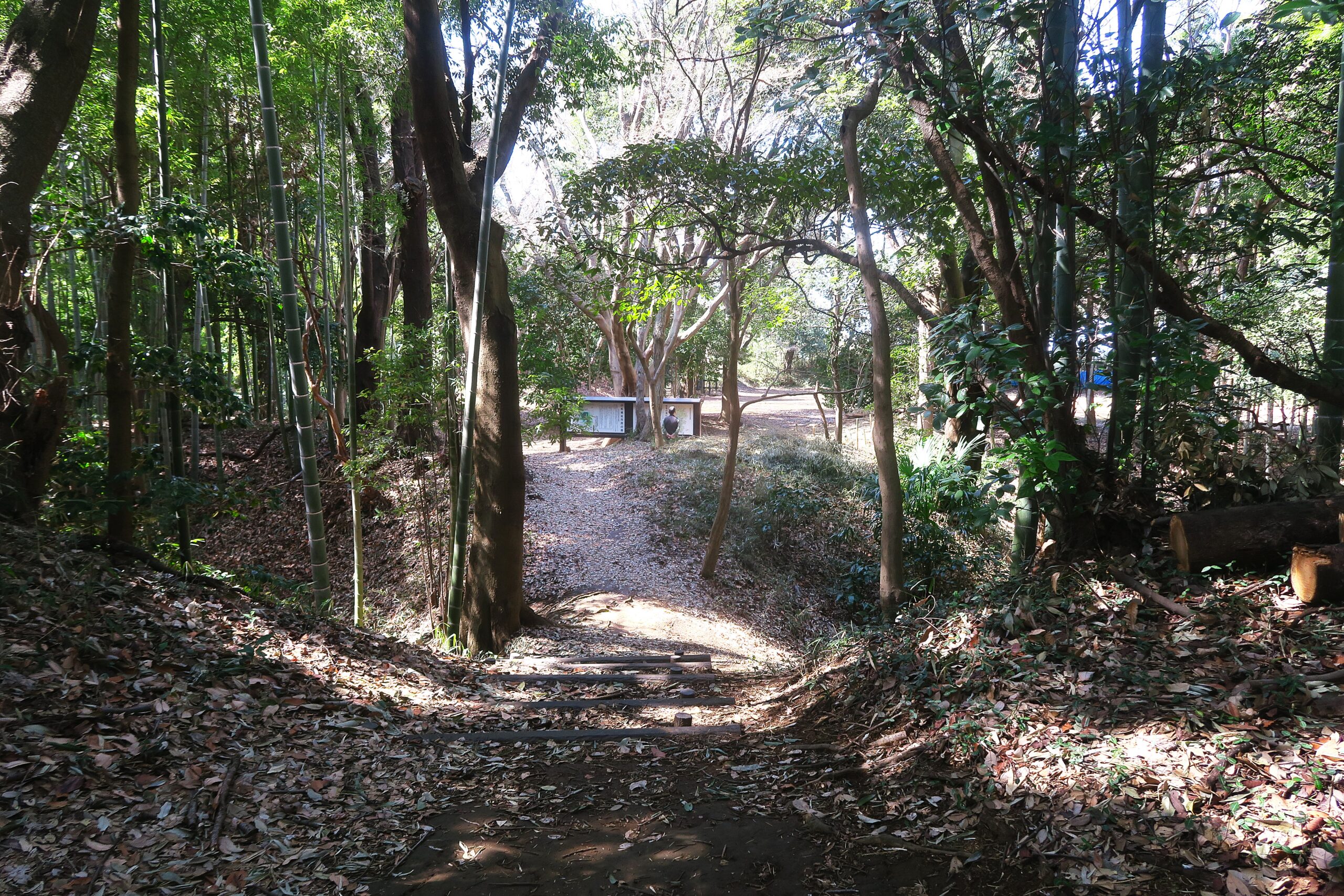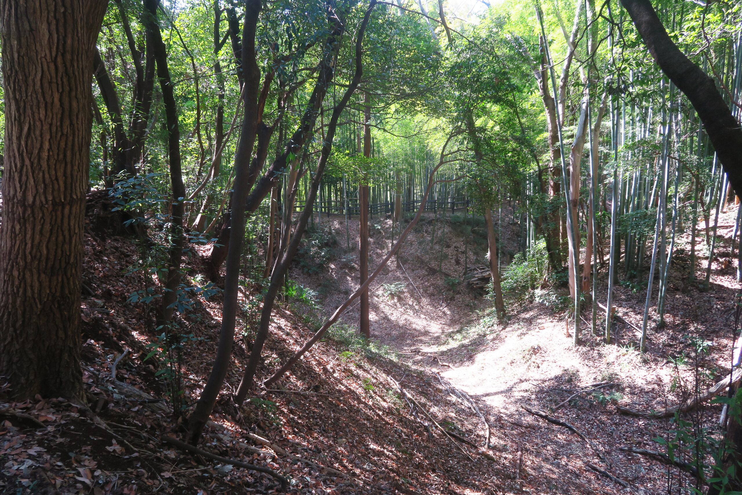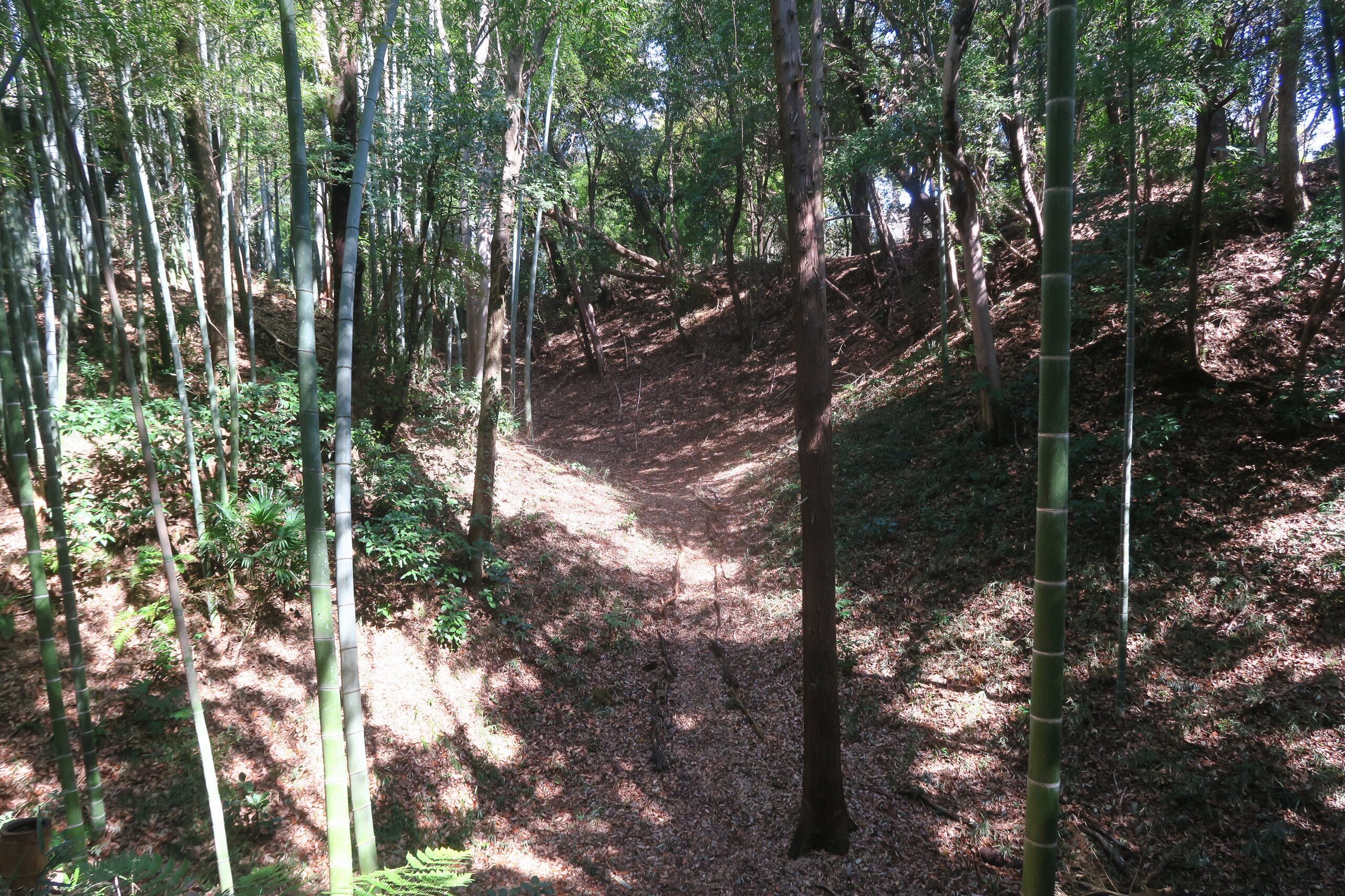 突き当りをまずは右手にとり東郭を目指します。竹林の間を進みますが両側を進みますが、左手を覗き見ると空堀が見えます。小机城はこのような迫力ある巨大な空堀の遺構が随所に残る平山城です。